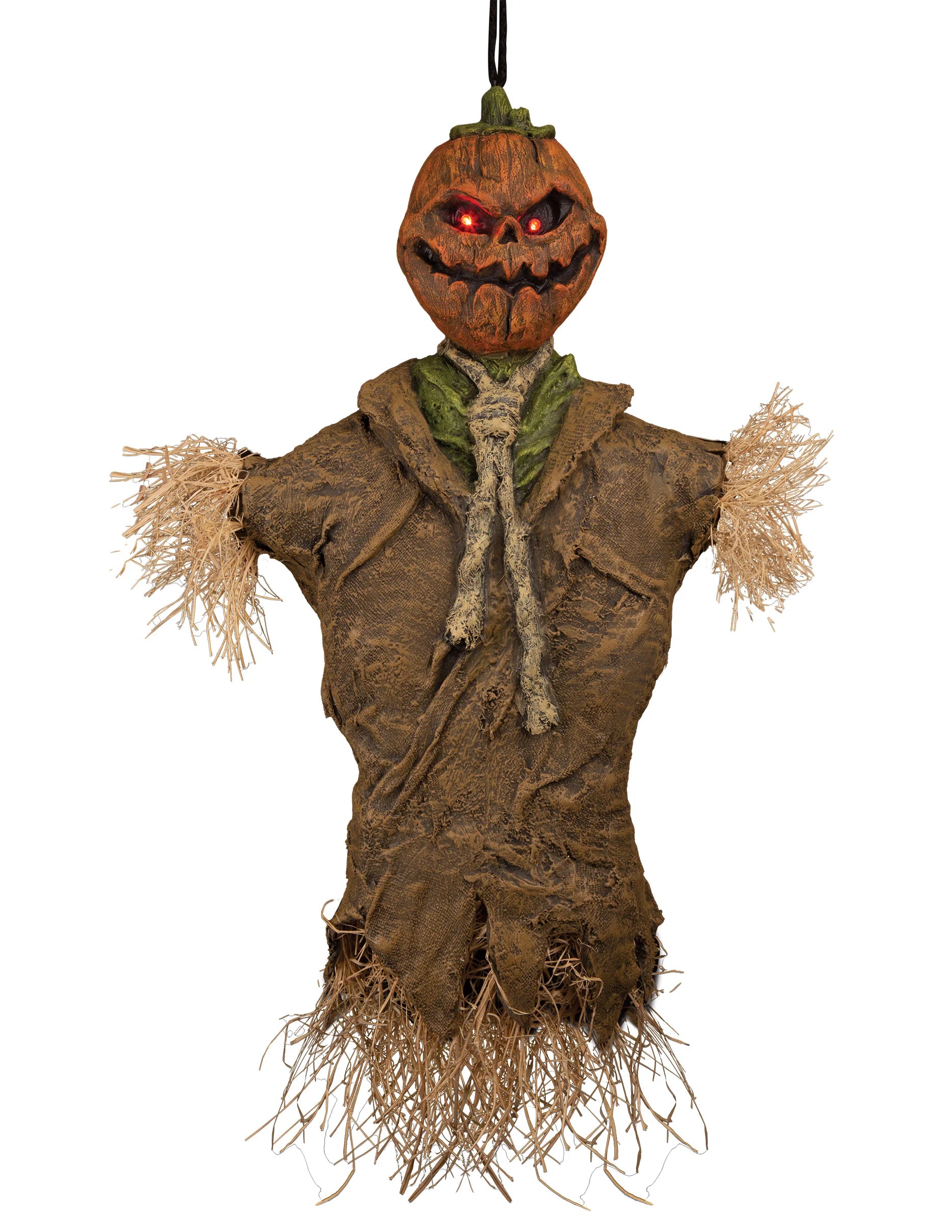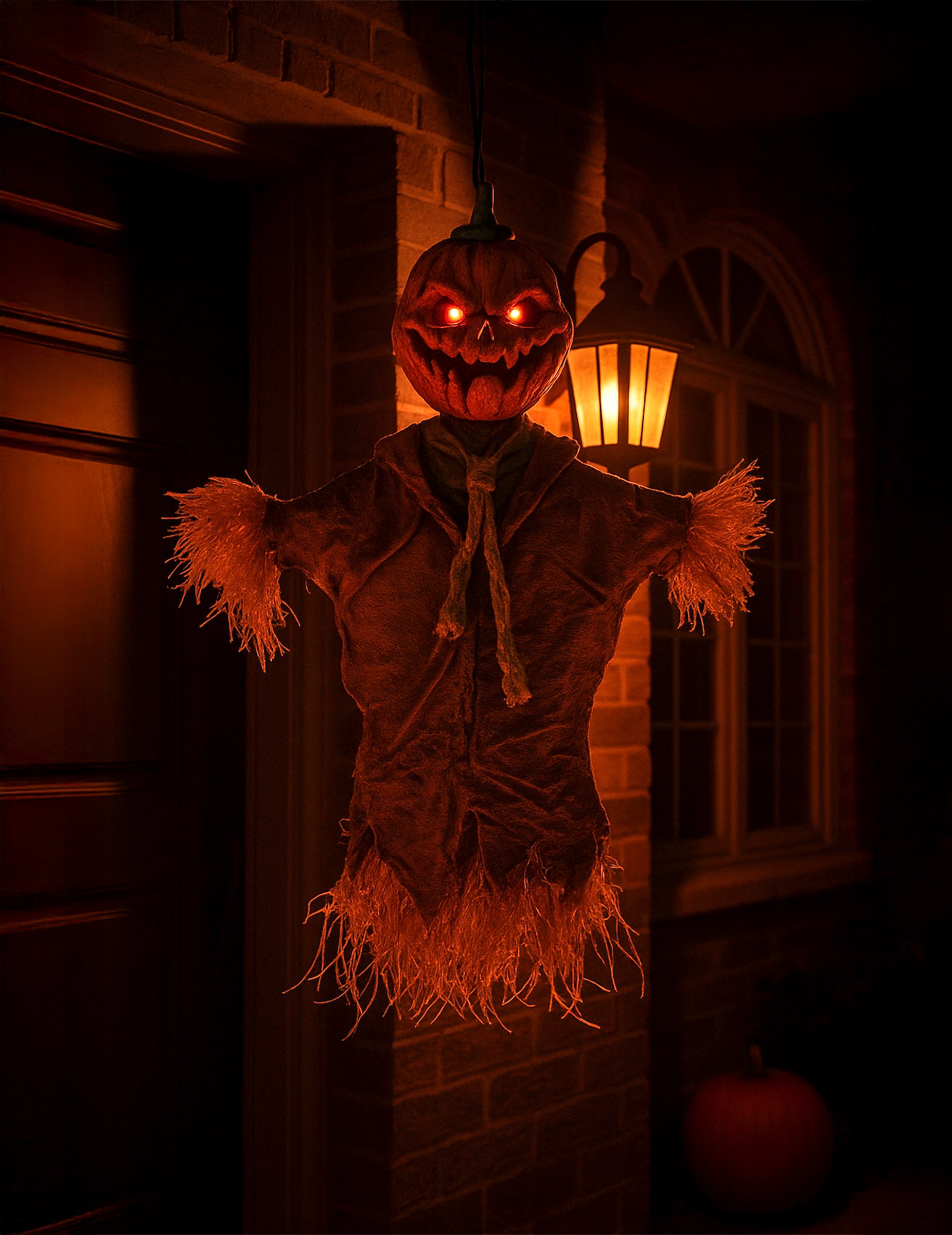Ovaj viseći ukras mjeri 10 x 32 x 54 cm. Predstavlja strašilo s glavom bundeve i zastrašujućim crvenim očima. Dajte svojoj sobi zastrašujući izgled s ovim ukrasom za Noć vještica!