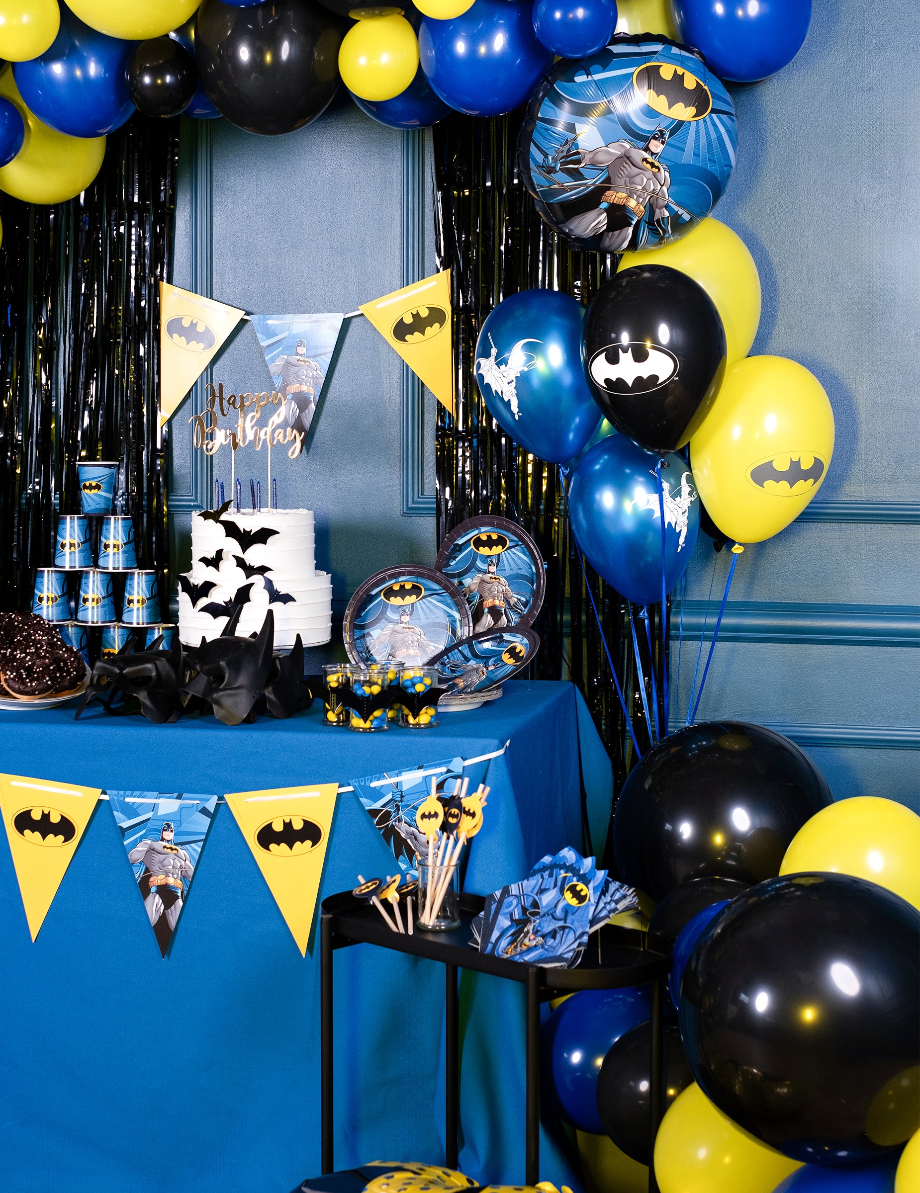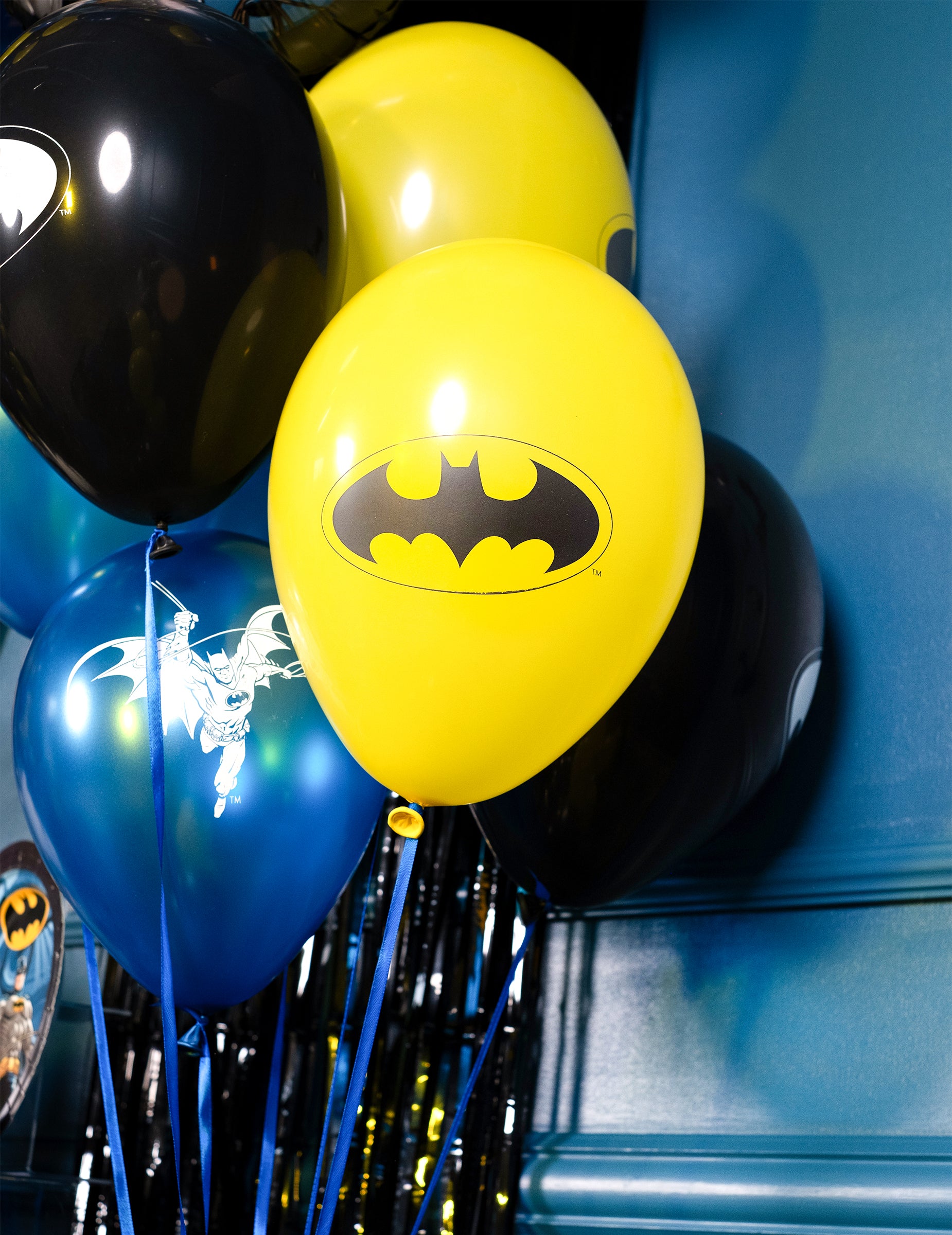Ovi baloni od 25x32cm lateks su pod službenom Batmanovom licencom. Prodaje ih serija od 10: - 4 žute kuglice s logotipom Batmana u crnoj boji - 3 crne kuglice s logotipom Batman u bijeloj boji - 3 plave metalne plave kuglice s tiskom Batmana u bijelo slama. Za vašu Batmanovu tematsku zabavu, oni će vam omogućiti da imate cjeloviti ukras!