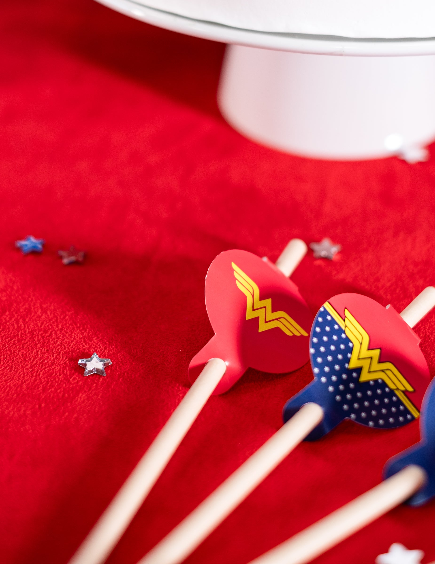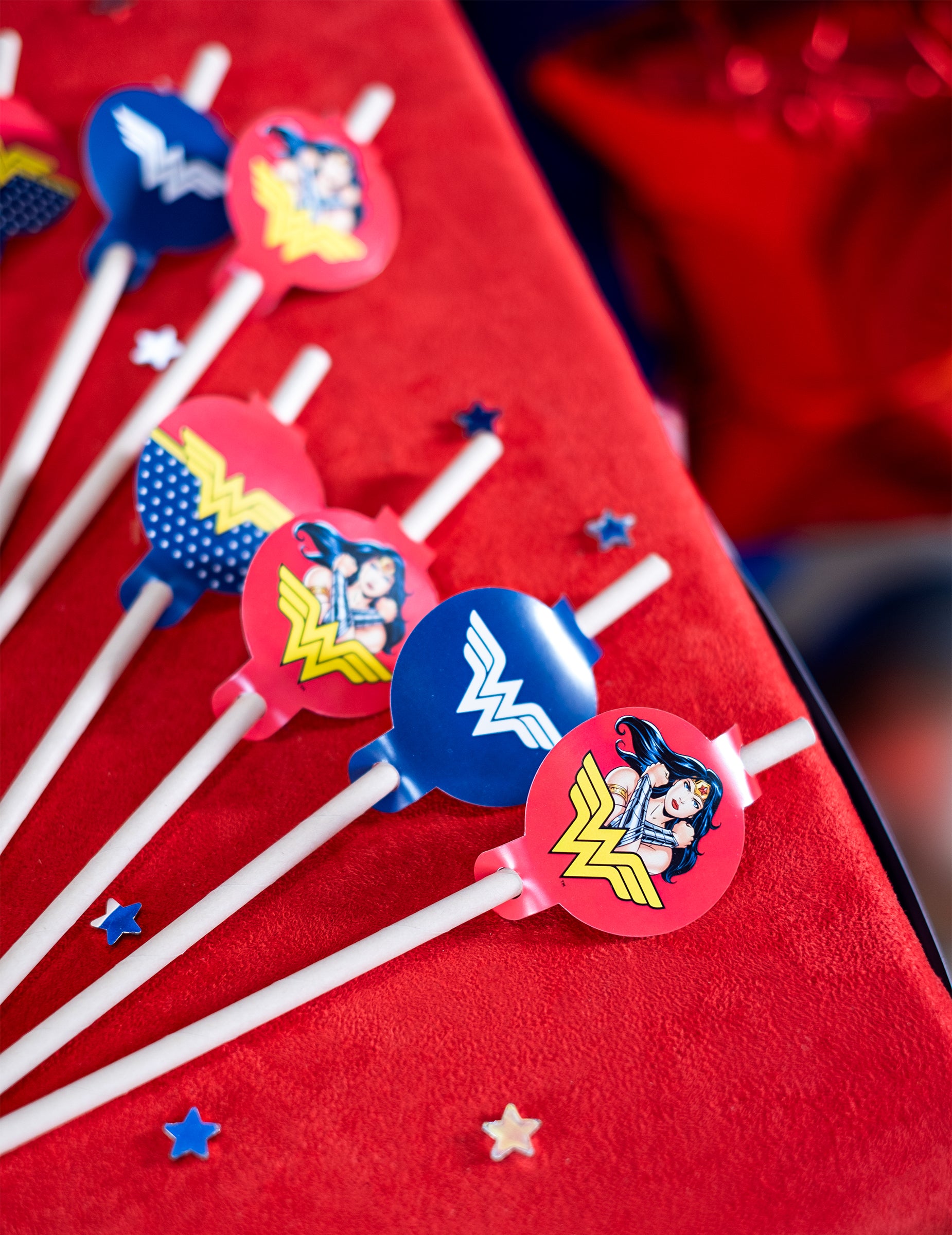 Ova puno službene licence Wonder Woman ima 8 kartonskih slamki ukrašenih kartonskom medaljom i duljine 20 cm. Medaljoni predstavljaju Wonder Woman i njegov logo na crveno i tamnoplavoj pozadini. Ove će slamke biti savršene za dovršavanje vašeg ukrasa stola za rođendan Wonder Woman!