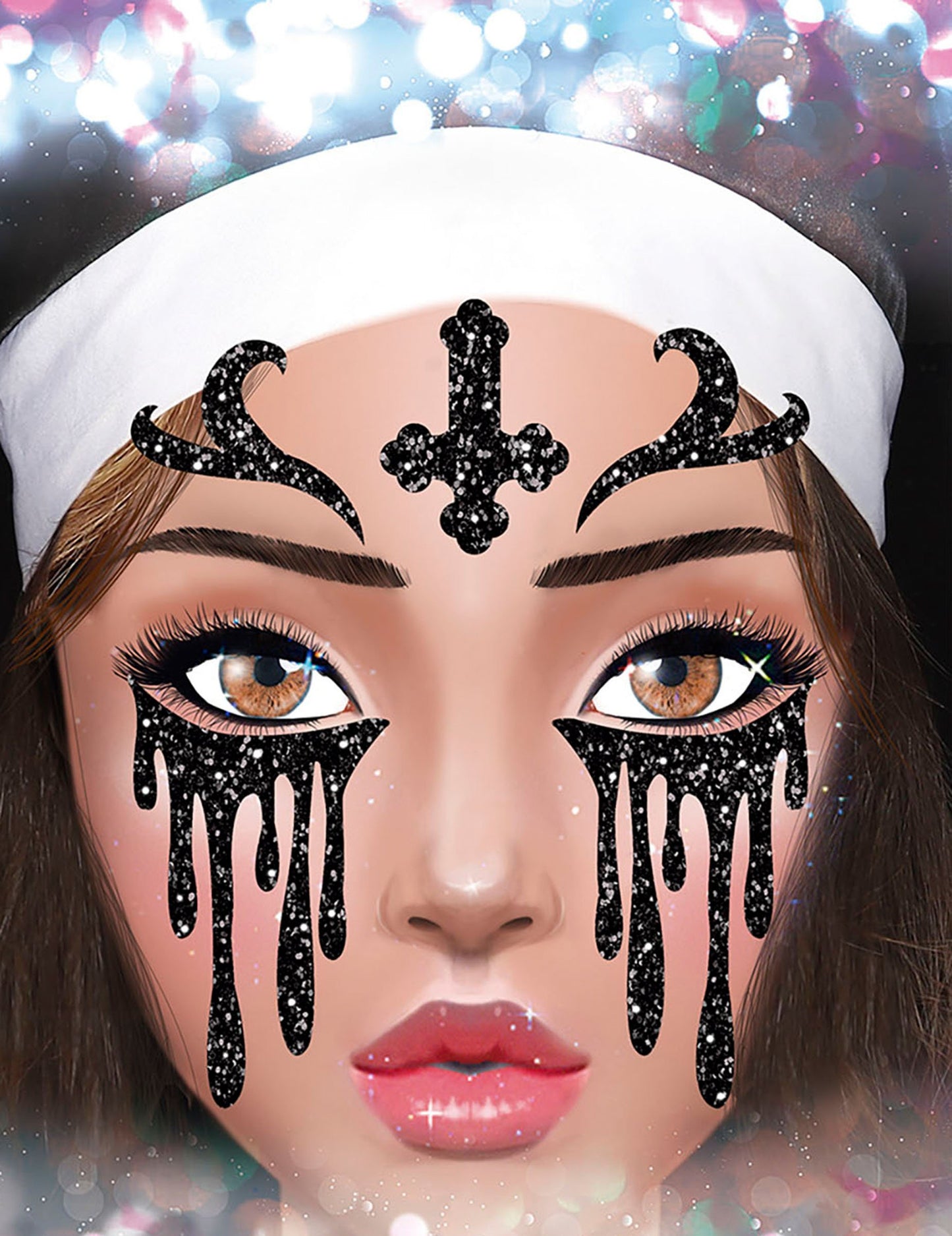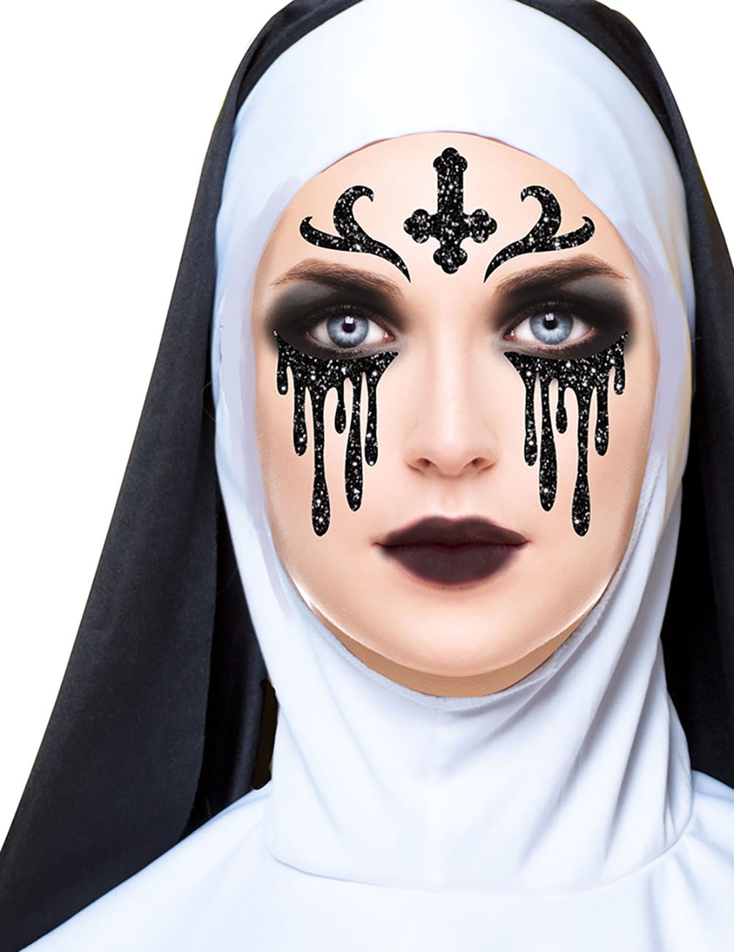 Ova tetovaža crne redovnice namijenjena je odraslima. Predstavlja suze na obrazima, kao i križ naopako na čelu. Svi su elementi crne i šljokice u boji. Ova šminka bit će savršena za dodir glamuroznog dodira vašoj odjeći za Noć vještica!