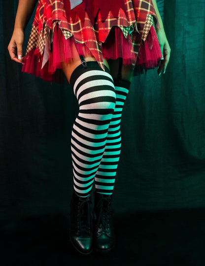 Ove velike pruge su za žene. Oni su crno -bijeli. Dolaze na koljena. Upotrijebite ih za dovršavanje kostima vještica ili za tamni izgled tijekom večeri Noći vještica!