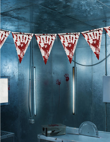 Ovaj vijenac Halloween dugačak je oko 3 m. Izrađen je od papira i sastavljen od zastavica. Oni su tiskani krvavom rukom. Stvorite zastrašujući ukras za Noć vještica!