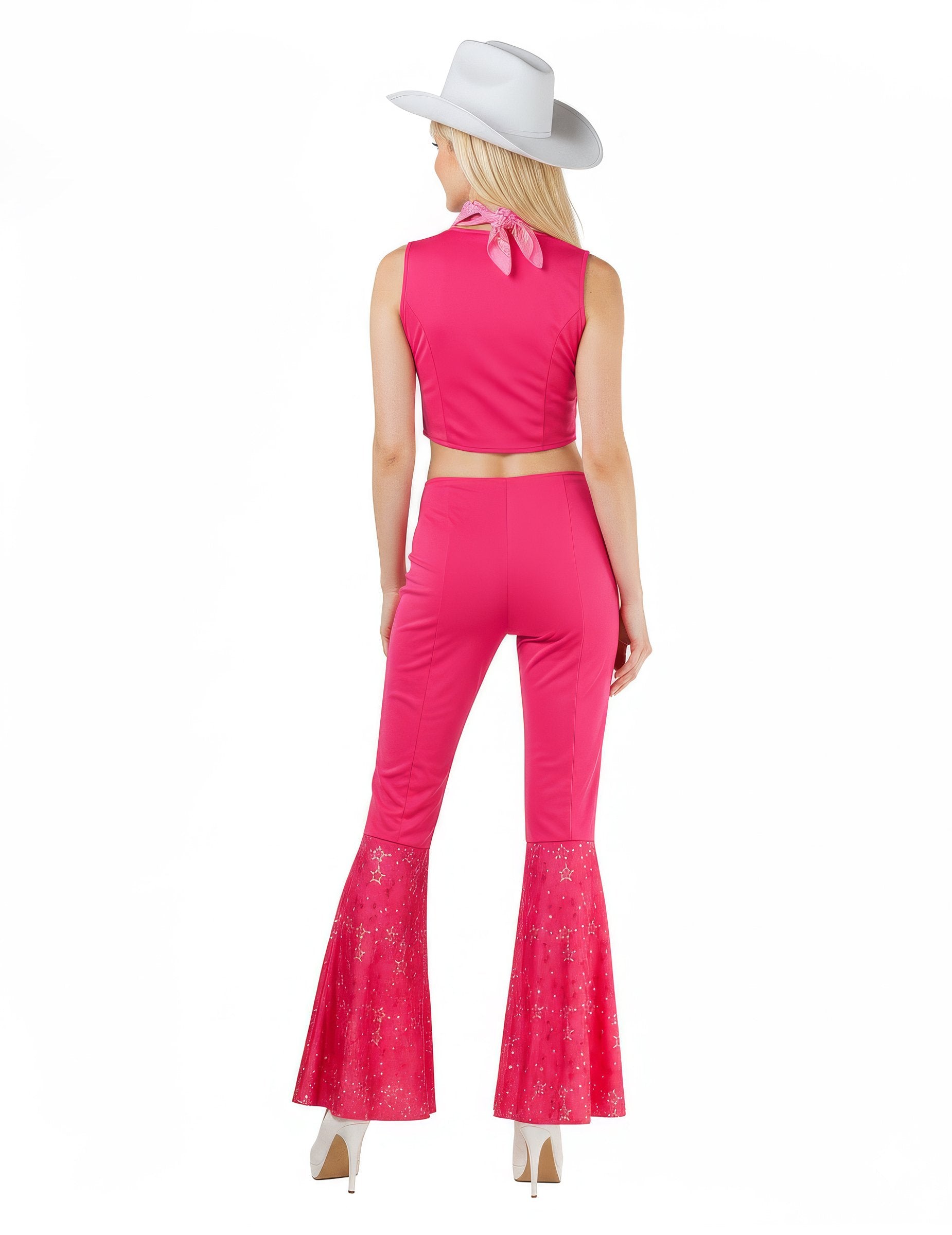 Ovaj potpuni seksi ružičasti kaubojski kostim namijenjen je ženama. Sastoji se od šešira, bandane, vrha i hlača. Vrh je svijetlo ružičaste boje. Hlače imaju istu boju kao i vrh, čvrsto je na bedrima i plamenu razinu koljena. Bandana je ružičasta s bijelim uzorcima. Kaubojski šešir je bijeli s ružičastom vrpcom. Postanite Daleki zapadni kraljica s ovim ružičastim kostimom kaubojke koja će biti idealna za zapadnu večer ili druge prerušene događaje!