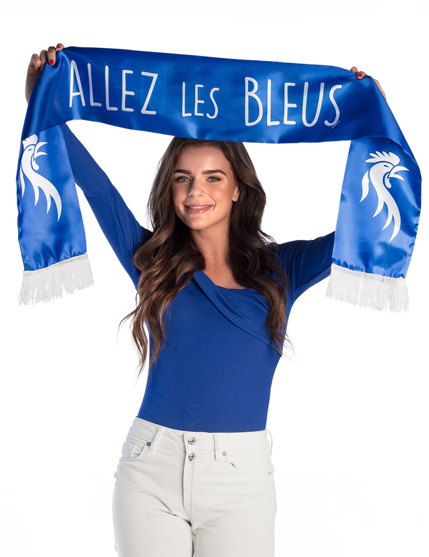 Ovaj šal podrške je za odrasle. Plava je boje s bijelim rubovima. Ona nosi natpis "dođite na blues" i ukrašena je poznatim francuskim pijetlom. Ovaj će šal biti savršen za poticanje francuske momčadi tijekom nogometnog Svjetskog kupa ili drugih sportskih natjecanja!