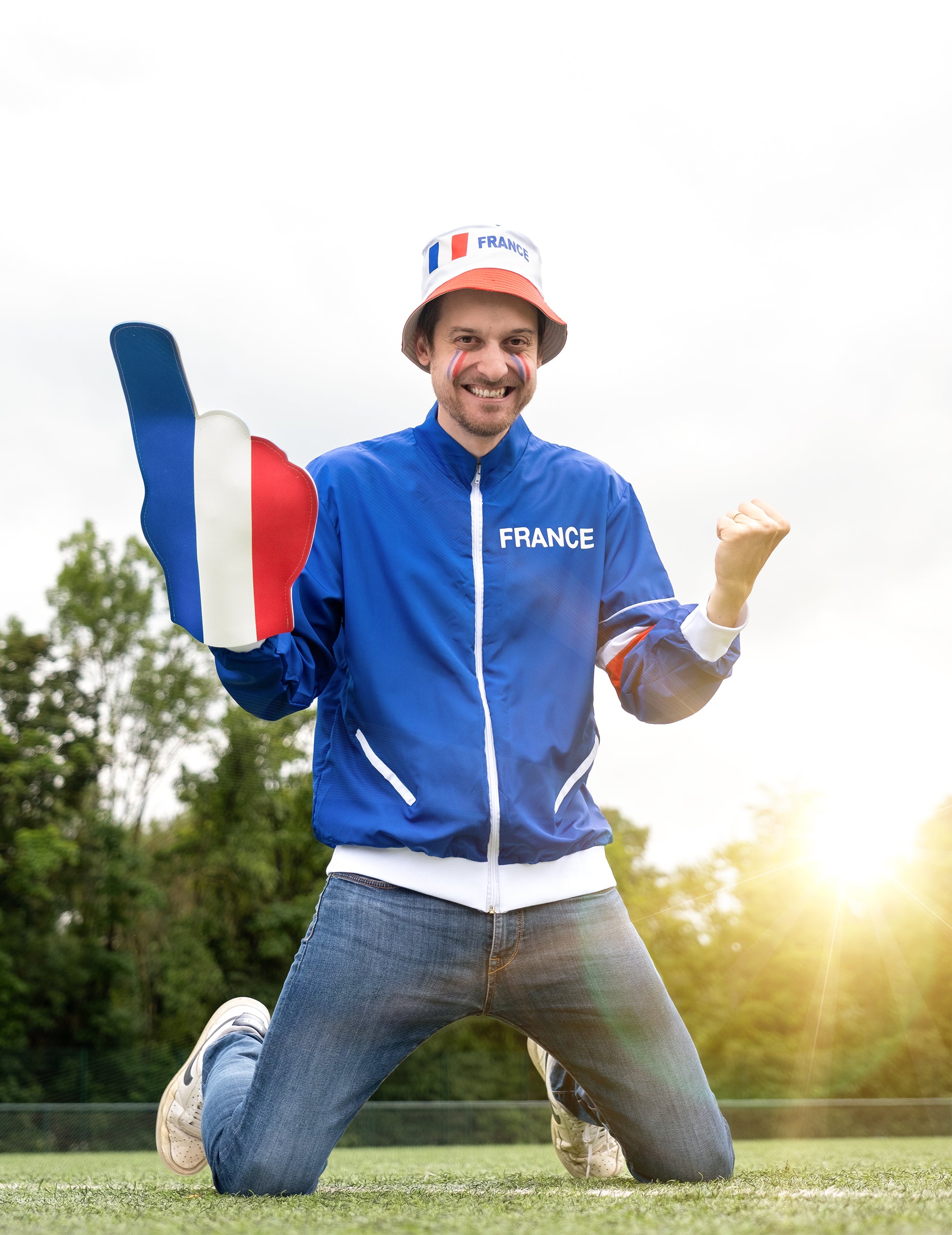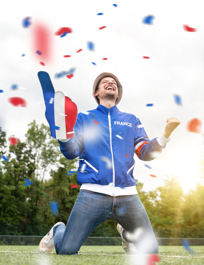 Ova podrška za ruke je za odrasle. U pjeni, on predstavlja povišen indeks koji podržava vaš omiljeni tim. U bojama je zastave Francuske: plava, bijela i crvena. Ovaj navijač bit će savršen za podršku francuskom timu na stadionu ili s vaše sofe s prijateljima tijekom sportskih natjecanja!