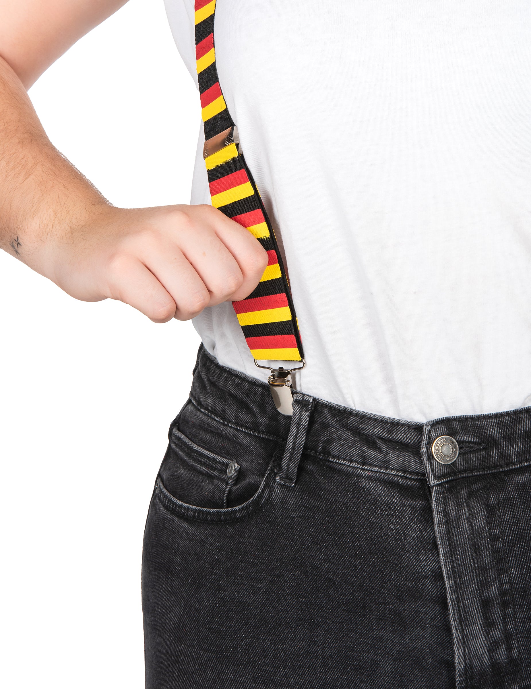 Ove njemačke naramenice namijenjene su odraslim osobama. Oni su s effigijom njemačke zastave s crnom, crvenom i žutom bojom. Kraje će vam omogućiti da ih lako pričvrstite na hlače. Nosite ove obustave za totalni izgled navijača tijekom sportskih natjecanja poput nogometnog svjetskog kupa ili Olimpijskih igara!