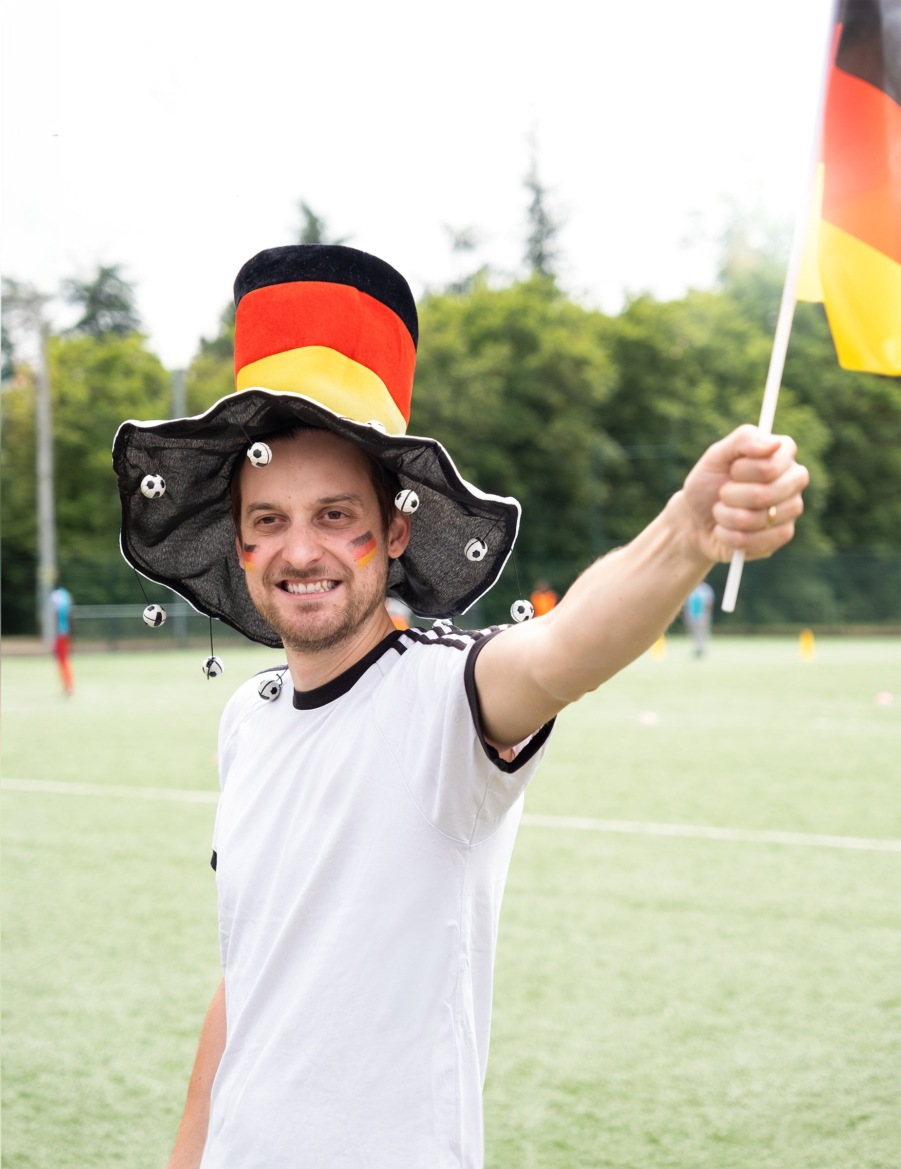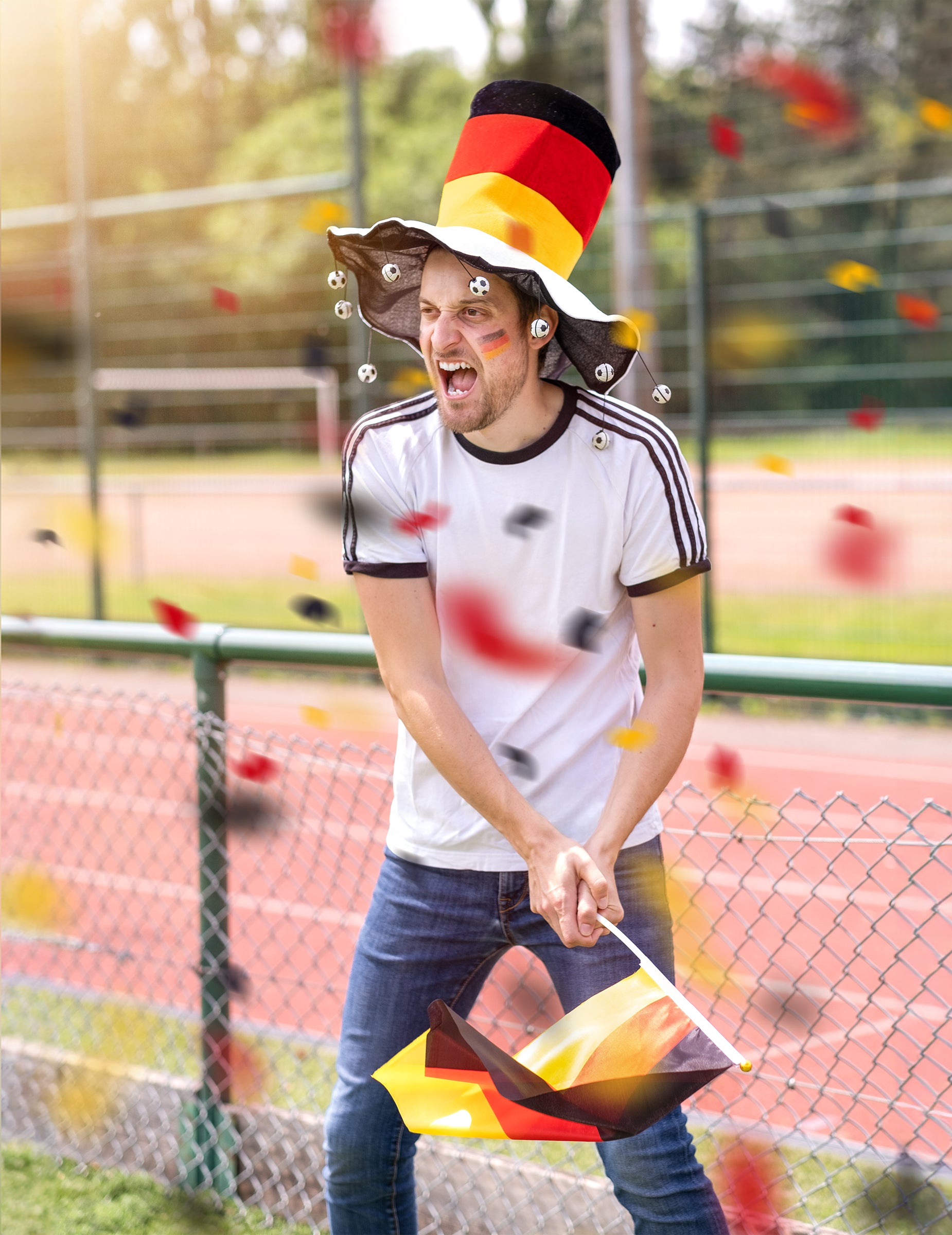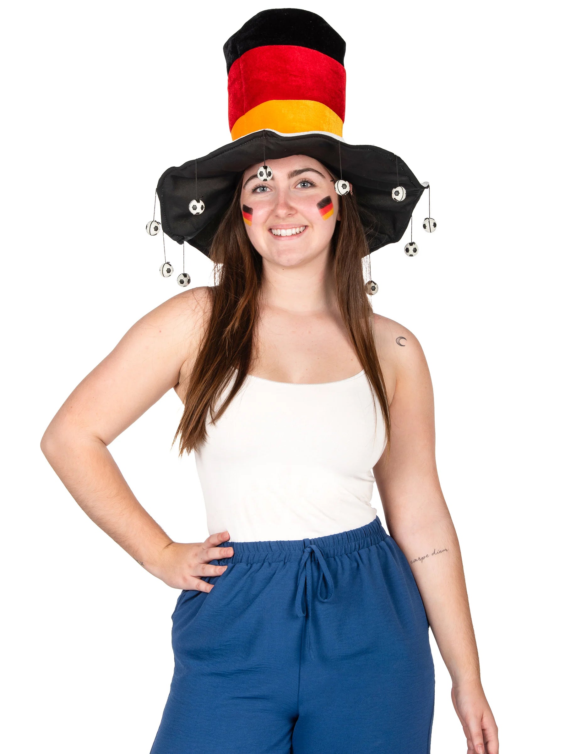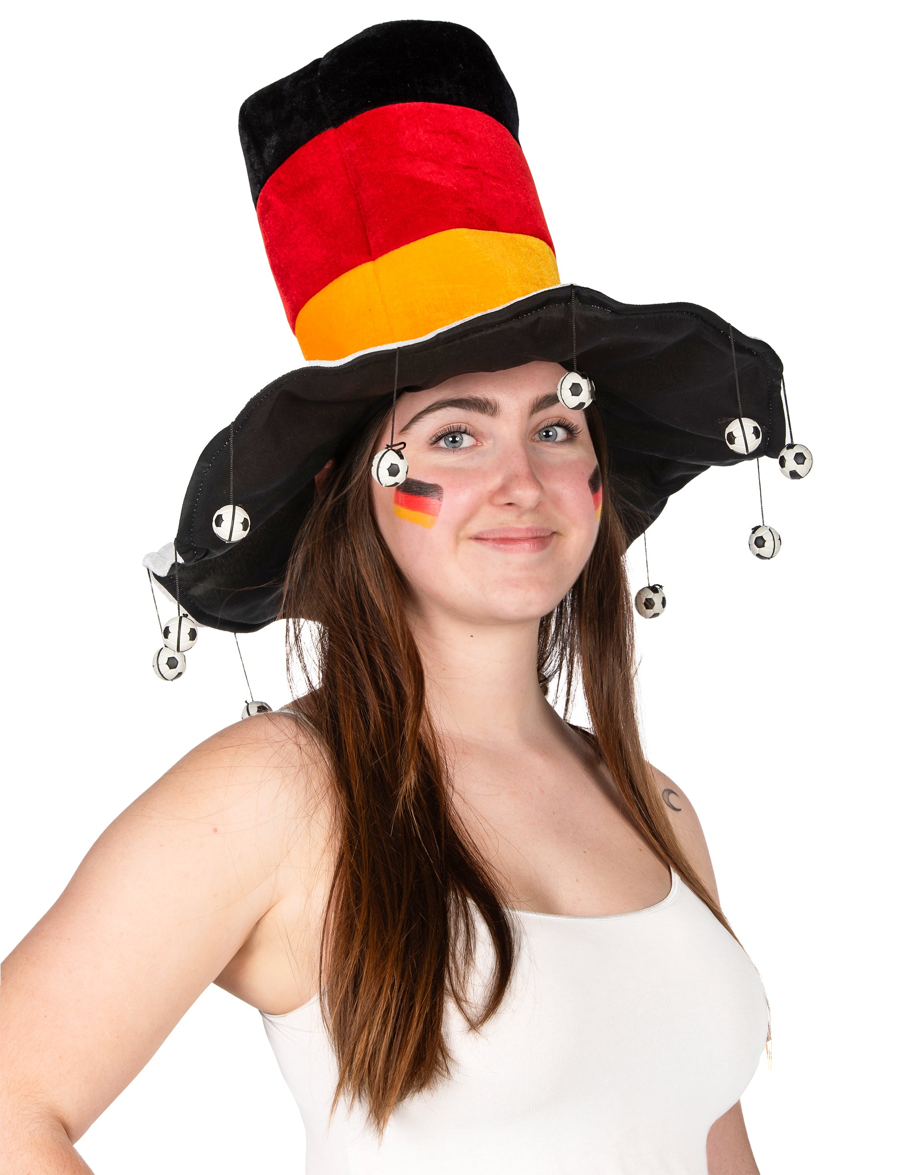 Ovaj njemački potporni šešir namijenjen je odraslima. Na vrhu oblika predstavlja boje Njemačke zastave: crna, crvena i žuta. Ukrašen je s nekoliko zvona u obliku nogometnih lopti. Podržite Mannschaft s ovim njemačkim šeširom za podršku tijekom nogometa eura ili povodom Svjetskog kupa!