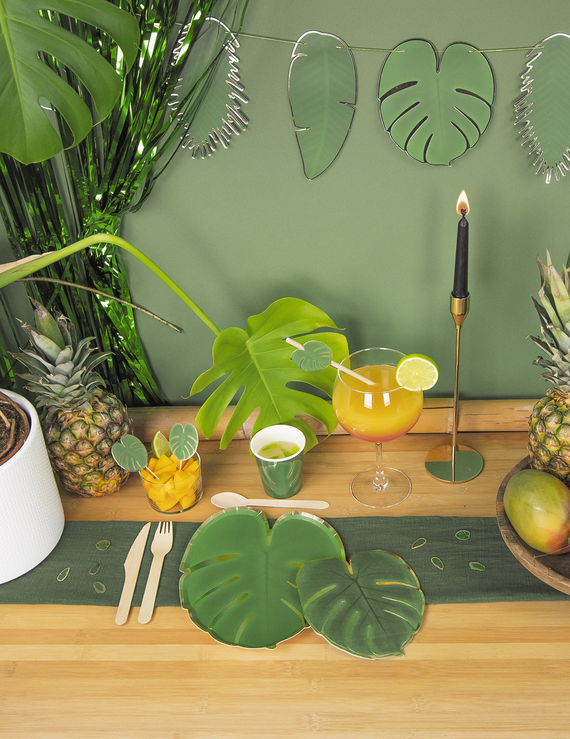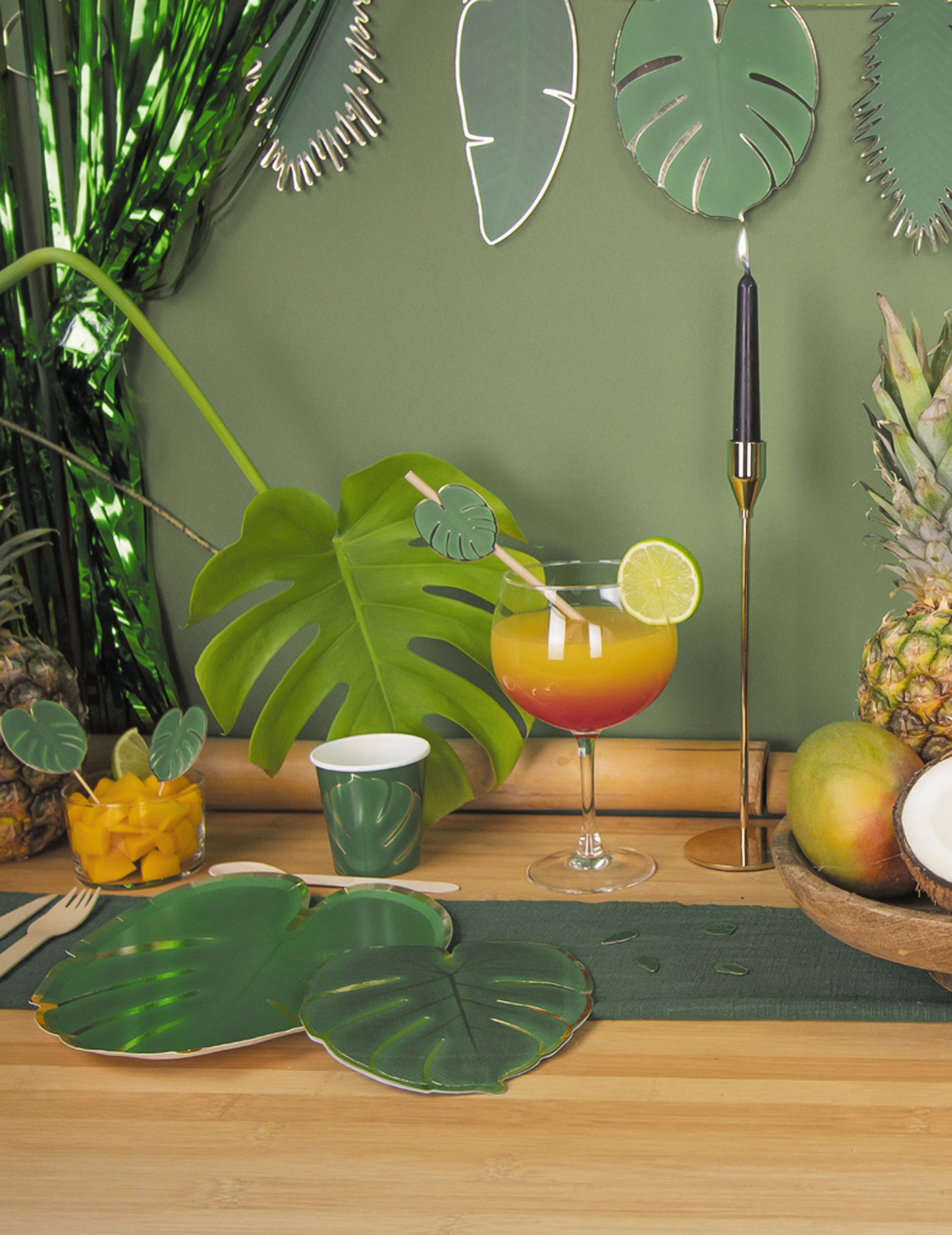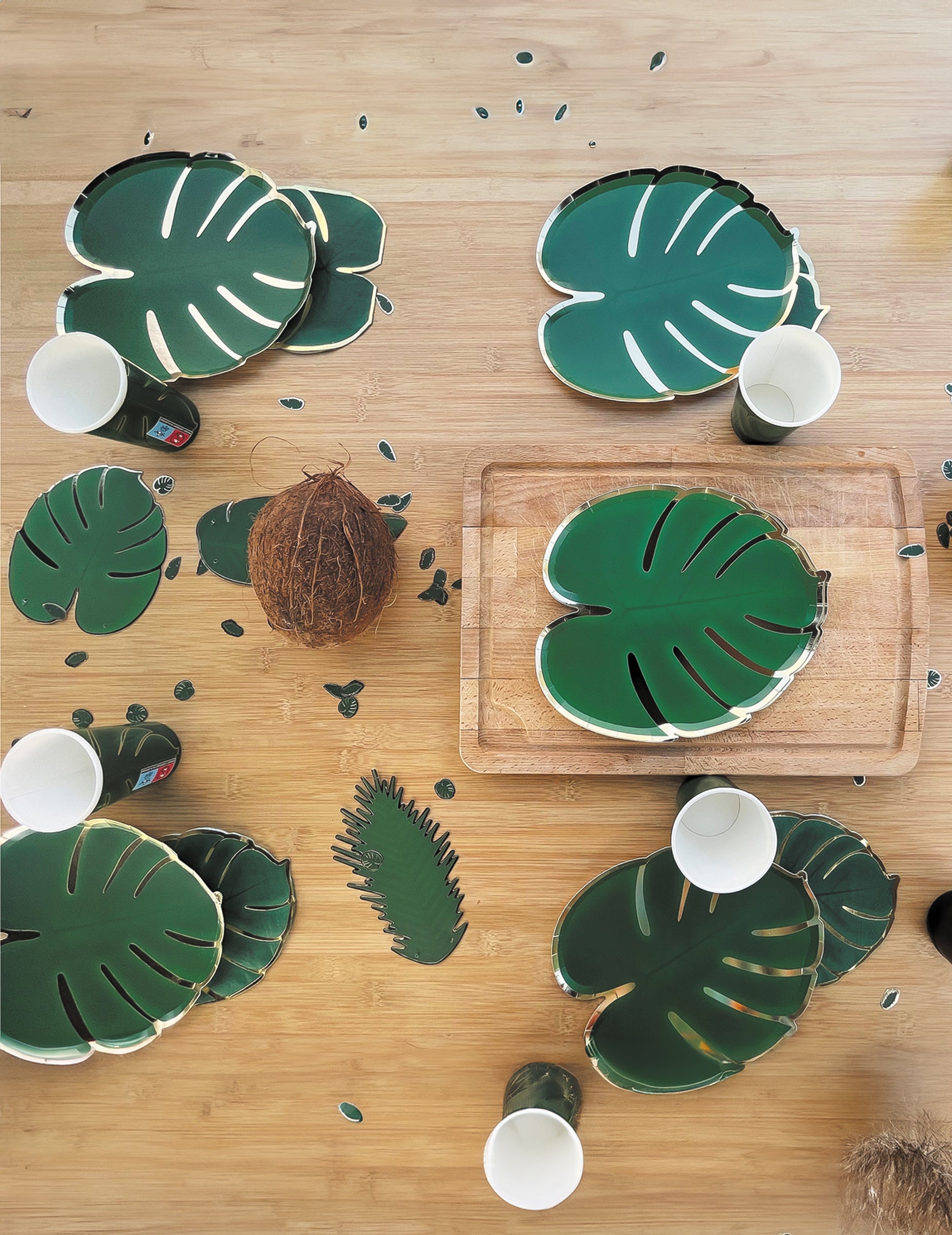 Ove tropske ploče prodaju se u puno 8 i mjere otprilike 23 cm. U obliku tropskog lima zelene su boje sa zlatnim obrisom. Te su ploče u Cato. Idite na avanturu za svoj rođendan s ovom serijom tropskih ploča!