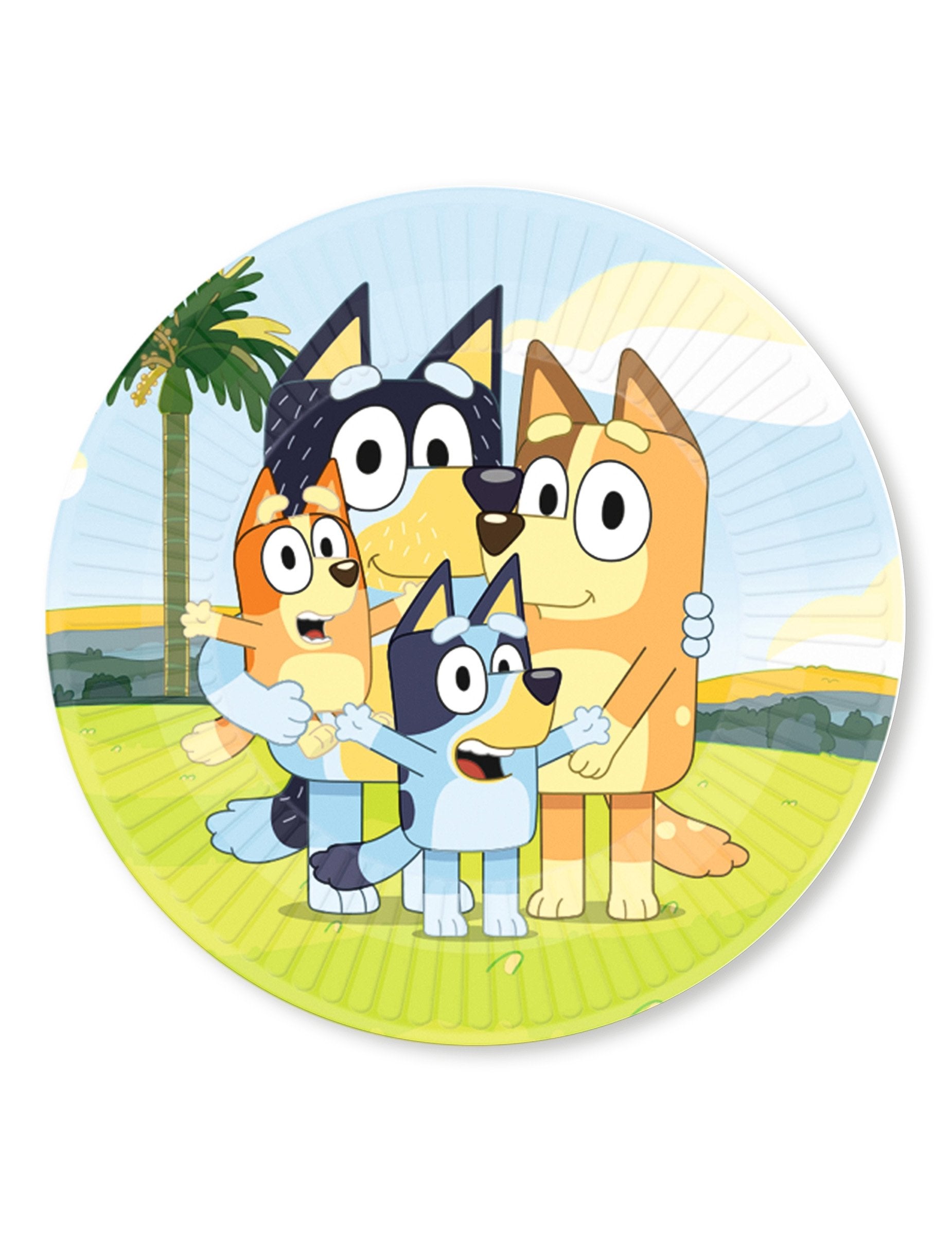 Ova se parcela sastoji od 8 kartonskih ploča pod službenom Bluey licencom. Imaju promjer od oko 23 cm. Ukrašeni su prekrasnom slikom obitelji Bluey sačinjene od Binga, njegove sestre Bluey, oca Bandita i majke Chilie. Ove će tanjure biti savršene za rođendansku zalogaju obožavatelja crtića!