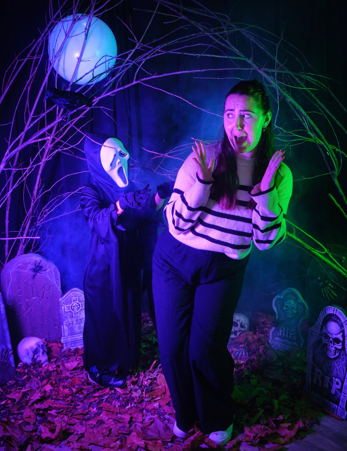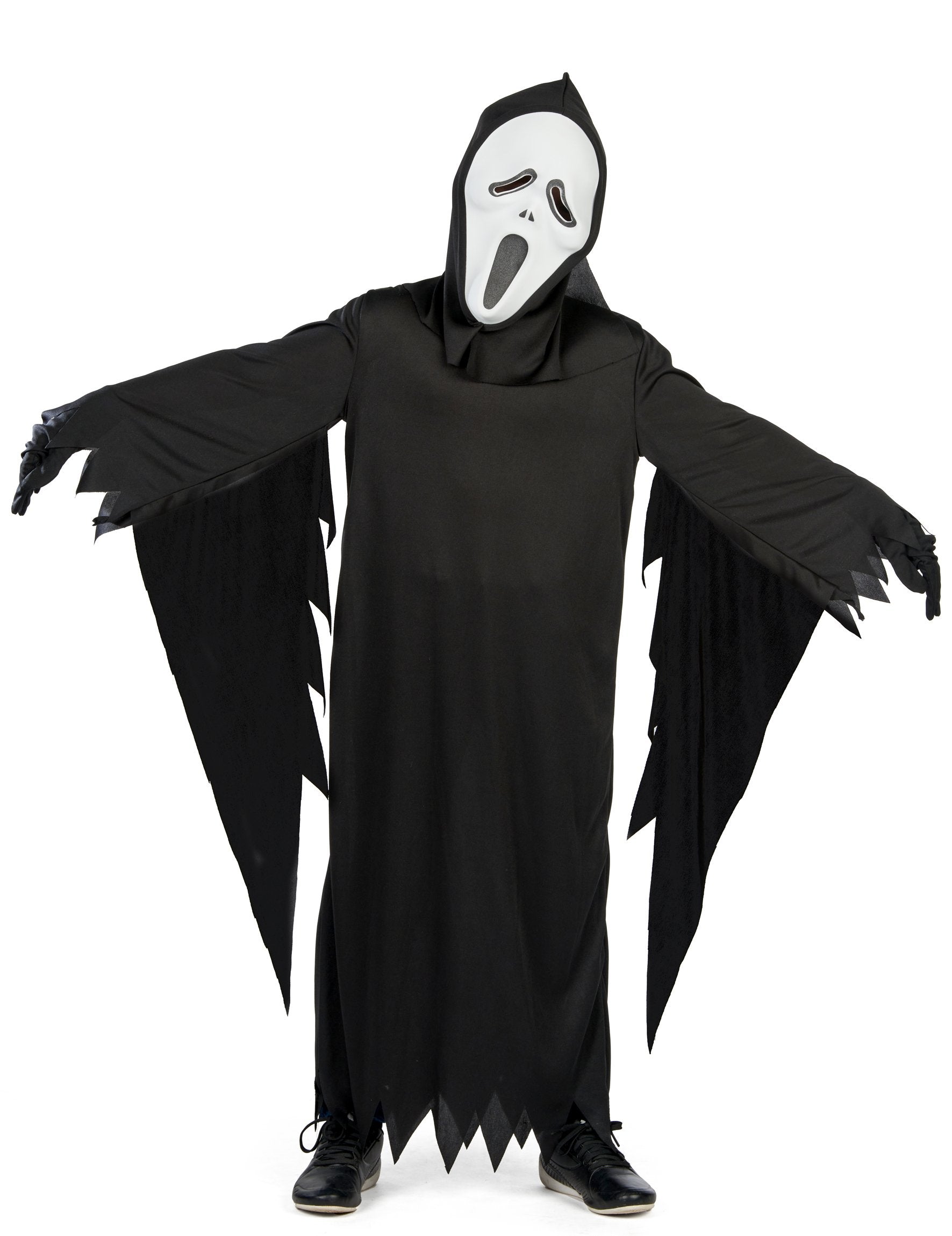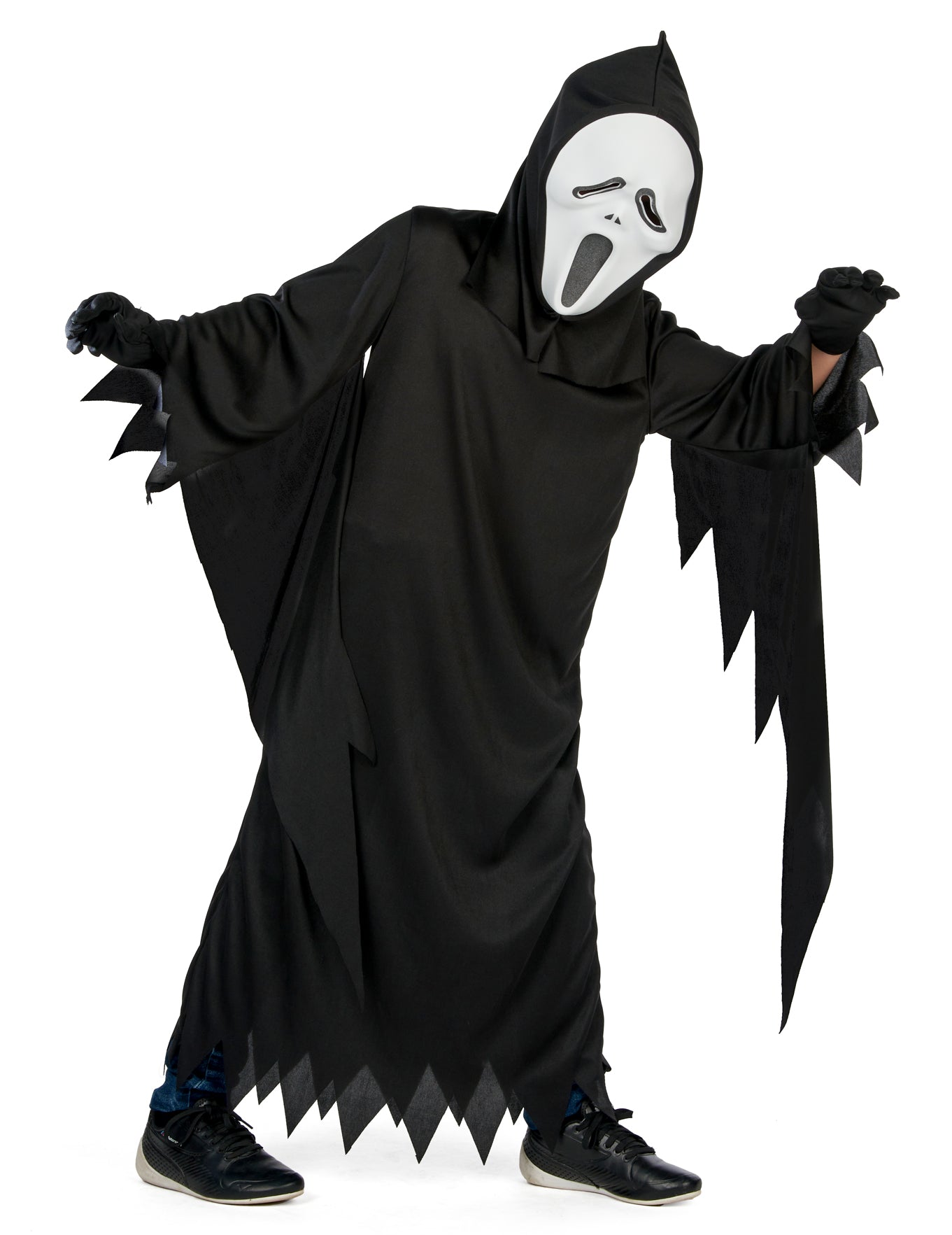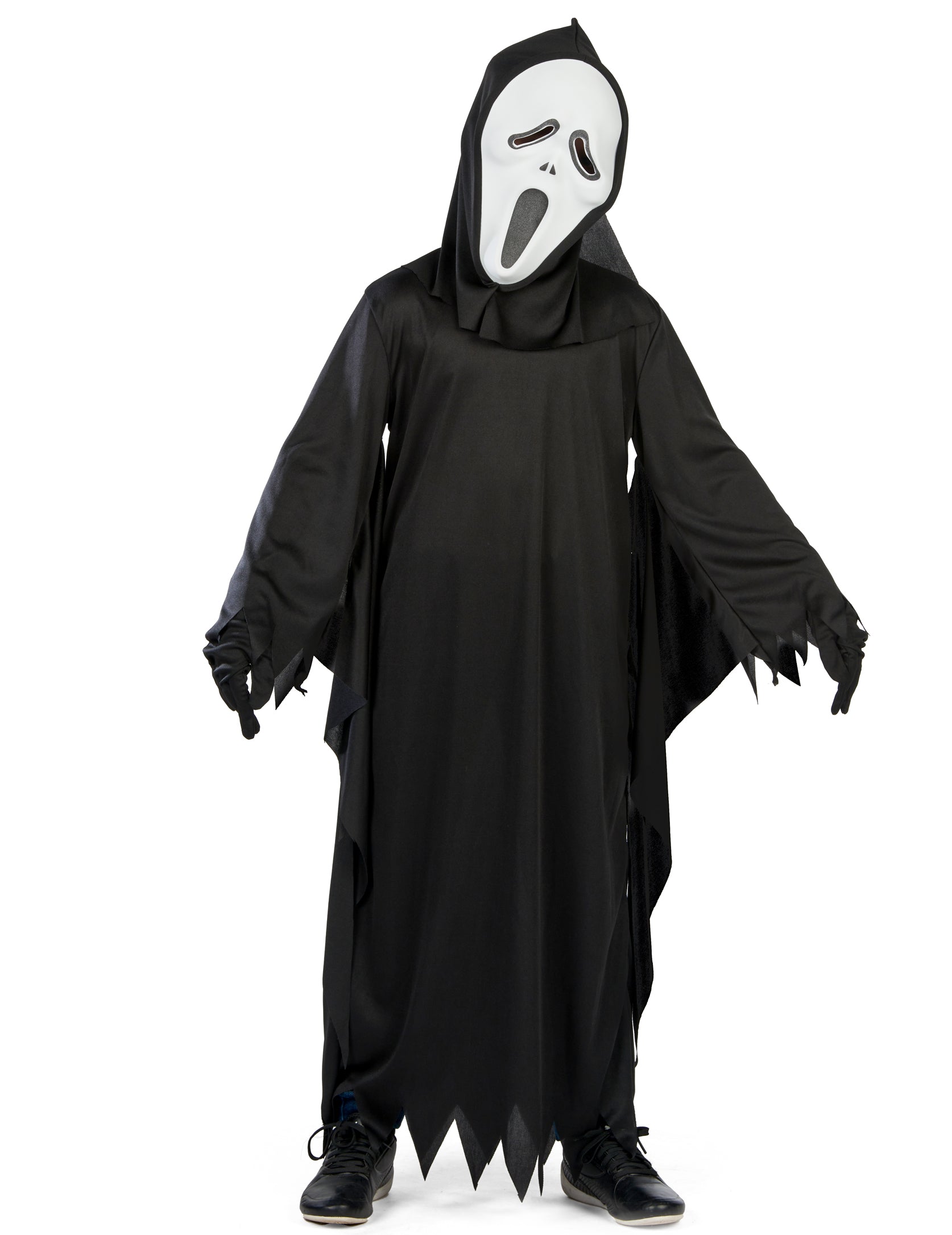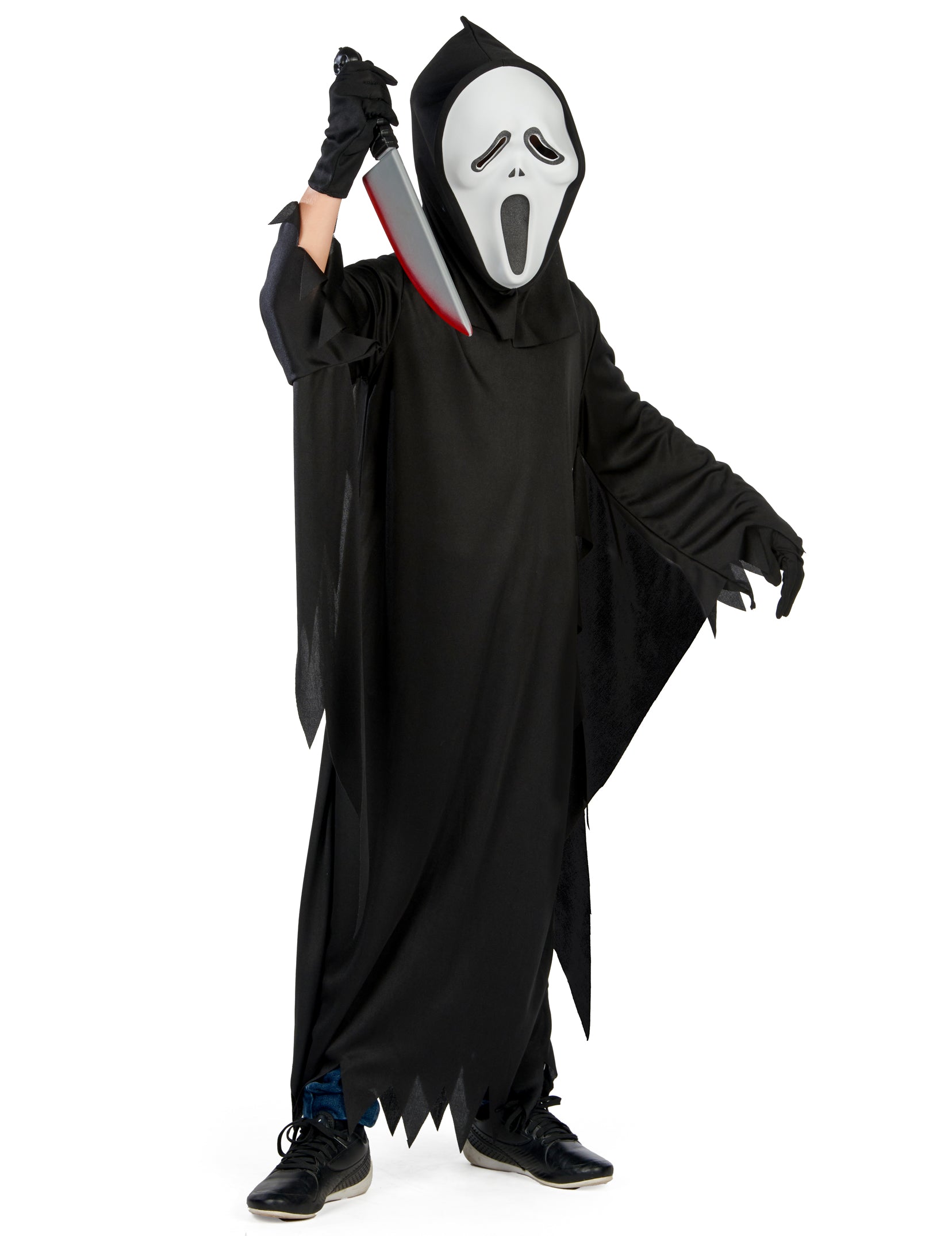 Kostim također uključuje masku koja potpuno prekriva lice djeteta. Ova maska ima ukočen izraz, nalik kriku užasa, čineći svaki nastup još upečatljivijim. Ova maska sablasnog izgleda daje završni dodir ovom mračnom kostimu, pretvarajući vaše dijete u anonimnog ubojicu spremnog prestrašiti sve!