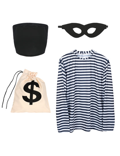 Ovaj set prerušavanja provala je za odrasle. Savršeno je pano da utjelovljuje pravog provalnika sa svojim crno -bijelim vrhom pruge, kapom i crnom maskom i vrećicom za uzimanje plijena. Igrajte pravog provalnika s ovim prerušenim setom!