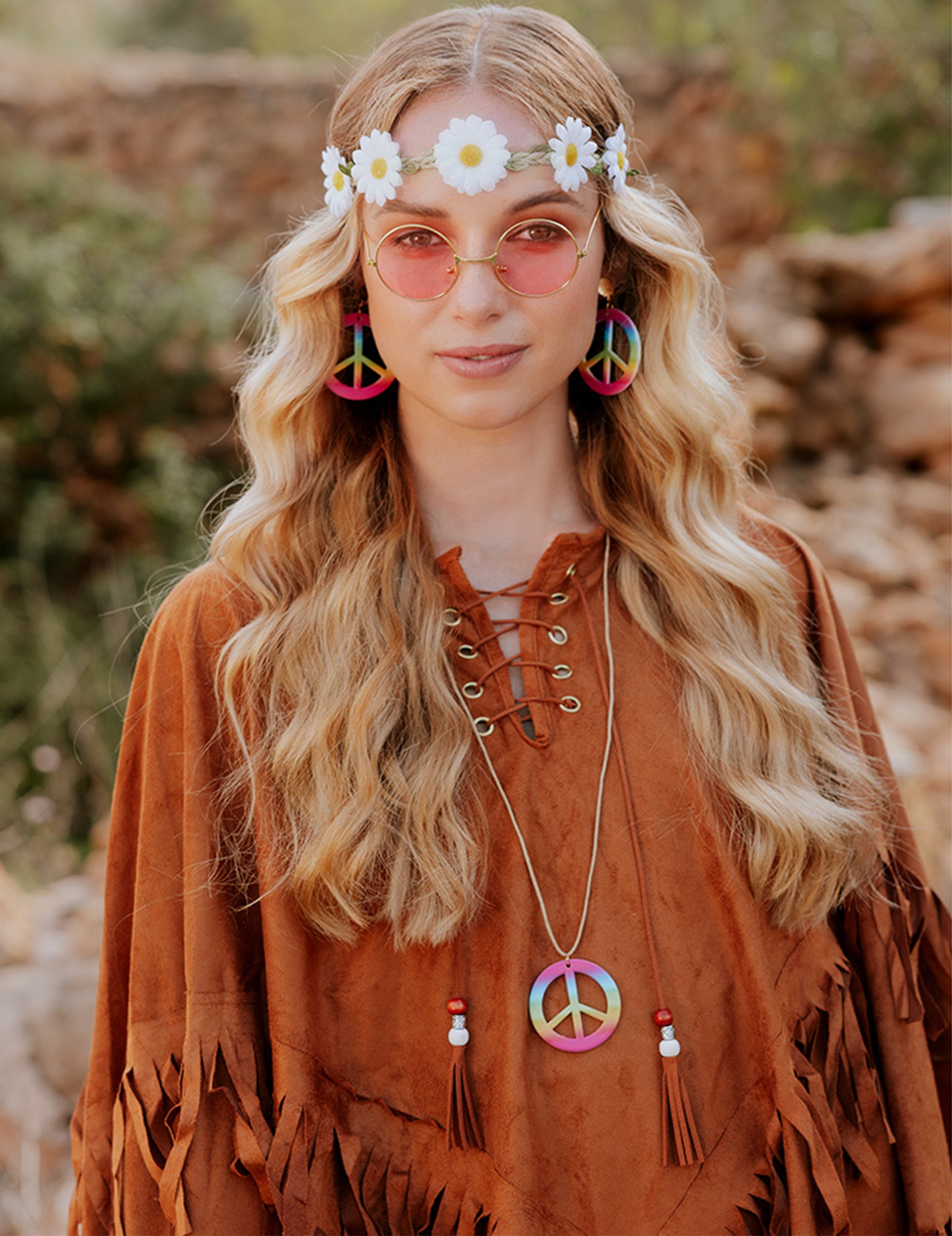 Smeđe je boje i ukrašen dugim resama. Ima vezice na dekolteu, što mu daje blagi efekt steznika. Ima izgled brušene kože.