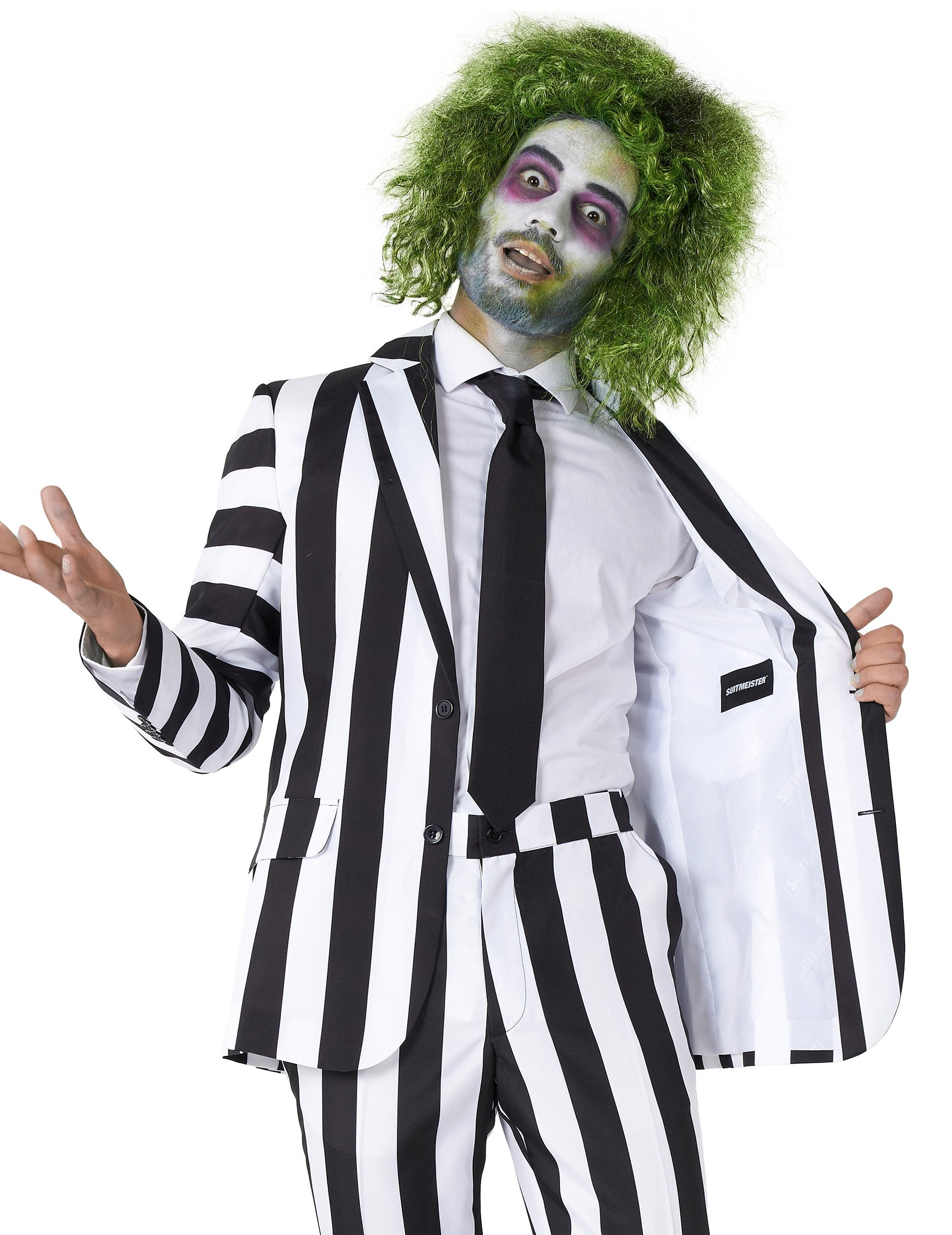 Ovaj kostim Beetlejuice namijenjen je za muškarce i uključuje jaknu, hlače i kravatu. Predstavljajući kostim čuvene Beetlejuice, jaknu i hlače imaju crno -bijele vertikalne pruge. Jakna s dugim zalihama ima 2 gumba sprijeda kako bi je lako zatvorila i ukrašena je lažnim džepovima. Hlače imaju gumb crne boje i dva džepa. Kostim je dovršena crnom kravate. Napravite senzaciju za svoju večer za Noć vještica s ovom kompletnom kostimom Beetlejuice!