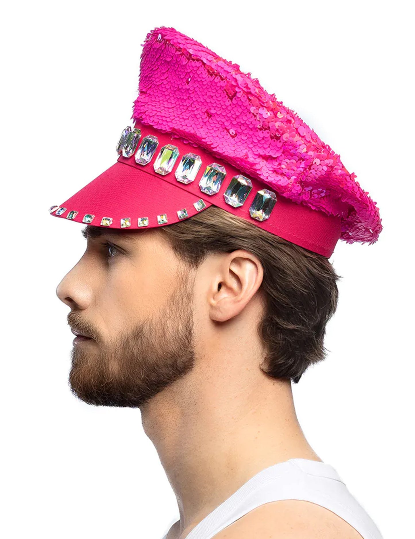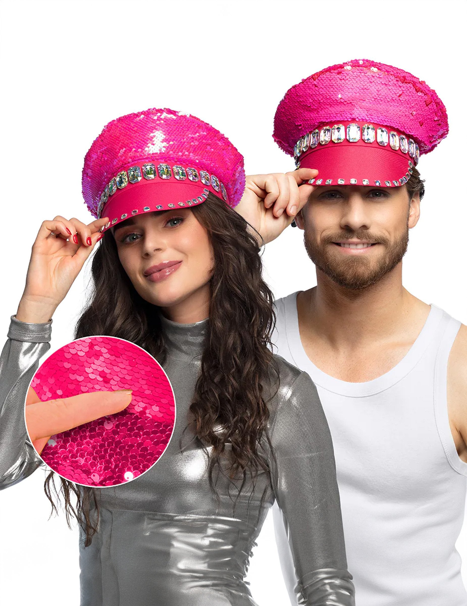 Ova kapa za šljokice namijenjena je odraslima. Ružičaste je boje i ima reverzibilne šljokice koje će proći u fluorescentnim. Ukrašen je srebrnim rhinestonesima različitih veličina što mu daje svu svoju eleganciju. Ova reverzibilna kapica šljokica bit će savršena za vaš sljedeći festival!