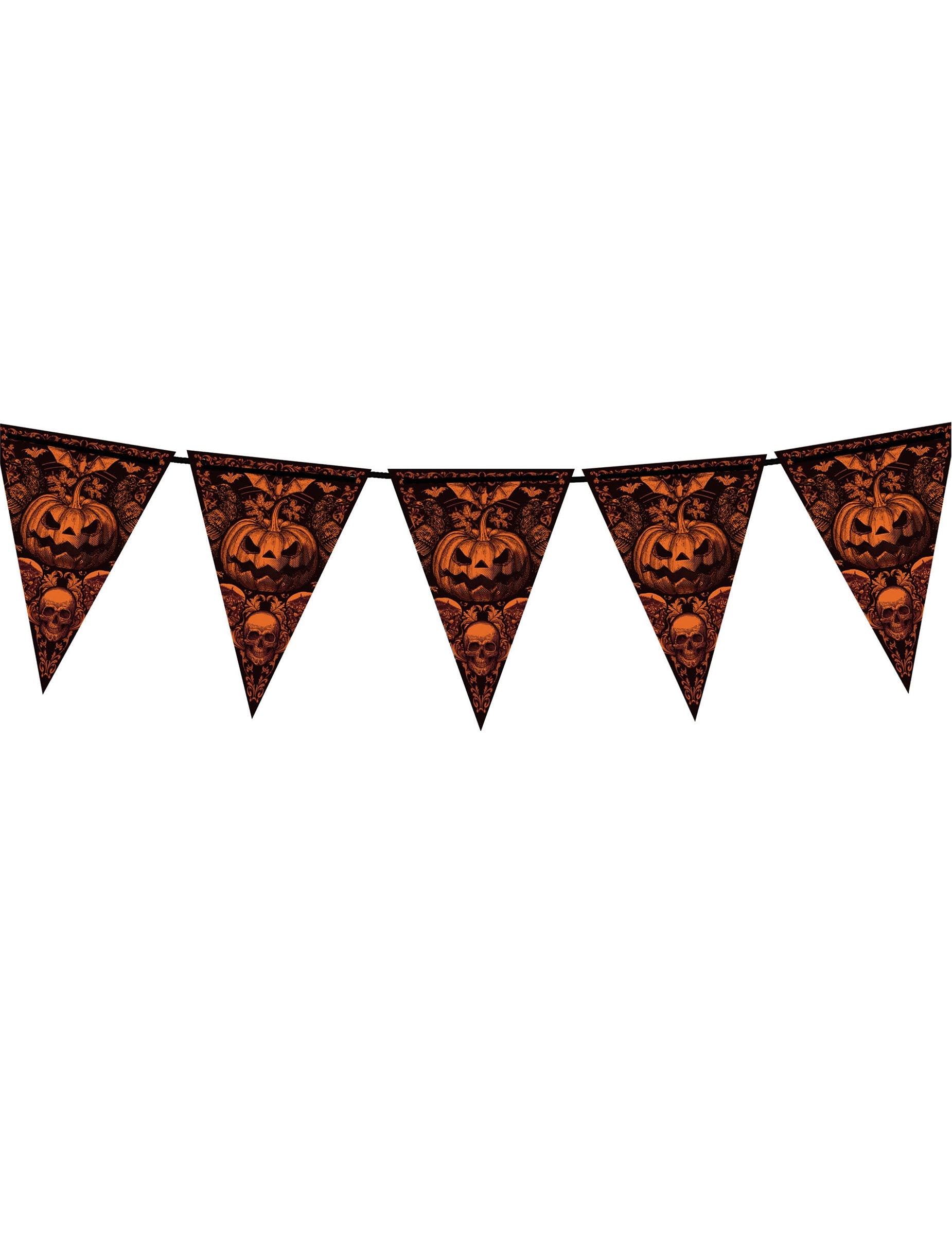 Ovaj vijenac gotičkih zastavica, dimenzija otprilike 274 cm, sastoji se od zastavica od oko 20 x 30 cm. Svaka zastavica ukrašena je uzorcima gotičke bundeve, donoseći tajanstvenu i tamnu atmosferu u vaš dekor Noći vještica. Idealno za usavršavanje vašeg ukrasa na temu bundeva, ovaj će vijenac dodati karakterističan i zastrašujući dodir vašoj zabavi.