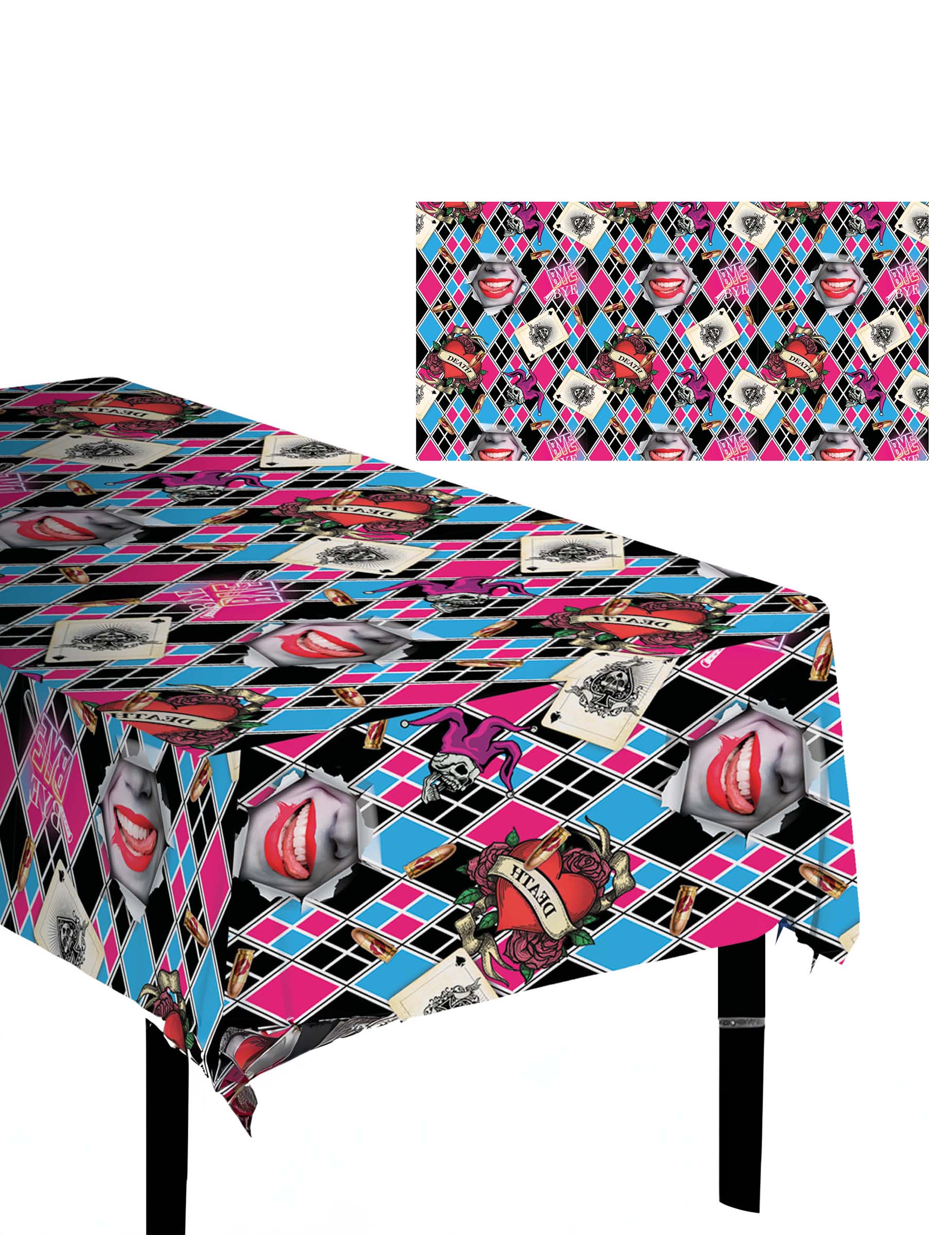 Ovaj stolnjak na temu opasna gril izrađena je od plastike. Mjeri otprilike 137 x 274 cm. Crna, plava i ružičasta boja, ovaj stolnjak je također ukrašen uzorcima stijena kao što su crvene usne, igranje karata i još uvijek cvjetnih srca. Odlučite se za ovu opasnu djevojku za stolnjak za originalni ukras stola na sljedeću temu Noći vještica.