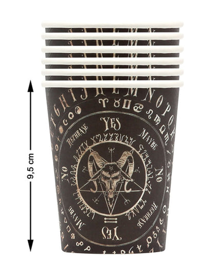 Ovih 6 kartonskih čaša imaju kapacitet od približno 250 ml i mjere oko 9,5 cm. Imaju čarobni dizajn nadahnut Ouijom, s središnjim motivom koji predstavlja glavu koze okružen tajanstvenim krugom ispunjenim slovima i ezoterijskim simbolima. Crna pozadina pojačava lagane bež detalje, stvarajući upečatljiv i vizualno očaravajući kontrast. Savršene za Noć vještica, ove će se čašice Ouija u idealnom integrirati u vaš tematski ukras.