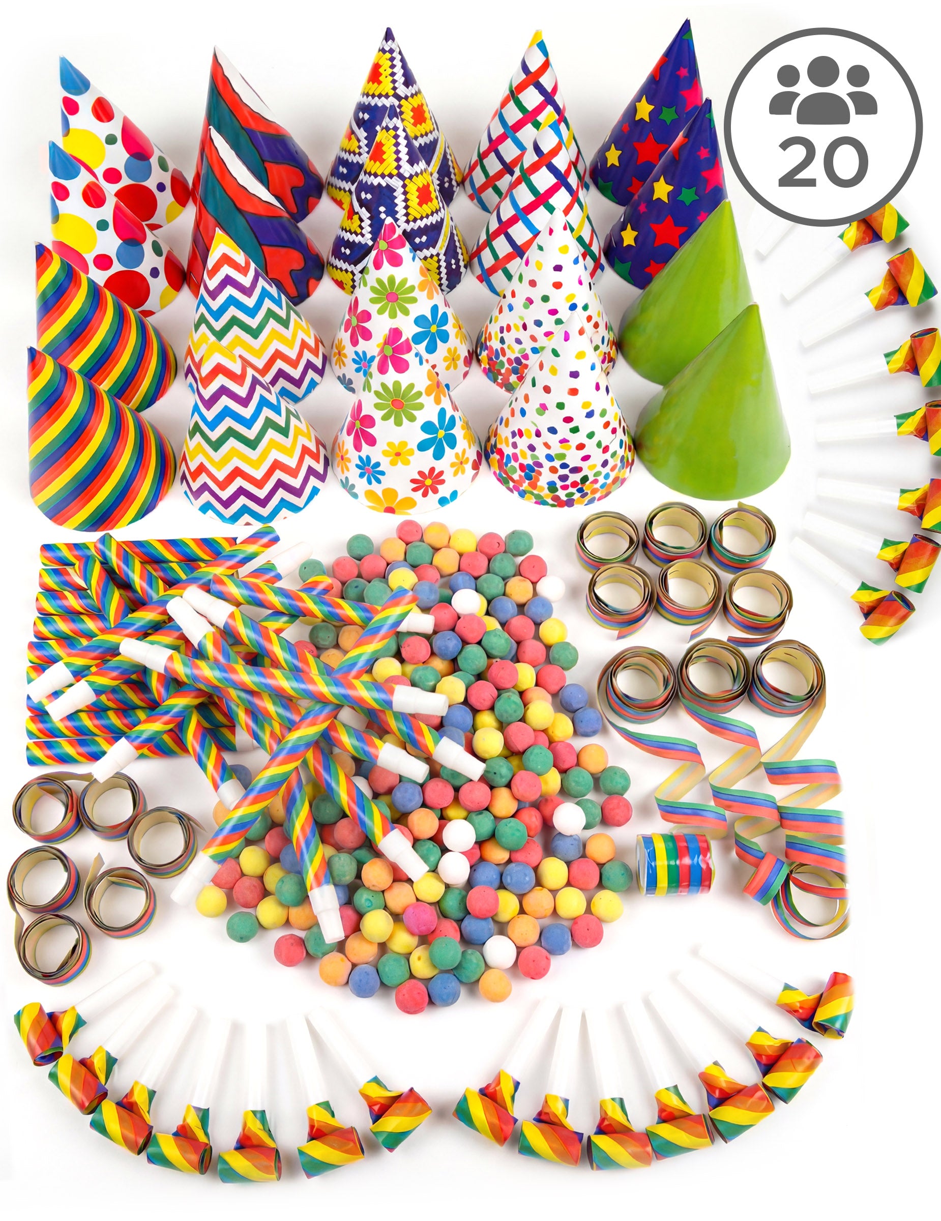 Ovaj komplet raznobojnih poklona za zabavu dizajniran je za 20 osoba i sastoji se od: - 20 puhalica - 200 lopti - 20 kapa - 20 papuča - 60 traka Ovaj svečani komplet je savršen za događaje kao što su doček Nove godine, rođendani ili bilo koje druge proslave s obitelji ili prijateljima!