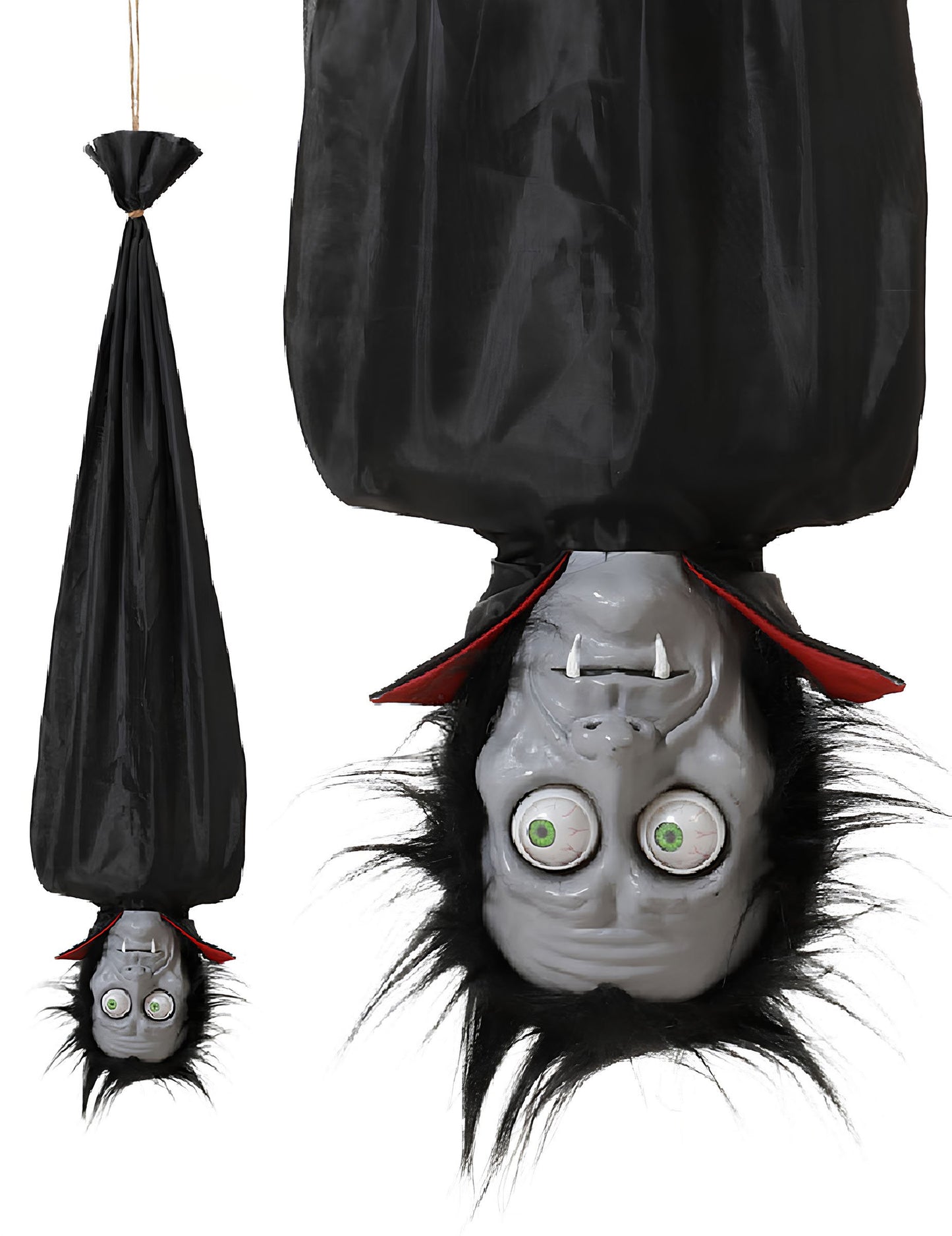 Ova suspendirana, svijetla i zvučna vampira mjeri oko 120 cm. Odjeven je u crni ogrtač koji skriva njegovo tijelo, dok mu glava nadmašuje, otkrivajući sivkasto lice, crnu kosu i prijeteće očnjake, potvrđujući njegov nevjerojatan identitet vampira. Da biste aktivirali vampir, jednostavno pritisnite gumb. On će reagirati na okolne zvukove, zauzvrat izdajući uznemirujuće zvukove. Oči će mu se upaliti i početi se kretati s lijeva na desno u potrazi za plijenom. Radi s 3 AAA baterije (baterije nisu uključene). Bilo da ga objesite iznutra ili izvana, ovaj je ukras idealan za zastrašivanje svojih gostiju ili impresioniranje malih čudovišta koja će pokucati na vaša vrata tijekom Noći vještica.