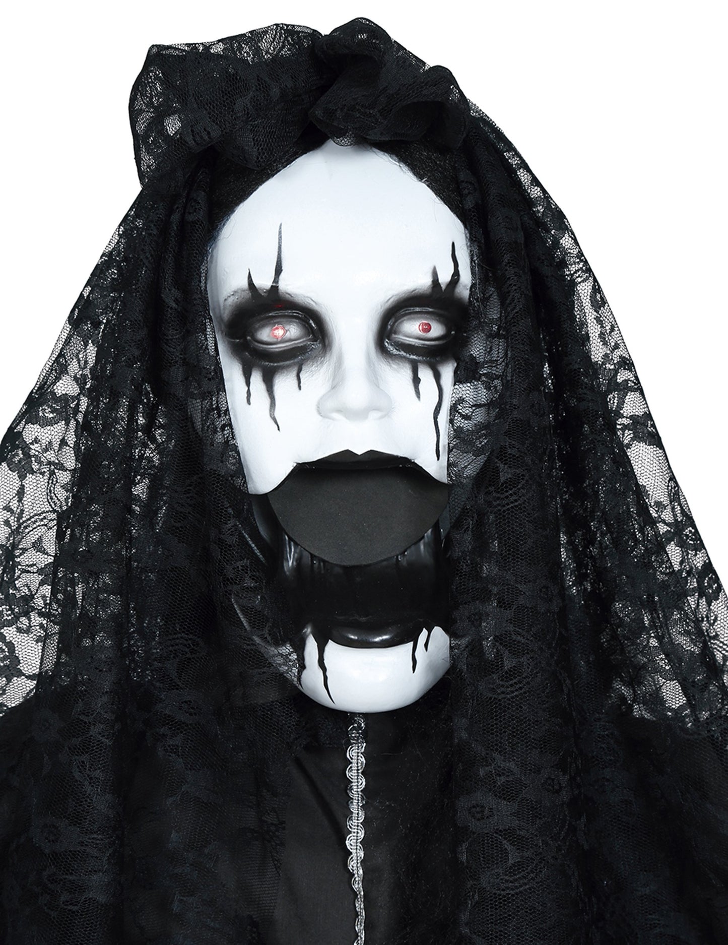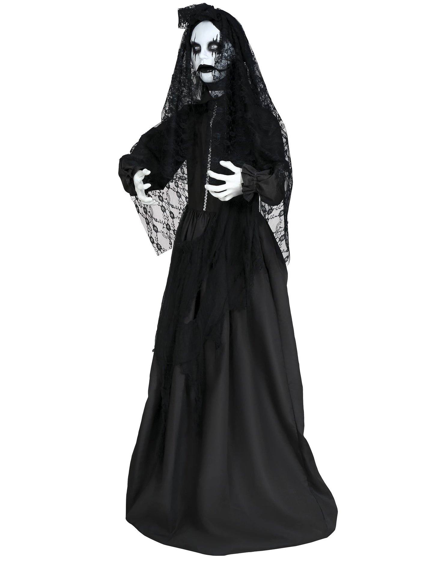 Ovaj animirani, svijetli i zvučni ukras u obliku zastrašujuće lutke visok je otprilike 170 cm. Savršena za stvaranje zastrašujuće atmosfere tijekom vašeg Noći vještica ili druge tematske događaje, ova zlonamjerna lutka neće propustiti da vaši gosti drhte. Odjeven u dugu crnu haljinu s crnim čipkastim velom, opremljen je laganim efektima u crvenim očima i zvučnom funkcijom za pojačavanje atmosfere macabre. Zahvaljujući svojim automatskim pokretima, čini se da oživljava još upečatljivije iskustvo. Rad s 3 AAA baterije uključene, ovaj je ukras jednostavan za instaliranje i korištenje. Idealno za dovršavanje vašeg dekora za Noć vještica, ova animirana lutka bit će vrhunac vašeg ukrašavanja i jamči atmosferu zastrašujuću kao što je to slučaj!