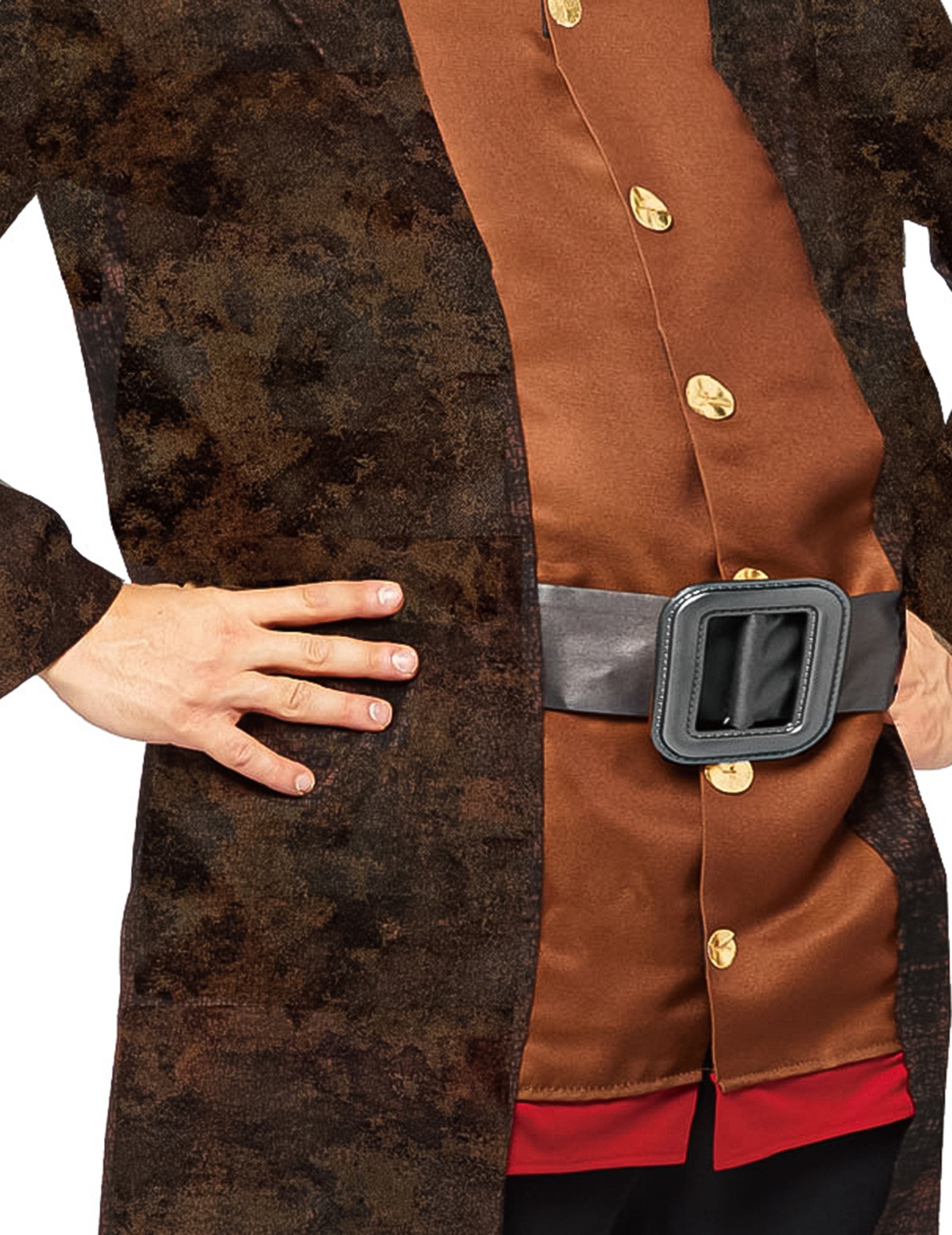 Široki pojas, opremljen velikom četvrtastom srebrnom kopčom, steže odjevnu kombinaciju u struku, dodajući kostimu realističan i upečatljiv detalj.