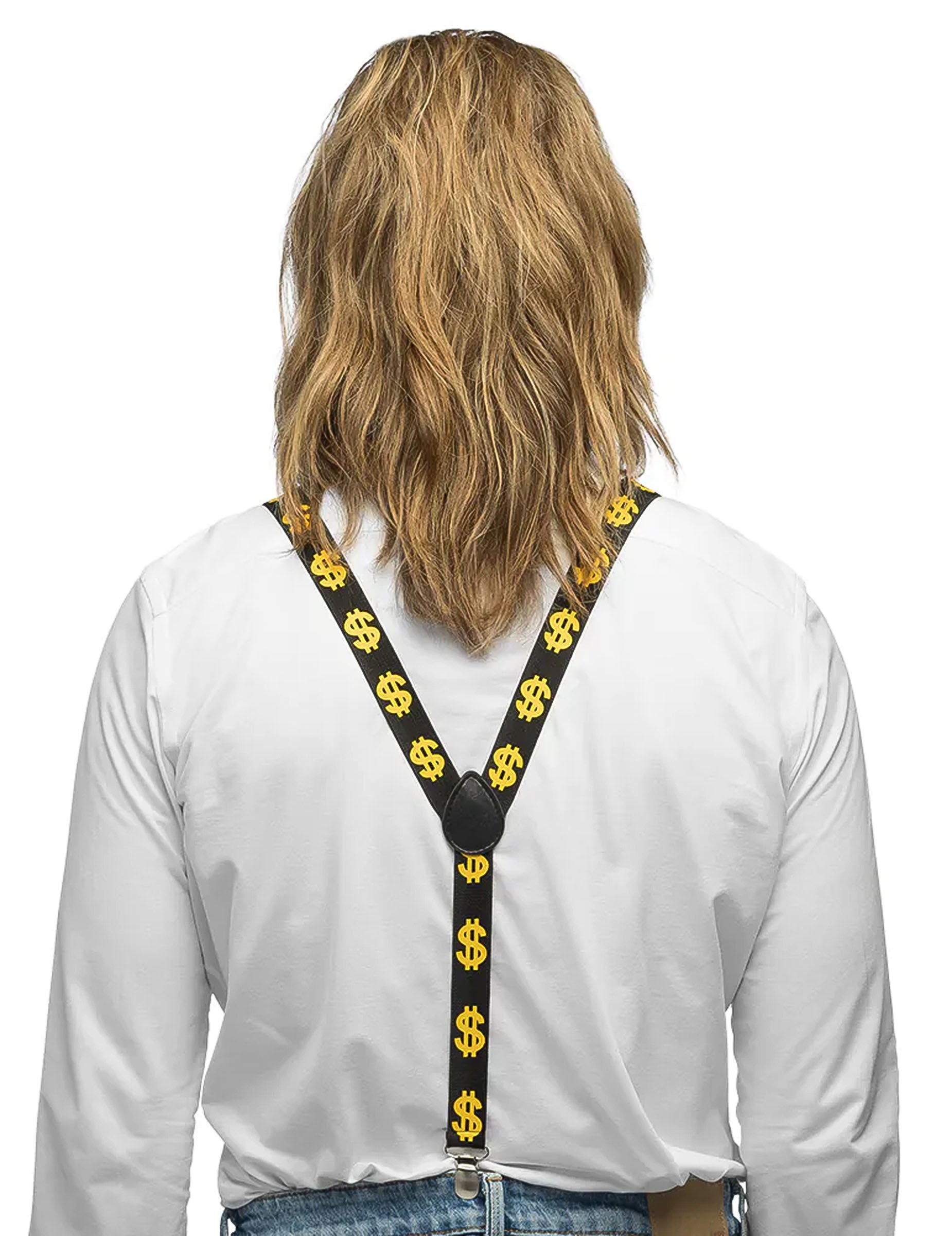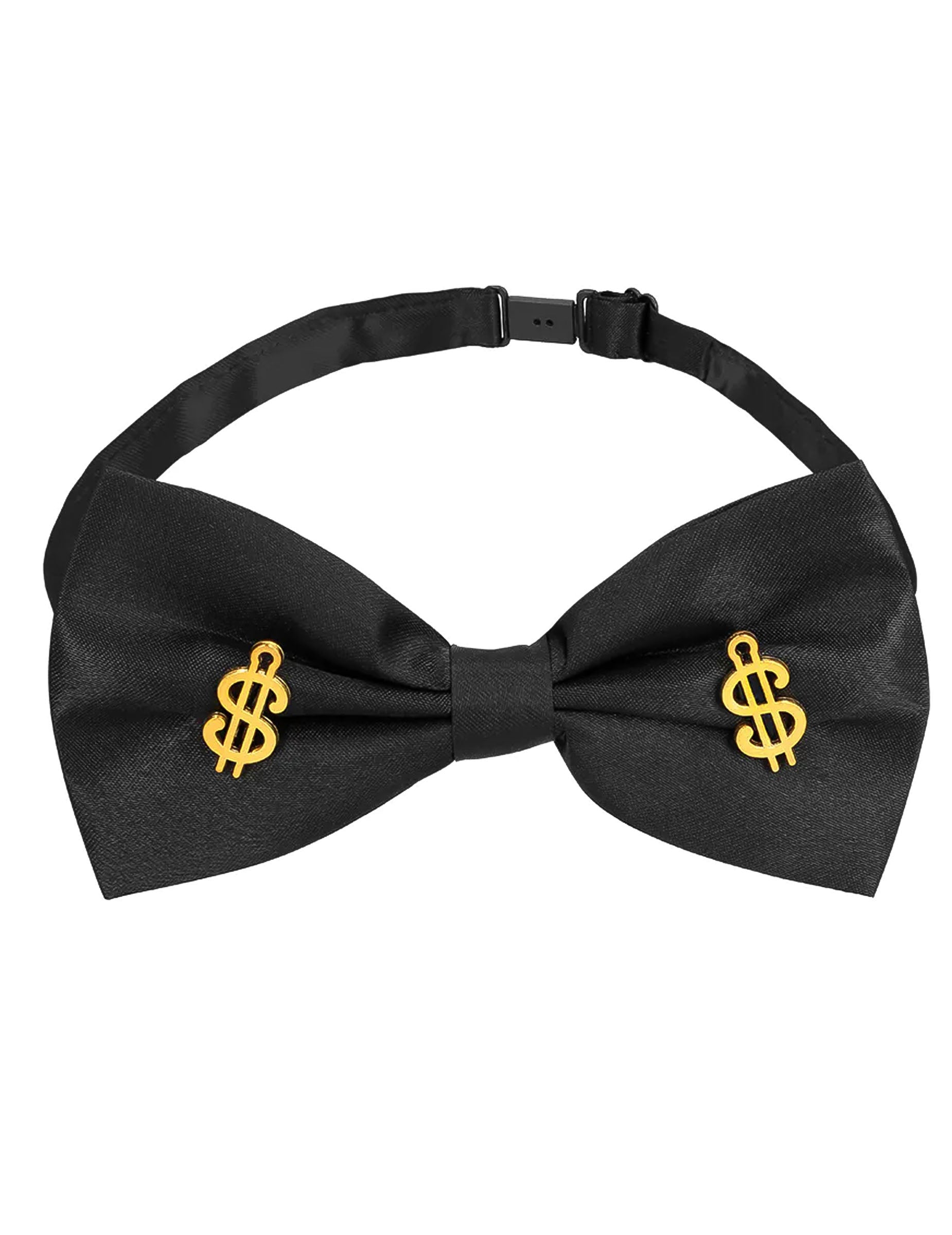 Ovaj dolarski komplet dodataka za odrasle sadrži naočale, leptir mašnu i tregere. Par naočala ima zlatni okvir sa simbolima "$" umetnutim na svakoj leći, za hrabro luksuzan izgled. Leptir kravata, crna i elegantna, ukrašena je s dva simbola "$" u sredini, suptilno podsjećajući na vašu raskoš. Naposljetku, par crnih tregerica upotpunjuje odjevnu kombinaciju, ukrašenu zlatnim uzorcima "$" za šik i ekstravagantan završni dodir. Ovaj komplet će biti savršen za tematsku večer ili za karneval.