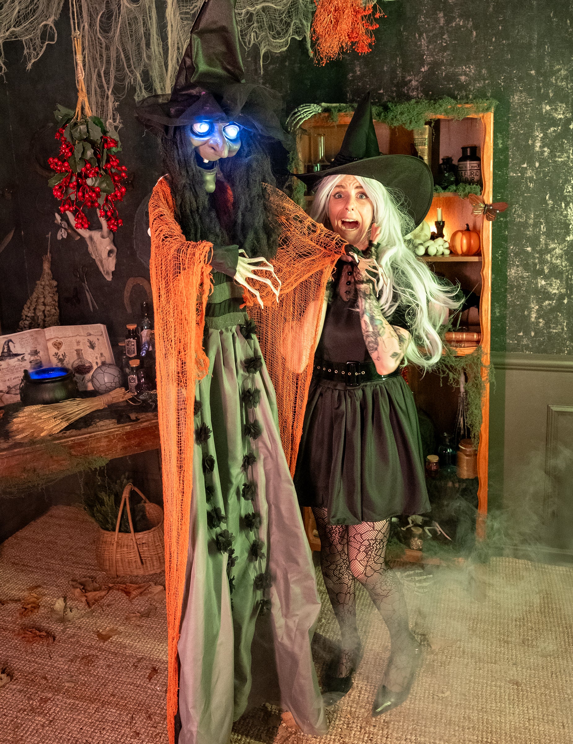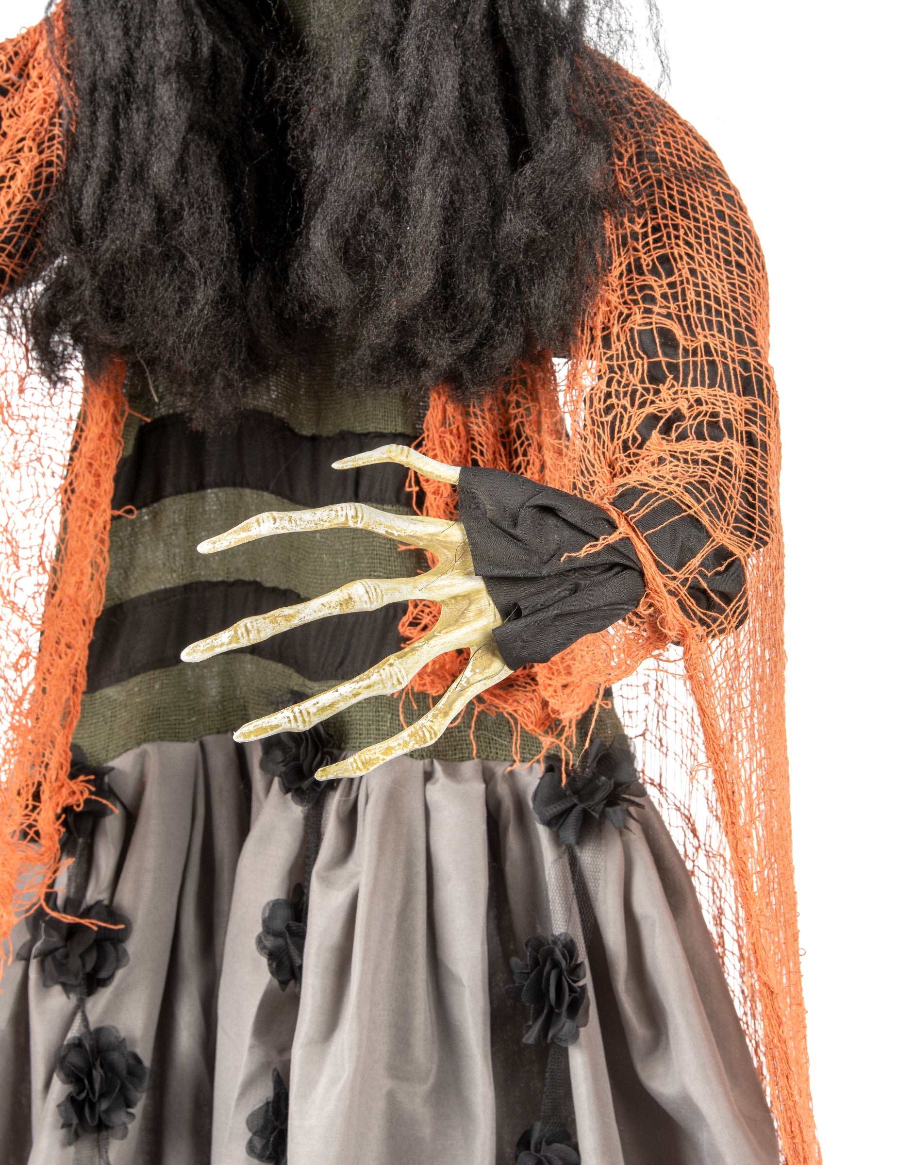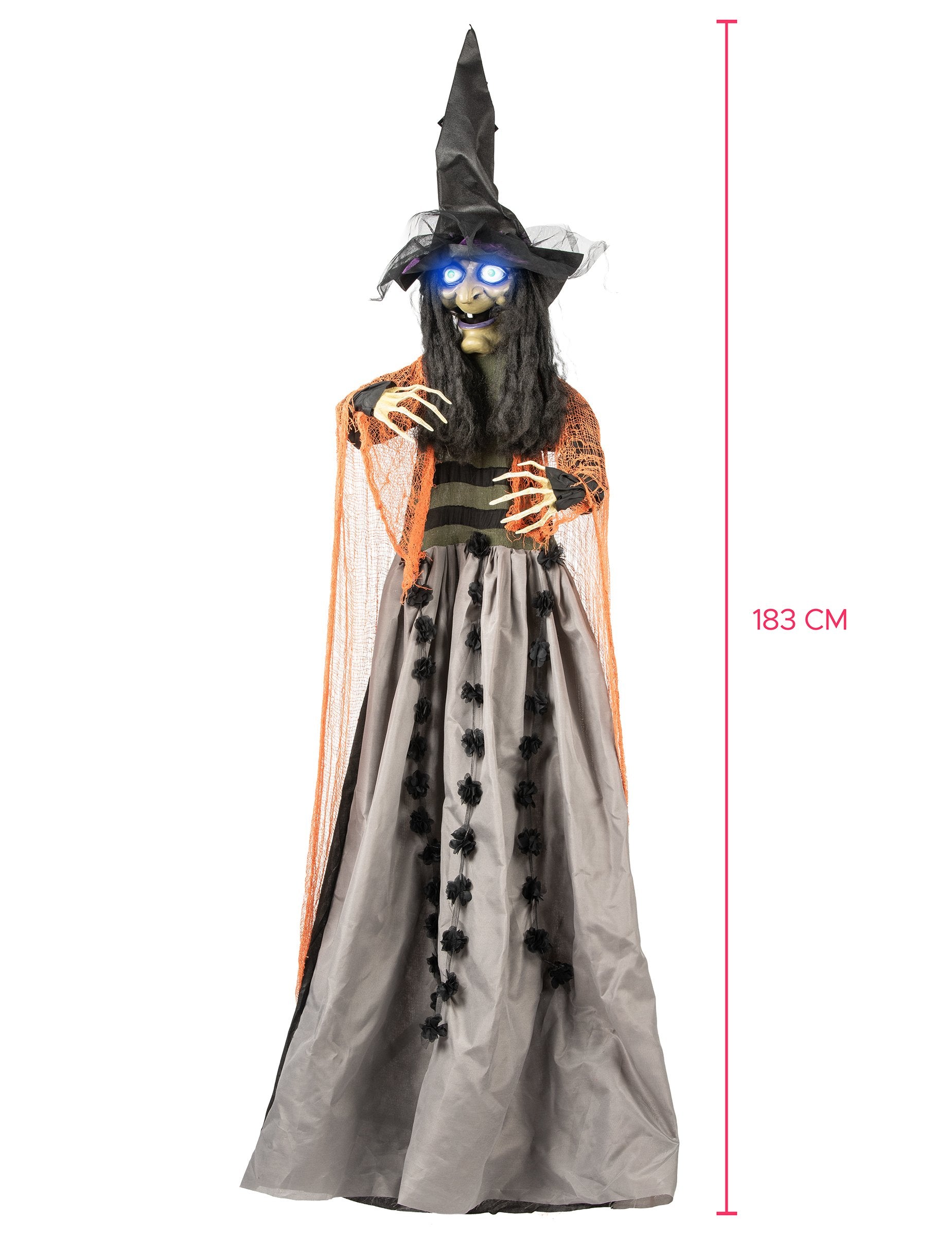 Ova animirana dekoracija sa zvukom i svjetlom, visoka 1,8 metara, prikazuje sablasnu viseću vješticu, savršenu za Noć vještica ili zabavu s horor tematikom. Sa svojim osvijetljenim licem i sjajnim očima stvara jezivu atmosferu. Animirani pokreti i zastrašujući zvučni efekti oživljavaju ovu vješticu, dodajući interaktivan i sablasan dodir vašem dekoru. Njezina crna odjeća, koja se sastoji od šiljastog šešira, zlokobne haljine i poderanog vela, pojačava njezin prijeteći izgled. Idealna za iznenađenje vaših gostiju i poboljšanje atmosfere Noći vještica, lako se objesi za upečatljiv efekt. Ova animirana viseća vještica savršen je izbor za uspješnu dekoraciju za Noć vještica. Postavite je na ulaz ili u tamni kut kako biste svojim posjetiteljima osigurali jezu! Potrebne su 3 AAA baterije (nisu uključene).