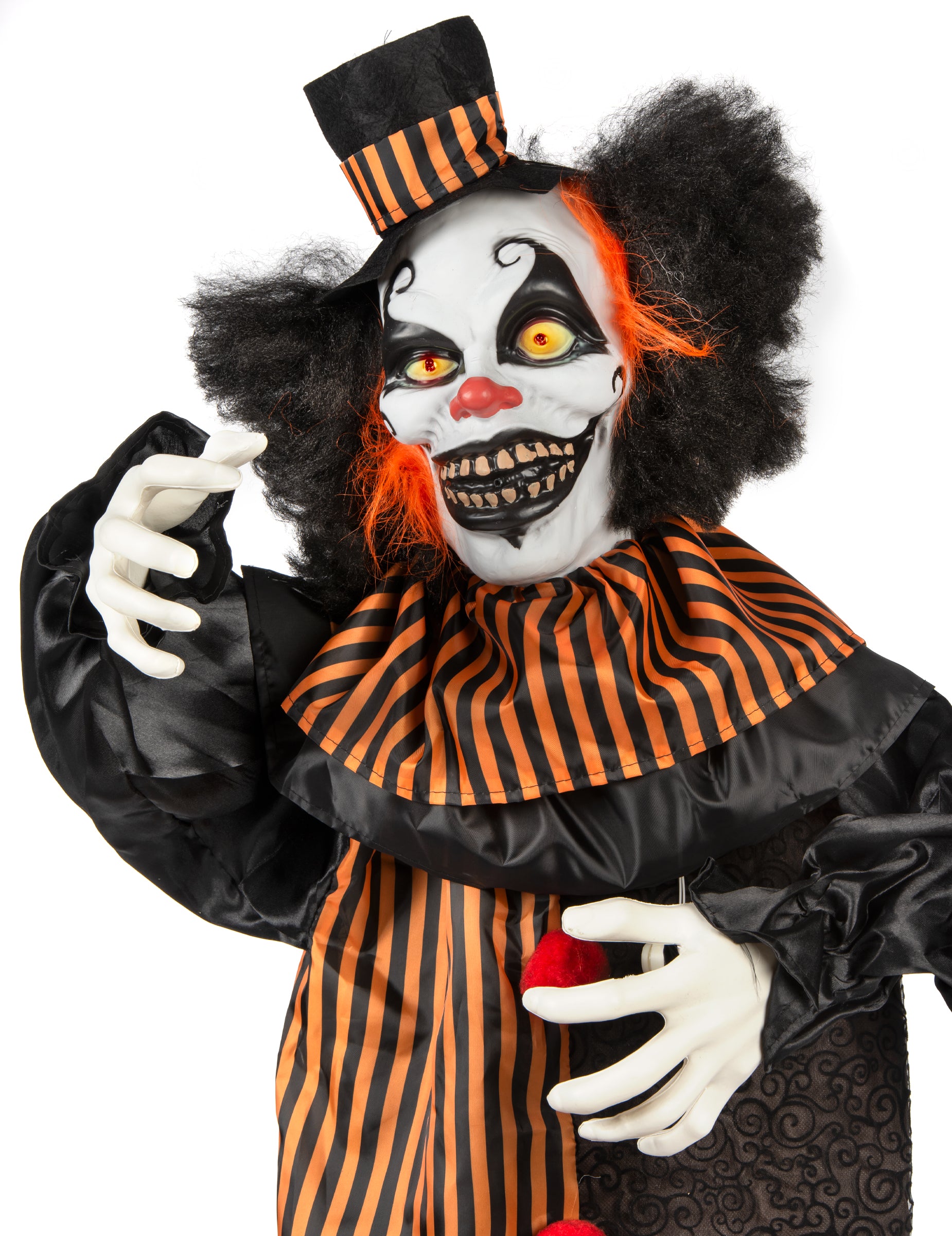 Sa svojih 170 cm Svojom uznemirujućom prisutnošću, ovaj animirani klaun privlači pažnju. Njegova zlokobna šminka, oštri zubi i tamno prugasta odjeća čine ga zastrašujućim stvorenjem. Aktivira se zvukom: ruke mu se pomiču, glava mu se okreće, crvene oči mu se pale, a prodoran vrisak odjekuje prostorijom. Potrebne su 3 AA baterije (uključene). Savršeno za stvaranje jezive atmosfere u vašim ukrasima za Noć vještica.