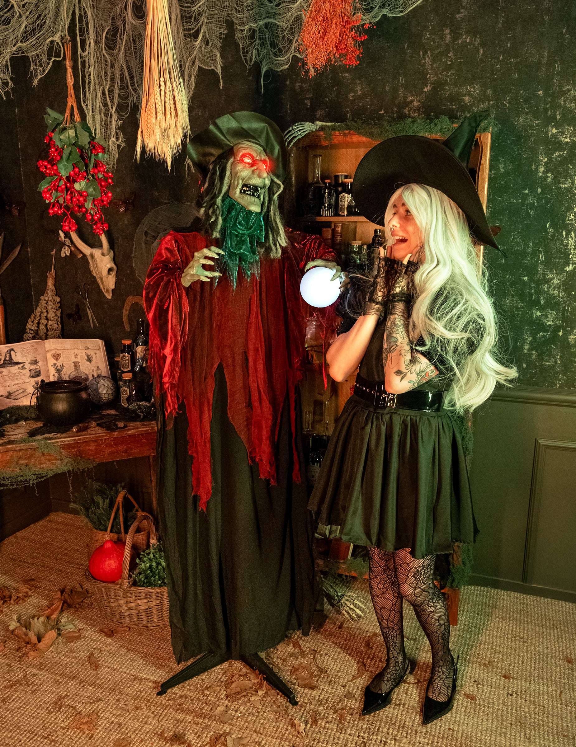 168 visoko cm, Ova animirana vještica privlači pažnju svojom uznemirujućom prisutnošću. Njezino namrgođeno lice, tamna kosa i pohabana ljubičasto-crna odjeća pojačavaju njezinu sliku mračne svećenice. Budi se uz ambijentalne zvukove: glava joj se počinje vrtjeti, ruke joj se pomiču oko njezine svjetleće sfere, a odmah odjekuje zli vrisak. Potrebne su 3 AA baterije (uključene). Živi ukras za nezaboravnu i zastrašujuću večer Noći vještica.