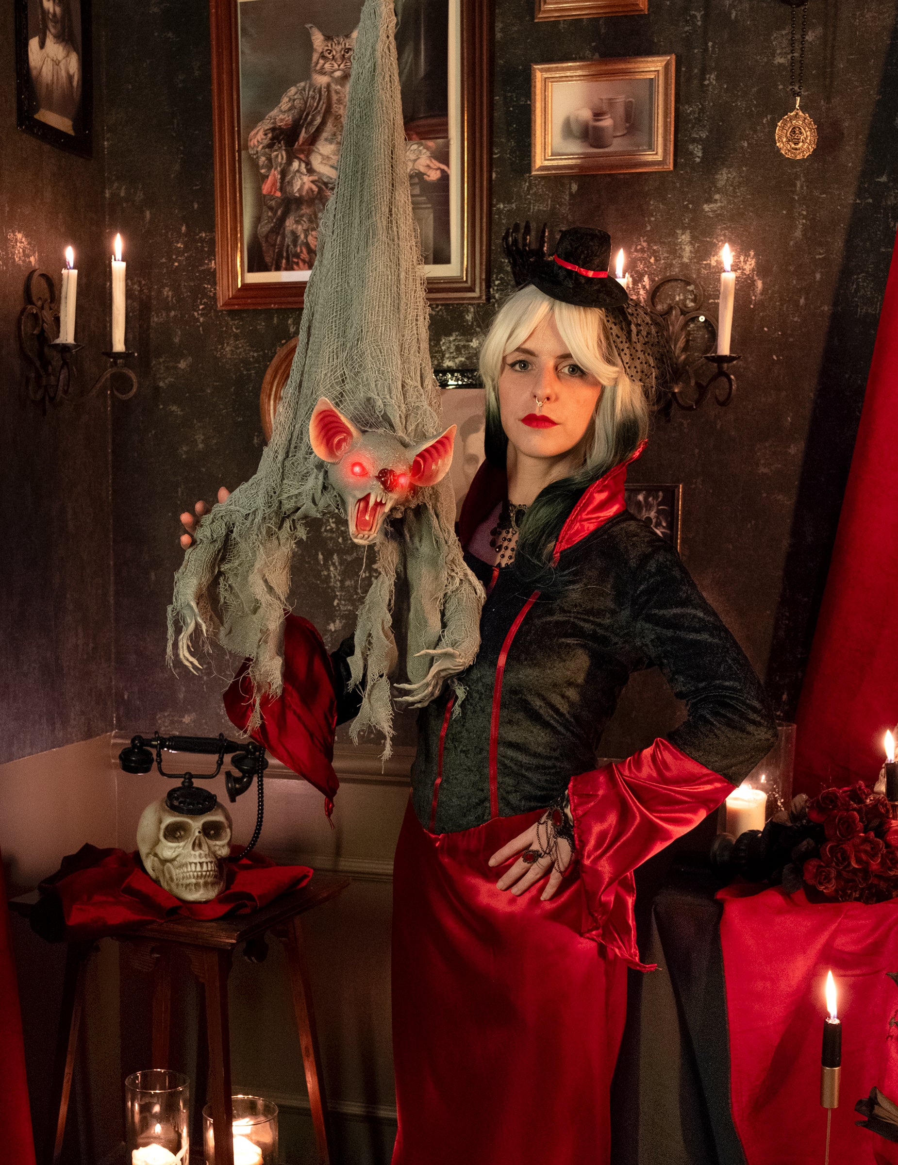 Ovaj animirani šišmiš od 100 cm Ova figura privlači pažnju svojim otrcanim tijelom, istaknutim ušima i sjajnim crvenim očima. Okačena naopako, oživljava čim se detektira zvuk: glava joj se počinje pomicati, ruke joj lepršaju, a izbija zastrašujući vrisak. Njen istrošeni izgled i trzavi pokreti čine je savršenom za upečatljiv vizualni efekt, bilo u zatvorenom prostoru ili na ulazu u mjesto događaja. Potrebne su 3 AA baterije (uključene). Idealna za suspendirane horor scene.