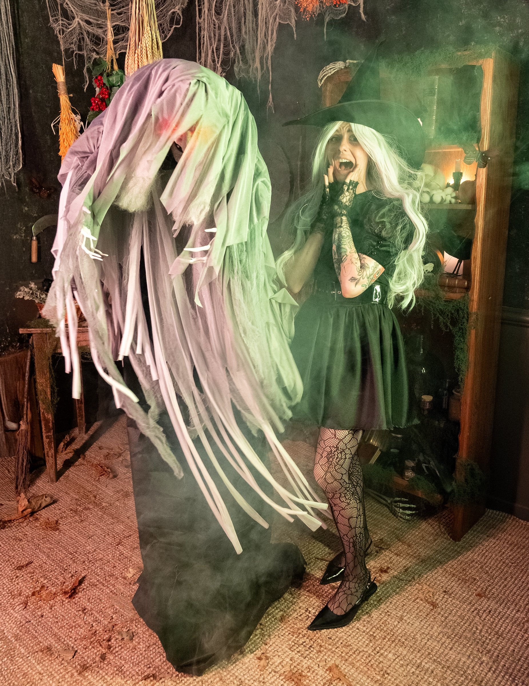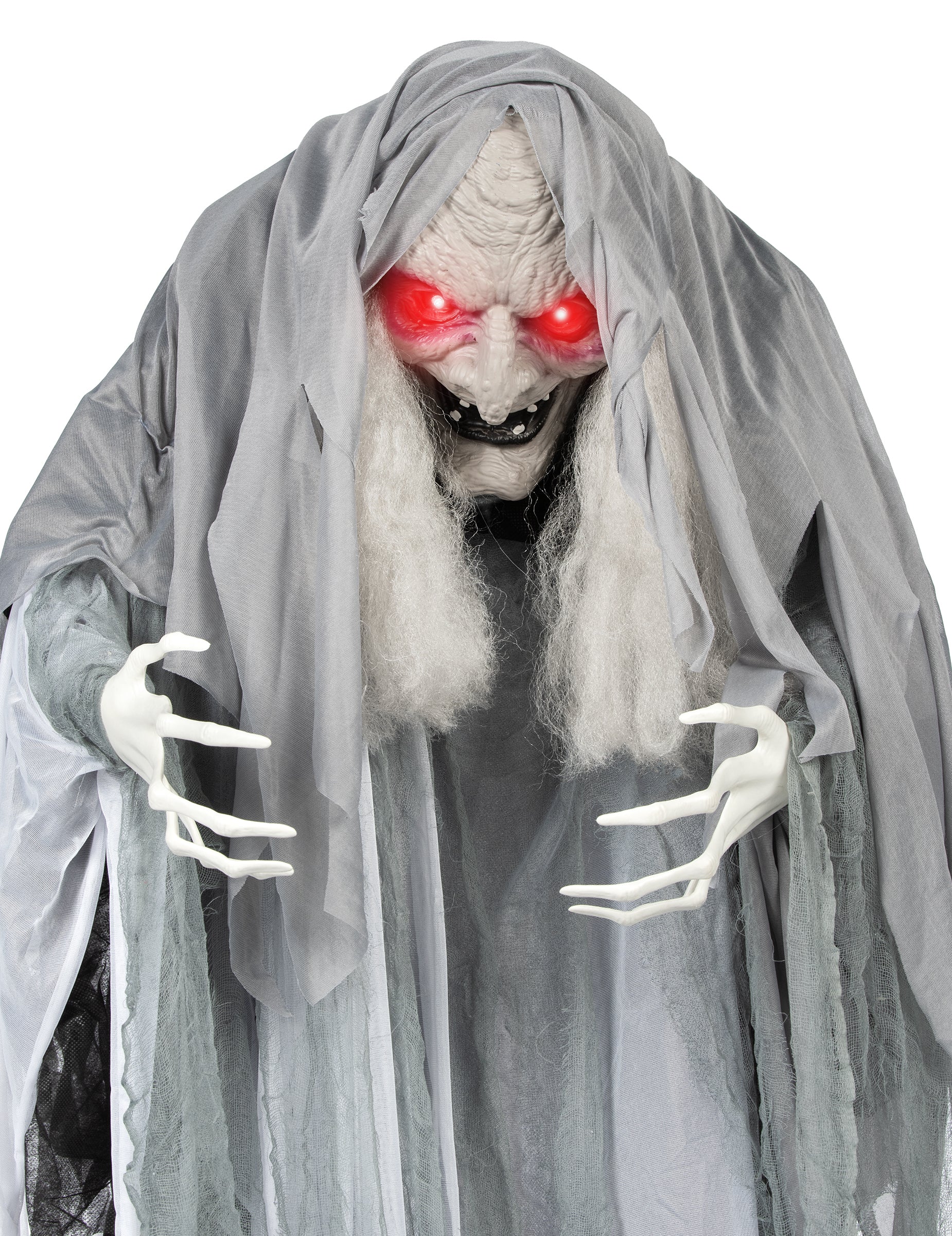 Sa siluetom obavijenom crnom i sivom bojom, ova Animirana Vještica od 160 cm Ova figura nudi zastrašujuću viziju. Njen prodoran pogled, koščate kandže i poderani plašt oživljavaju noćnu moru. Čim se otkrije zvuk, ona se aktivira, njene crvene oči sjaju, a jeziv vrisak izbija, bacajući zrak u drhtaj. Radi na 3 priložene AA baterije i neizostavan je dodatak svakoj jezivoj dekoraciji za Noć vještica.