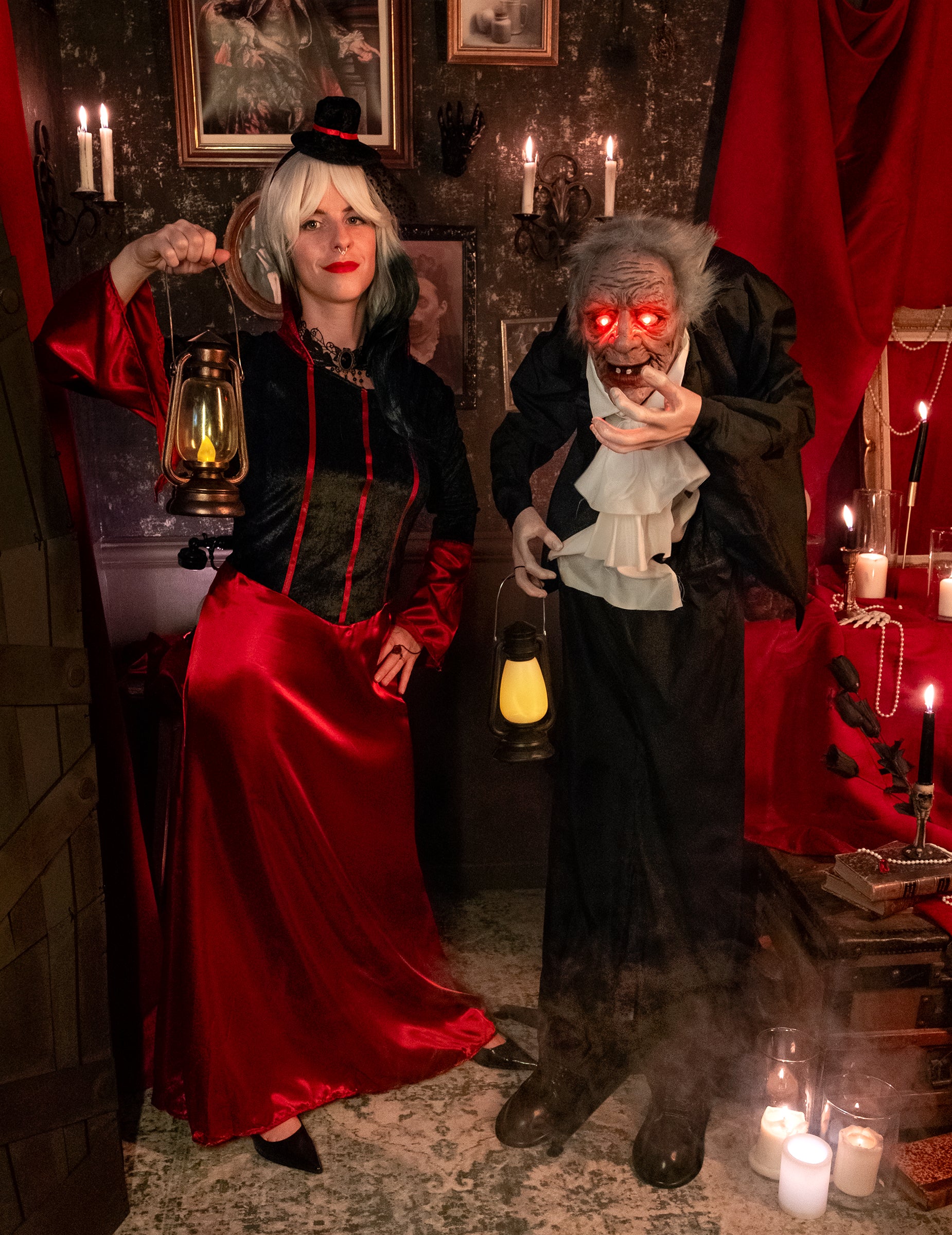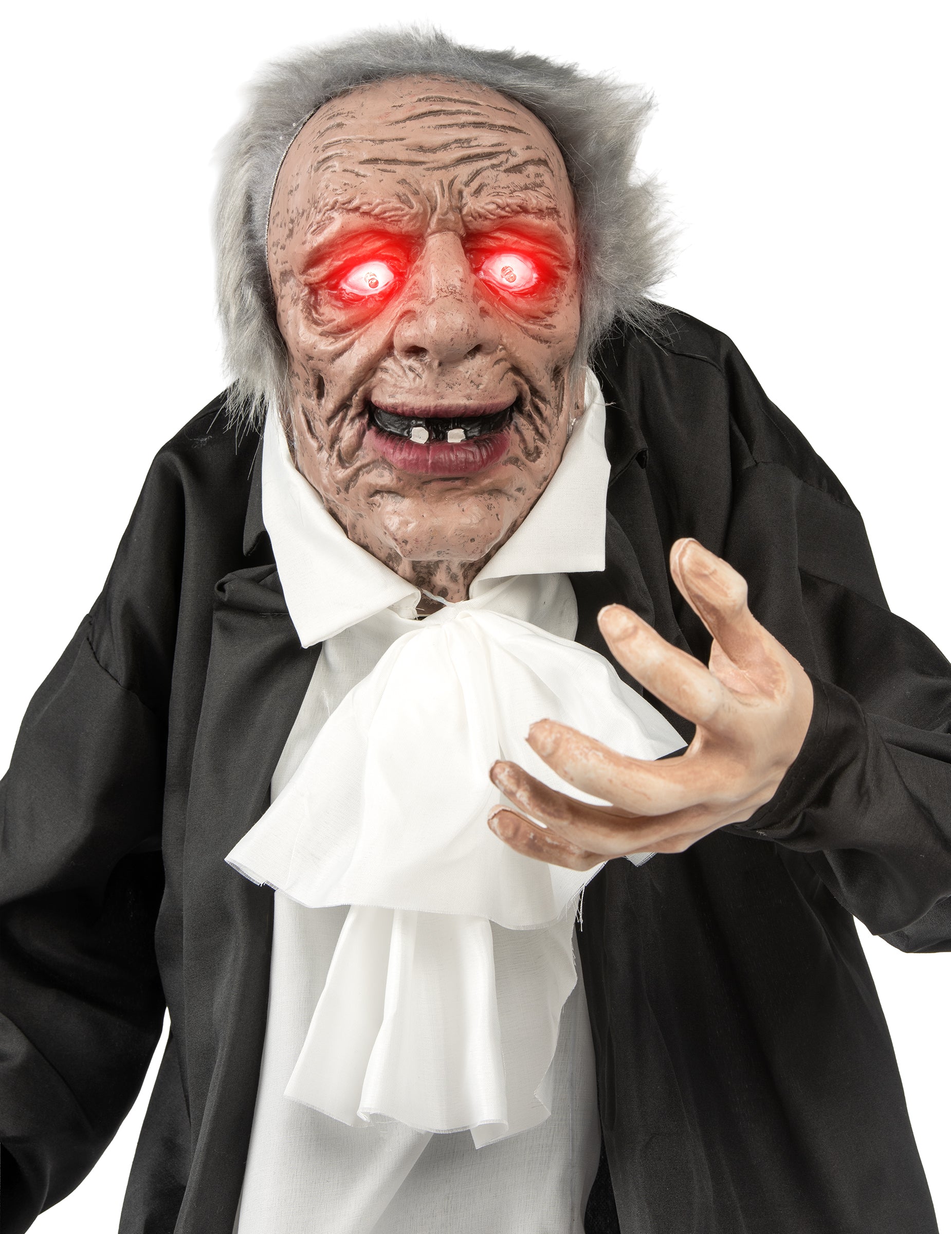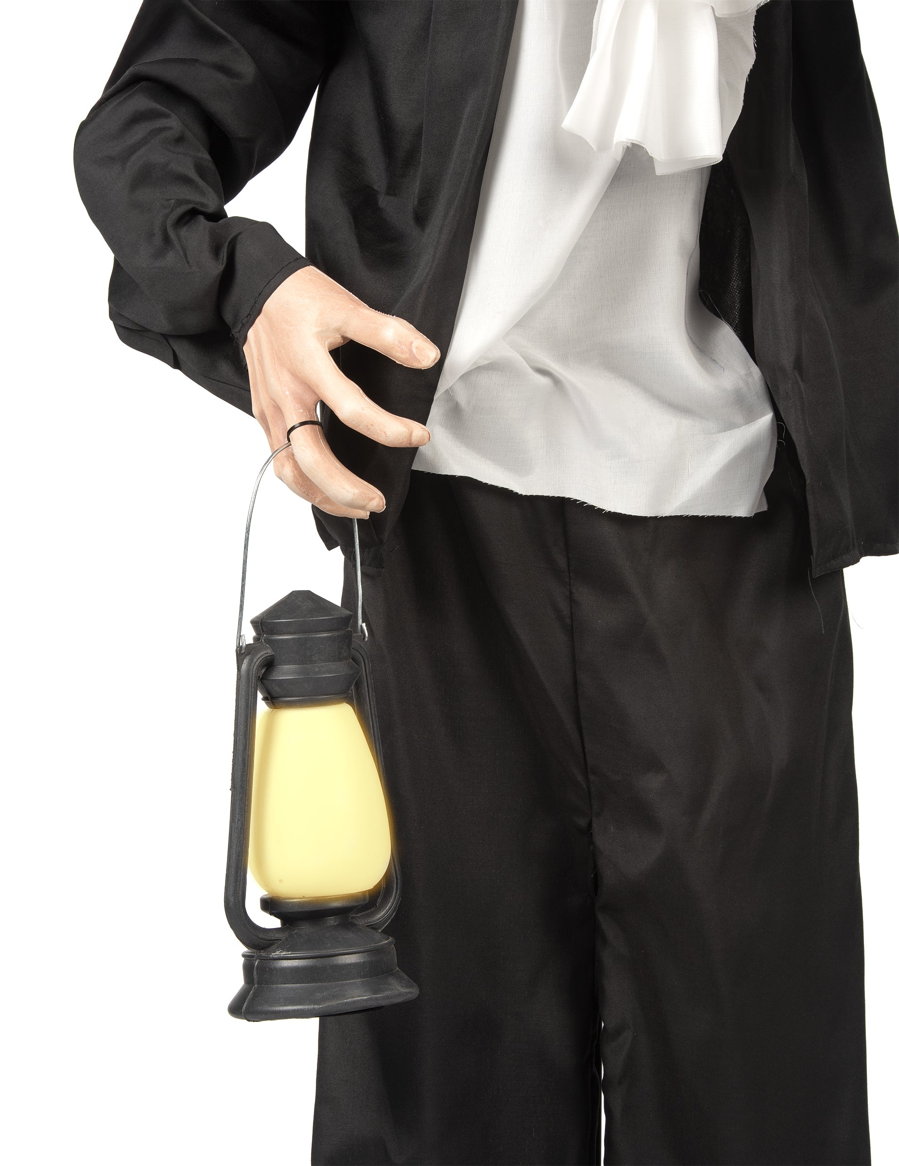Ovaj prokleti čuvar s svjetiljkom, 158 x 120 cm, Pruža uznemirujući osjećaj nadzora nad napuštenim mjestom. Njegovo uznemirujuće lice, umorne crte lica i pogrbljeno držanje odmah izazivaju nepovjerenje. Odjeven u tamnu odjeću u kontrastu s nabranom košuljom, maše tmurnom svjetiljkom spremnom za paljenje. Kad se začuje buka, izbija zlokoban krik, kao da se probudila kletva. Baterije uključene u figuru i njezinu svjetiljku idealne su za aktiviranje ove makabre prisutnosti, savršene za impresivan i zastrašujući prikaz.