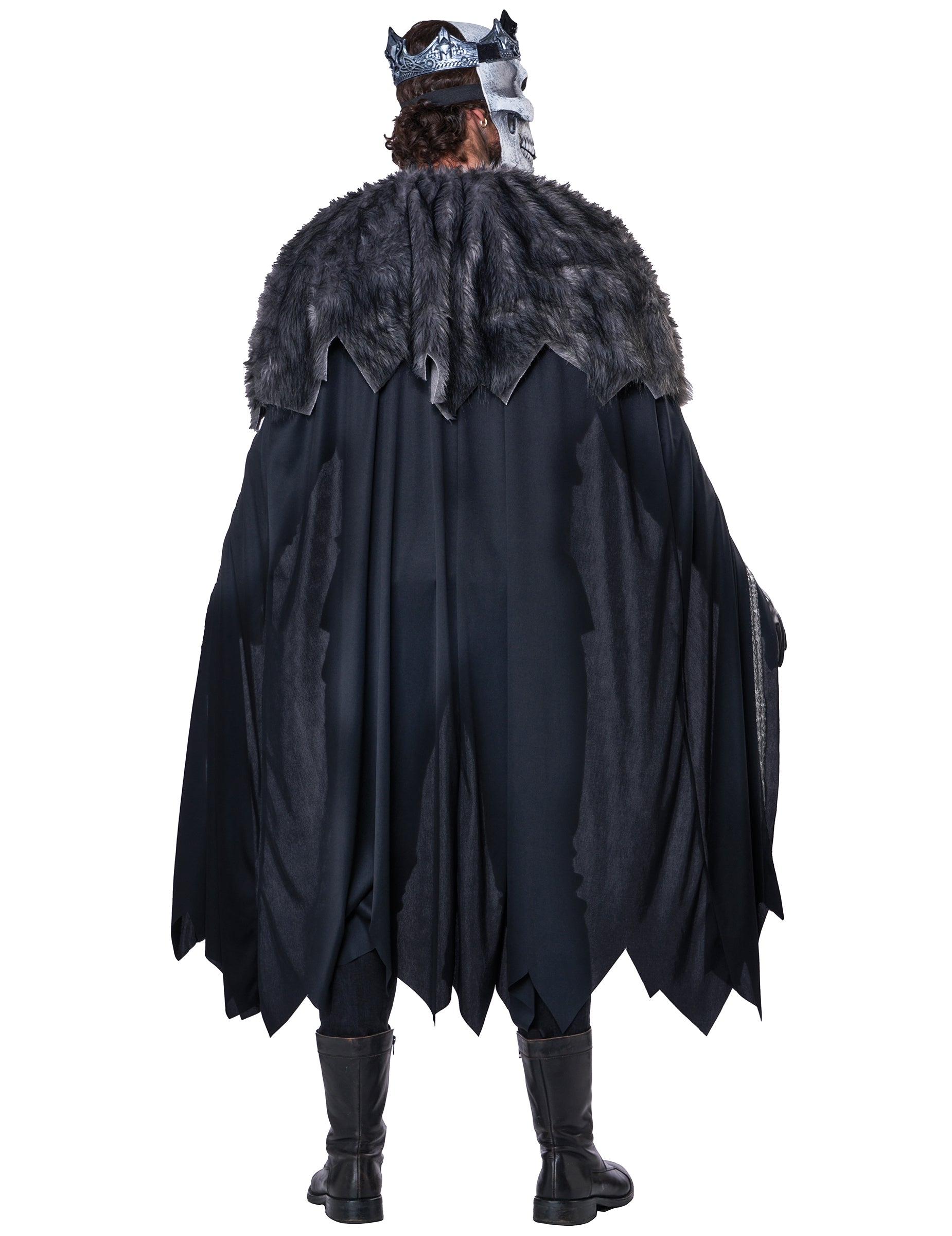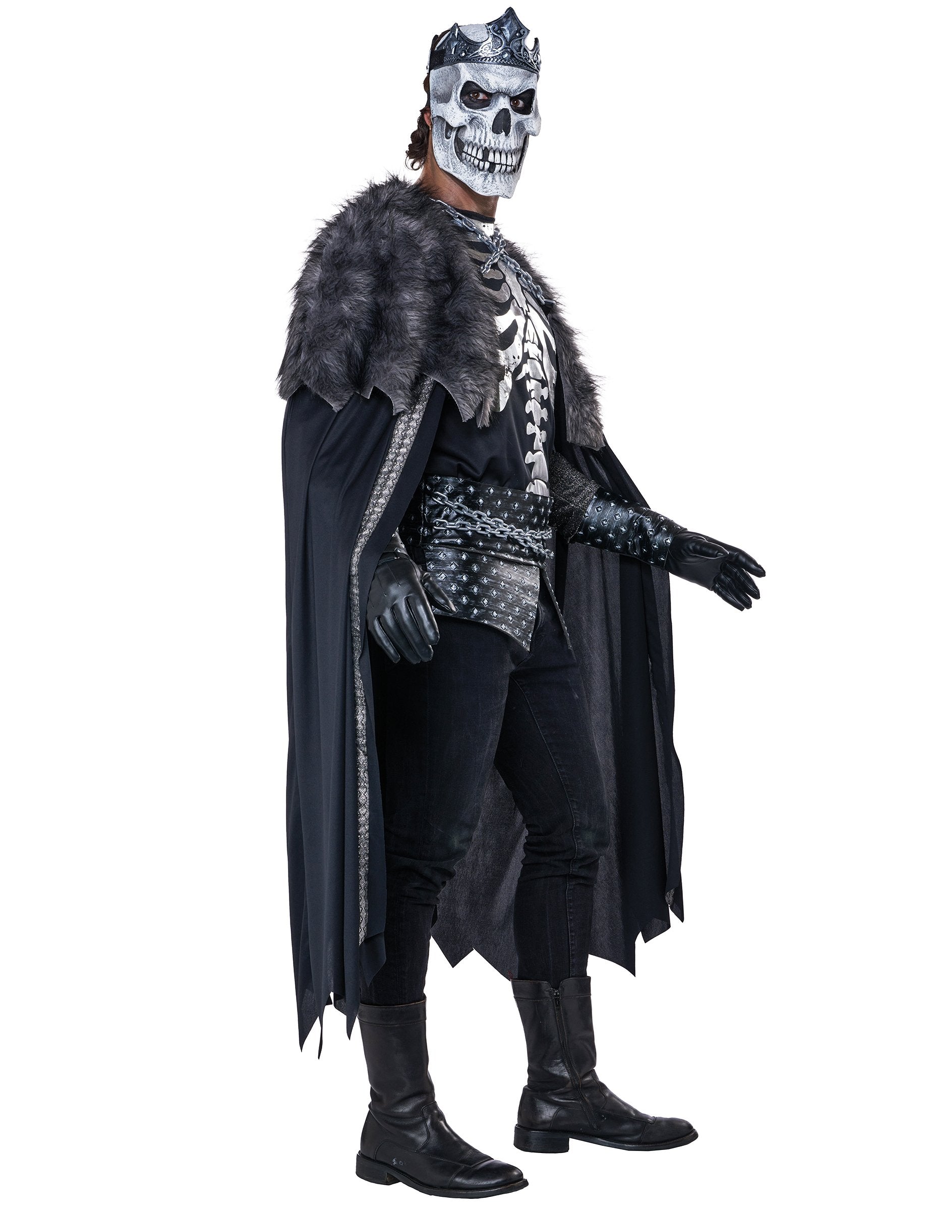 Ce déguisement majestueux et terrifiant vous transforme en un seigneur des ombres, prêt à régner sur l’armée des damnés. Ce déguisement comprend un haut noir orné d’un imprimé argenté représentant un squelette, créant l’illusion d’un torse spectral. Une ceinture à clous métalliques ainsi qu’une paire de manchettes assorties, reprenant les motifs de la ceinture, viennent renforcer le caractère guerrier de cette tenue. La cape longue bordée de fausse fourrure apporte une prestance royale et une allure imposante, tandis que le masque de crâne détaillé avec sa couronne ornée parachève cette transformation macabre. Idéal pour Halloween, une soirée médiévale fantastique, ce costume garantit une apparence effrayante et charismatique. Associez-le à une épée imposante et des gants noirs pour incarner un véritable roi des morts légendaire !