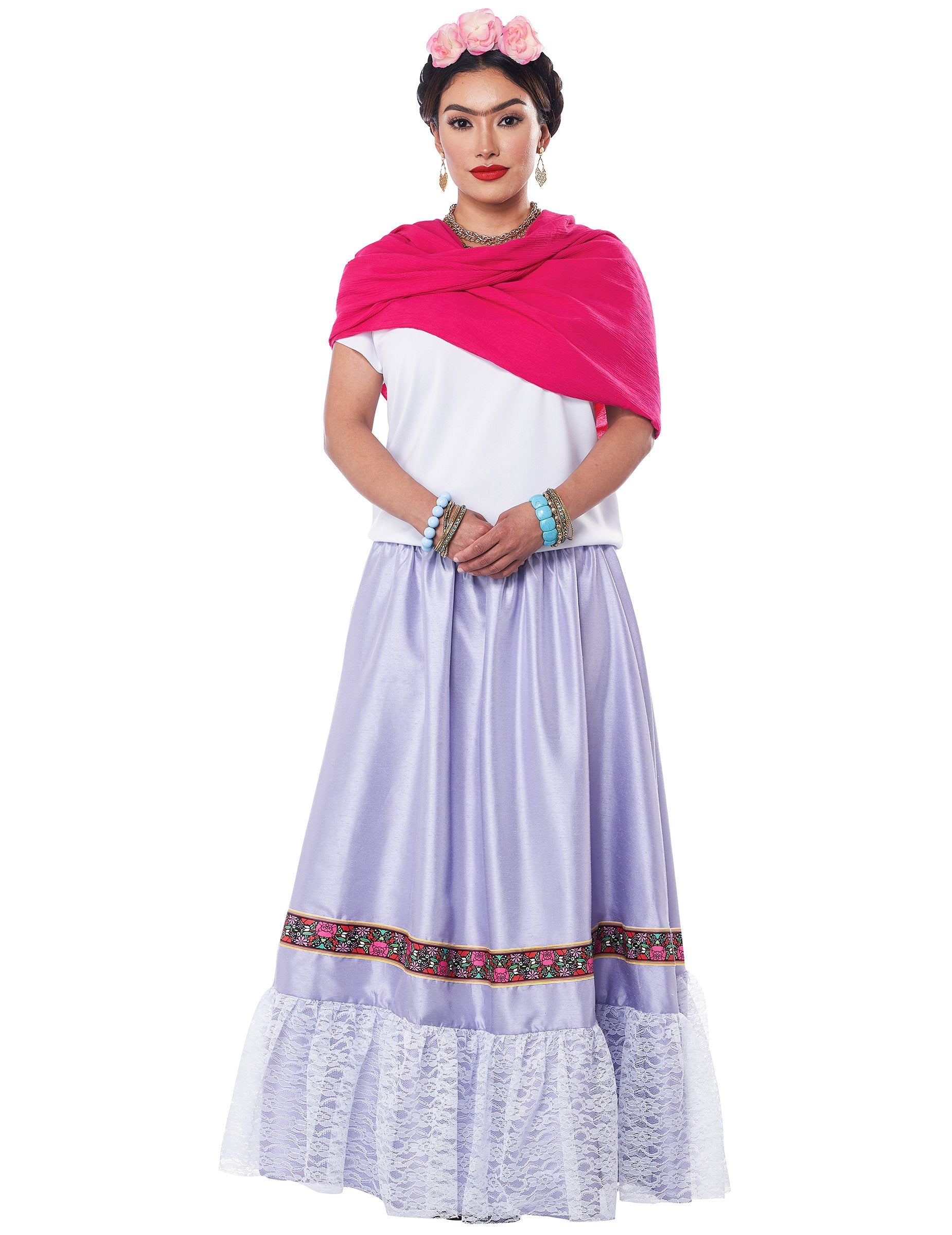 Ce déguisement élégant et coloré vous plonge dans l’univers bohème et artistique d’une célèbre peintre mexicaine. Il comprend une longue jupe fluide ornée de motifs traditionnels, un haut blanc brodé aux détails délicats et un châle rose vif, apportant une touche de charme authentique. Avec son style folklorique et raffiné, ce costume est idéal pour une soirée à thème, un carnaval ou un événement artistique. Complétez votre tenue avec une coiffure tressée ornée de fleurs et quelques accessoires colorés pour un look iconique et inoubliable ! Exprimez votre créativité et votre amour pour l’art avec ce magnifique déguisement d’artiste mexicaine !