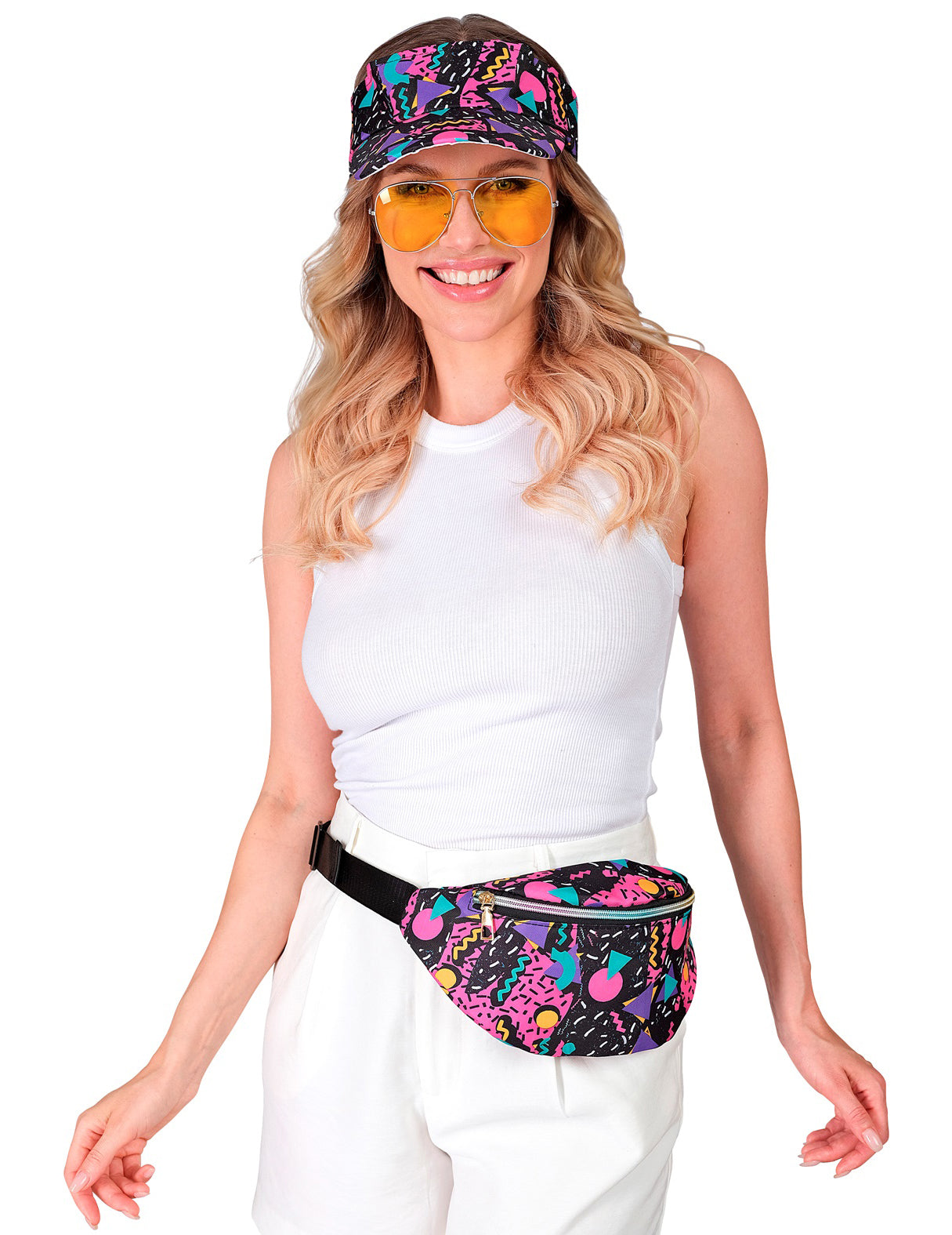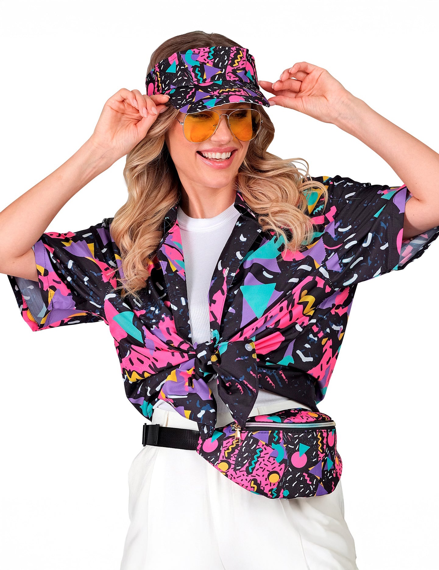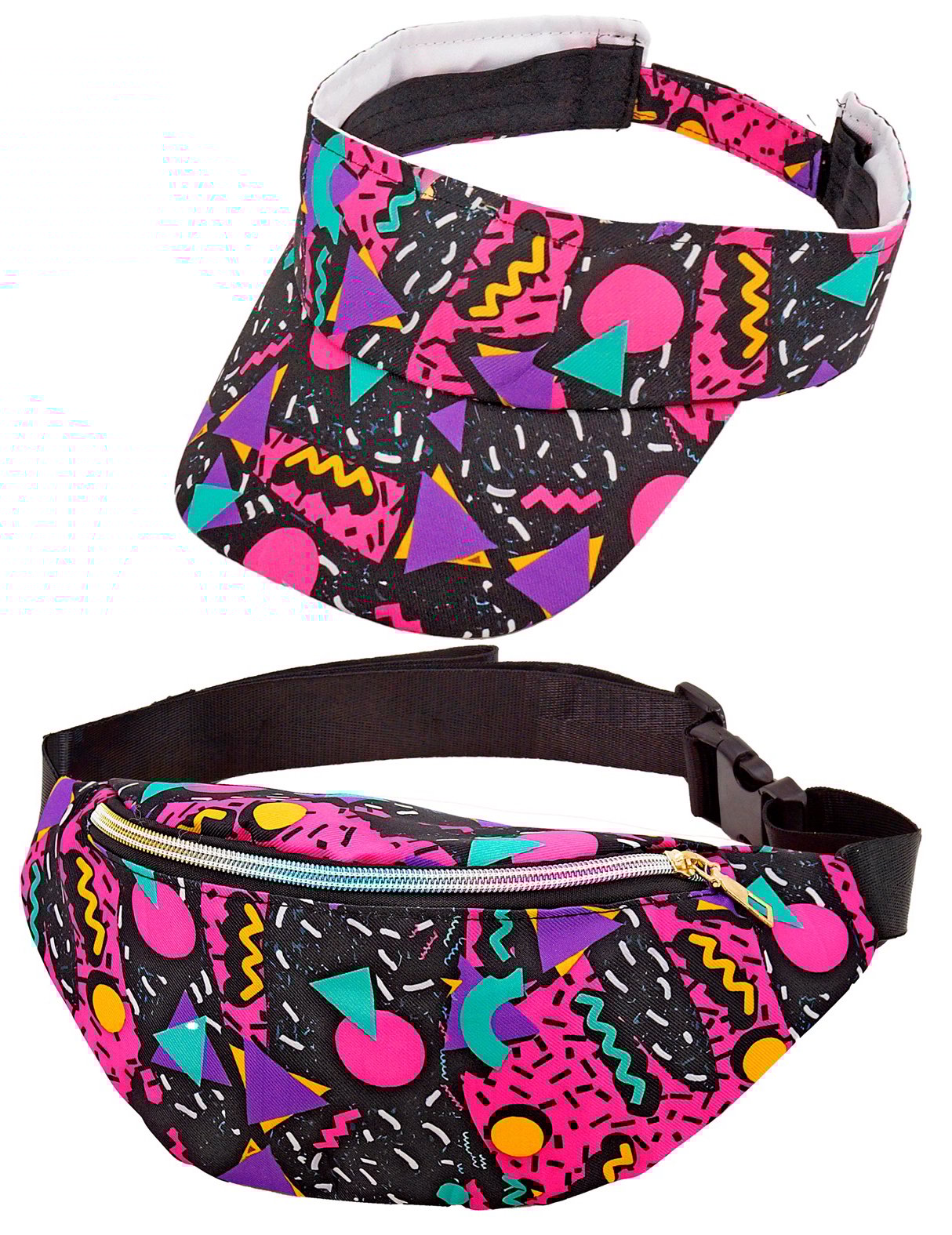 Dodajte retro dašak svojoj odjevnoj kombinaciji s ovim šilterom i odgovarajućom torbicom oko struka, inspiriranim 90-ima. Lagane i udobne, imaju šareni geometrijski print na crnoj pozadini, sa živim nijansama poput ružičaste, ljubičaste i tirkizne, tipičnim za to doba. Šilter savršeno nadopunjuje ležeran izgled, a istovremeno dodaje vintage dodir. Odgovarajuća torbica oko struka, praktična i jednostavna za nošenje, drži vaše osnovne stvari pri ruci, a istovremeno dodaje moderan dodir. Savršeni za tematsku zabavu, festival ili ljetnu proslavu, ovi modni dodaci idealni su za ležerno šik retro izgled.