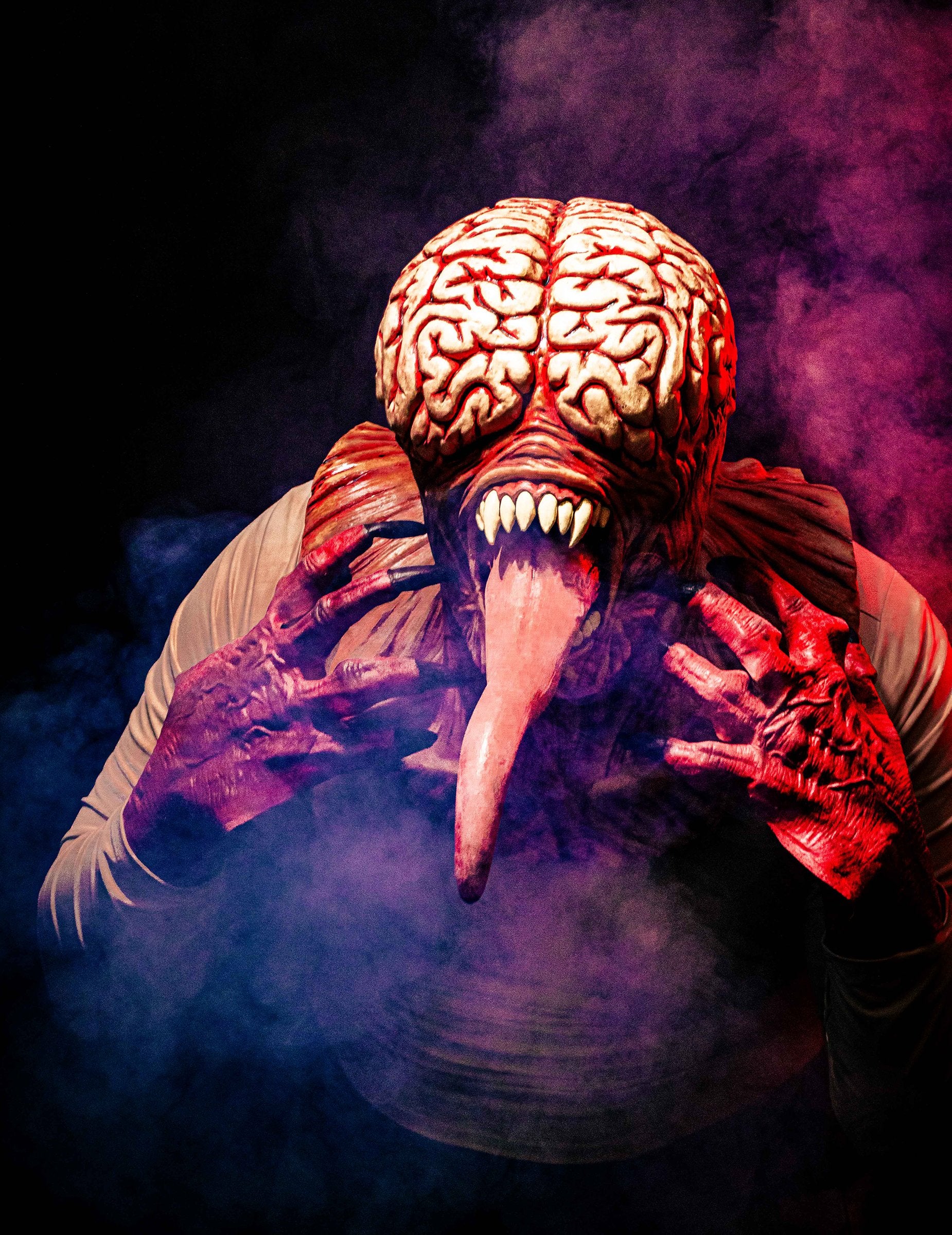 Ova maska ​​s punim licem pretvara vas u zastrašujuće čudovište s prividnim mozgom. Sa svojom čvrstom kožom, mučenim ustima oštrim zubima i dugim viskoznim jezikom, čini se ravno iz neuspjelog eksperimenta ili paklenog svijeta. Njegova otvorena lubanja koja otkriva detaljan mozak, s natečenim venama i crvenim nijansama, pojačava njegov zastrašujući izgled. Realna tekstura i pažljiva završna obrada ostavljaju dojam sirovog mesa, što ovu ultra realističnu masku čini još hladnijom. Potpuno pokrivajući glavu i gornji torzo, ova horor maska ​​idealna je za Noć vještica, sablasnu zabavu ili tematski događaj. S njim se igrajte kao gadost koja izlazi iz dubine užasa!