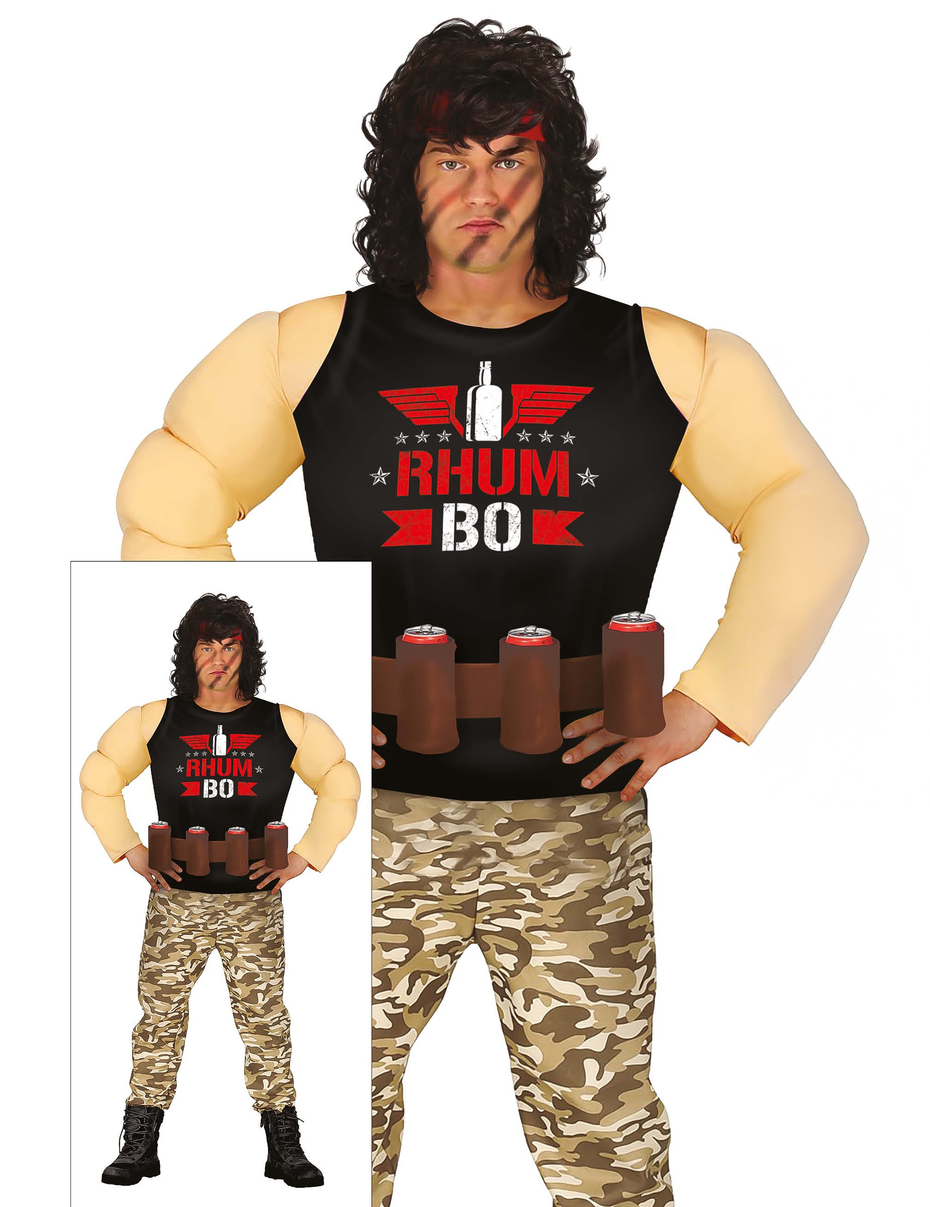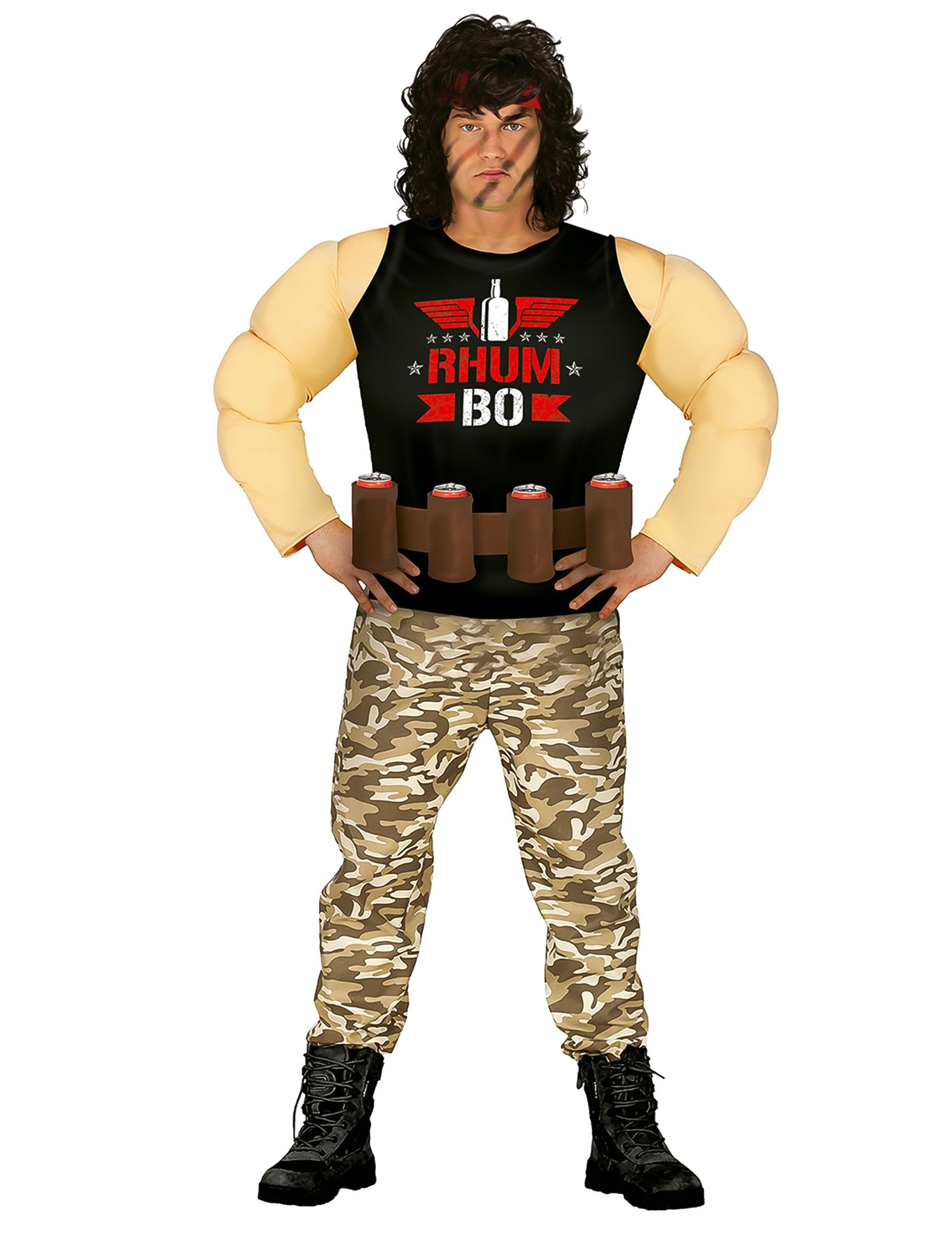 Ovaj Rhum Bo kostim za odrasle sastoji se od crne majice s podstavljenim mišićima, maskirnih hlača i pojasa s držačem za čaše kako biste uvijek imali piće pri ruci.