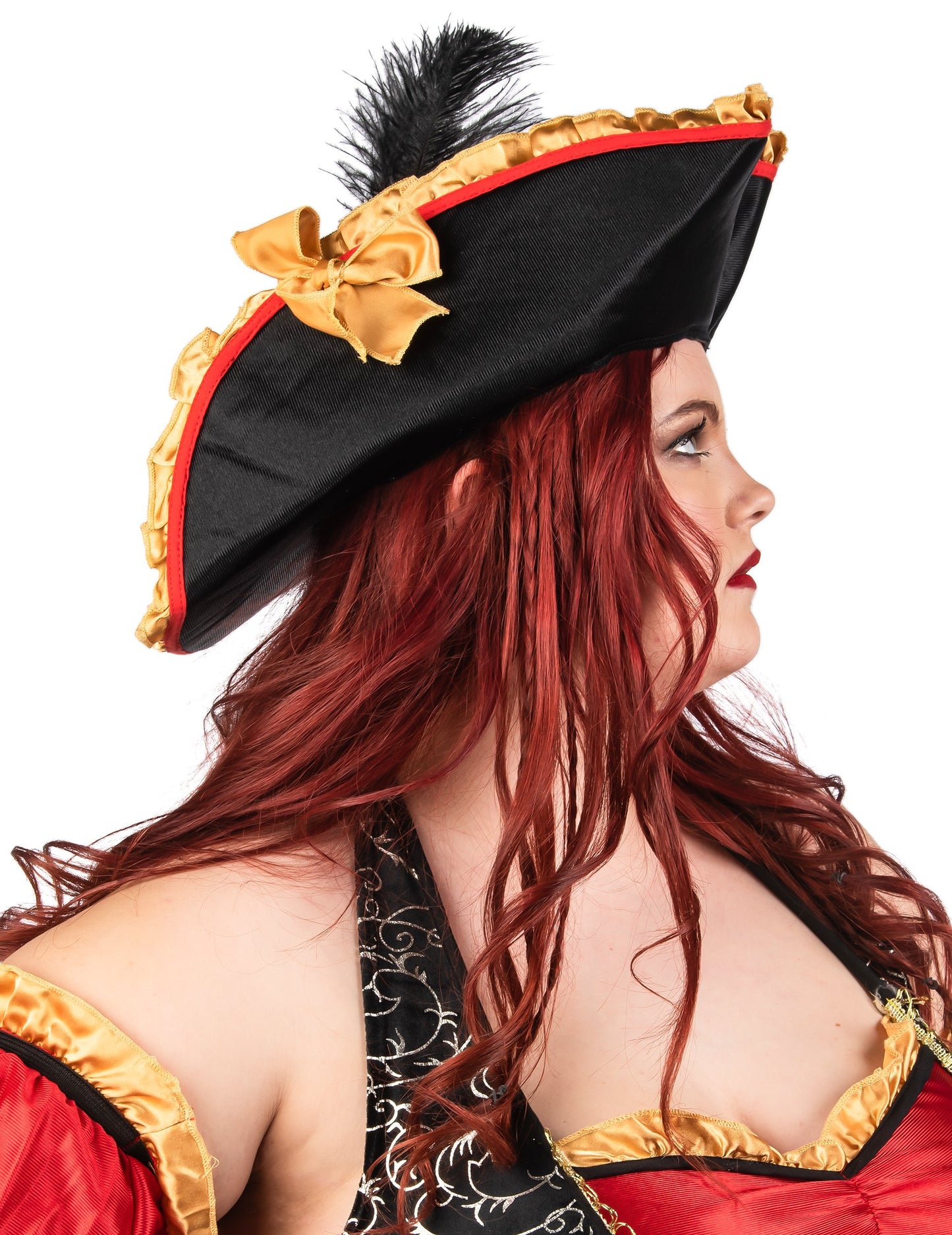 Ovaj veliki, veliki luksuzni crveni gusarski kostim za žene sastoji se od haljine, tricorne, dva rukava, pojasa i stipendije. Haljina elegantno miješa intenzivne crvene i zlatne barokne uzorke na crnoj pozadini, ističući stil koji je i odvažan i rafiniran. Puhasti rukavi i prugasta suknja donose glasnoću i lik u ovu odjeću nadahnutu piratstvom. Tricorne na zlatnom rubu, pojas Corset Effect i mala potpora nadopunjuju ovaj plameni kapetanski izgled. Idealan kostim za utjelovljenje legendarnog gusara tijekom karnevala, kostim večeri ili festivala s morskom temom.