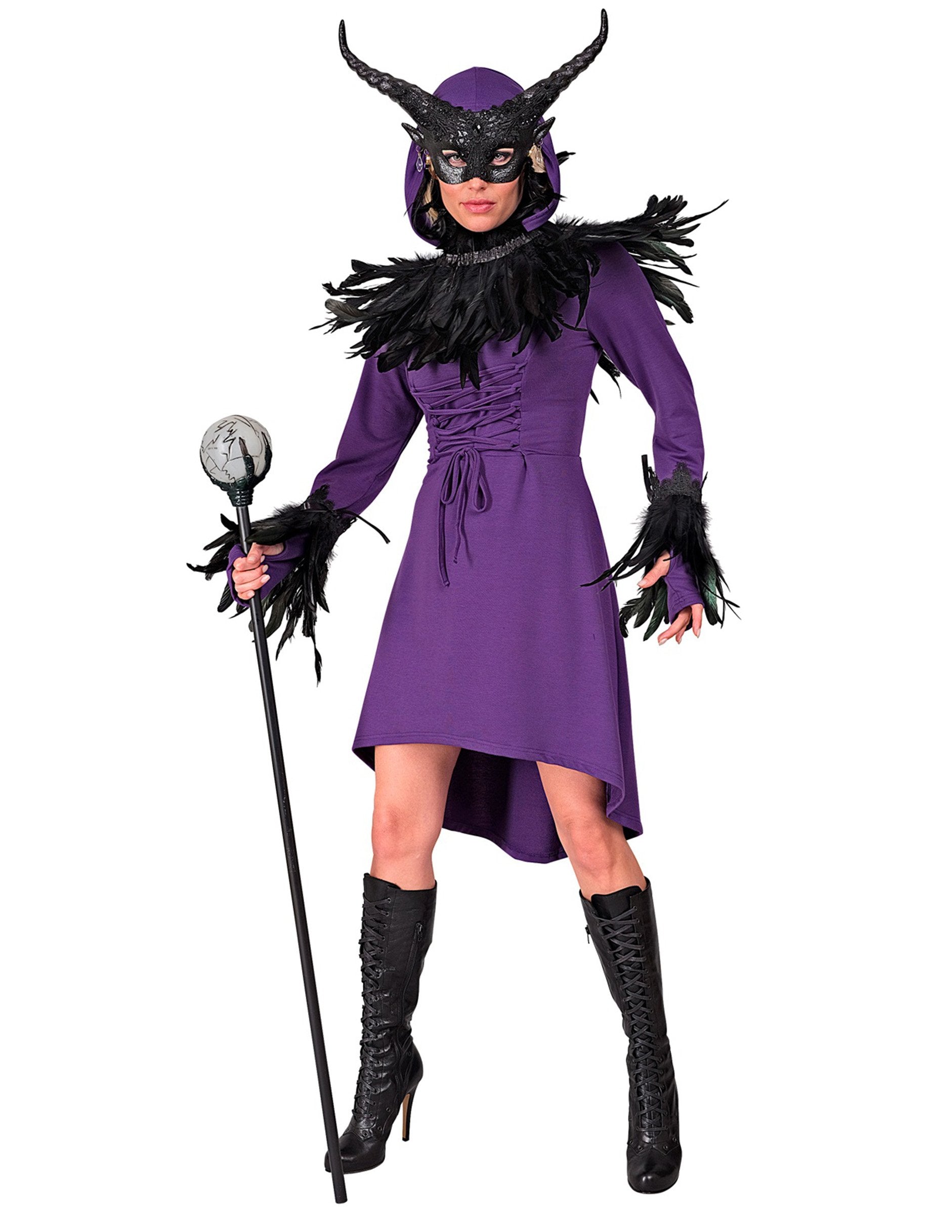 Ova ljubičasta srednjovjekovna gotička haljina za žene dizajnirana je u tekućoj tkanini s elegantnim, lagano osvijetljenim rezom. Sastoji se od haljine s integriranom haubom, s kravatom na prednjoj strani koja ističe struk. Dugi rukavi i asimetrični rez na stražnjoj strani dodaju dramatičan dodir ansamblu. Idealno za vješticu, srednjovjekovnu plemenitu ili kostim mističnog stvorenja, ova haljina bit će savršena za Noć vještica, gotičku večer ili srednjovjekovni događaj.