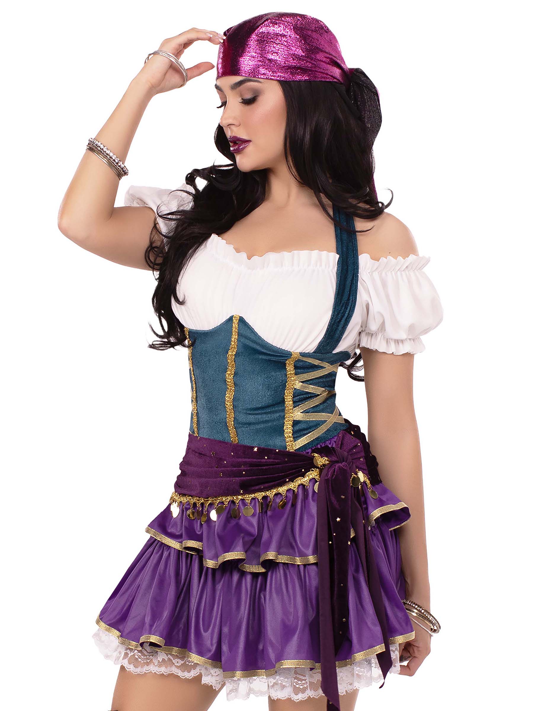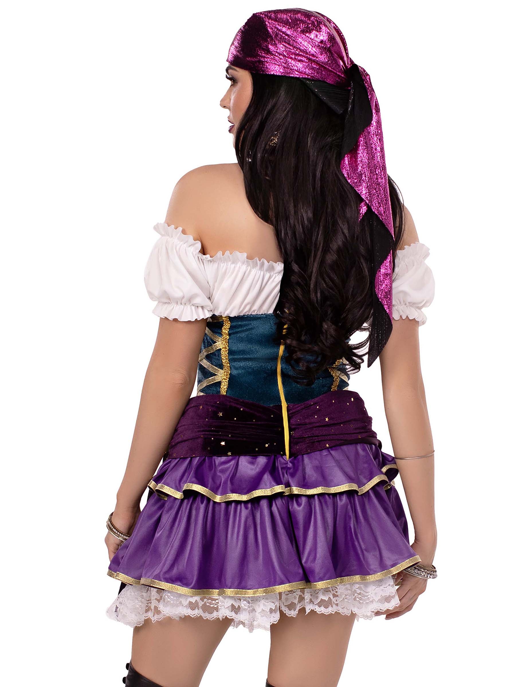 Ovaj seksi luksuzni boemski kostim za žene sastoji se od kratke, opremljene haljine, s diskretnim zip -om u leđima za jednostavno stavljanje. Bustier imitira namočenu bodicu, dok ljubičasta suknja zaluđena oživljava sa satenskim istaknutim sadržajima. Pojas ukrašen metalnim komadima ušije se u cjelinu kako bi se bokovi istaknuli sjaj. Odgovarajuća sjajna traka za glavu, nošena na glavi, dodaje završni dodir ovom očaravajućem izgledu. Savršeno za utjelovljenje tajanstvenog i zavodljivog boema tijekom vaših tematskih večeri.