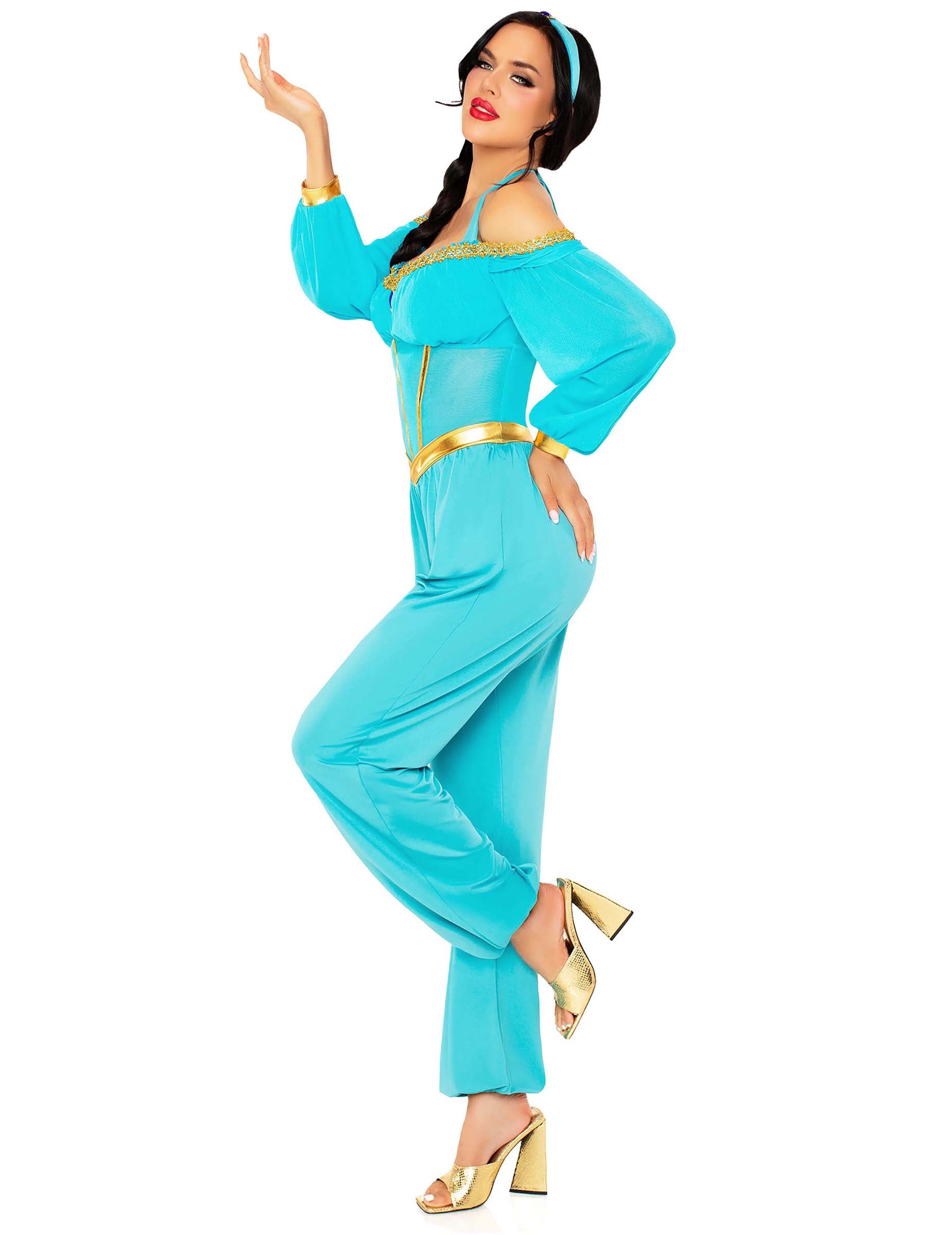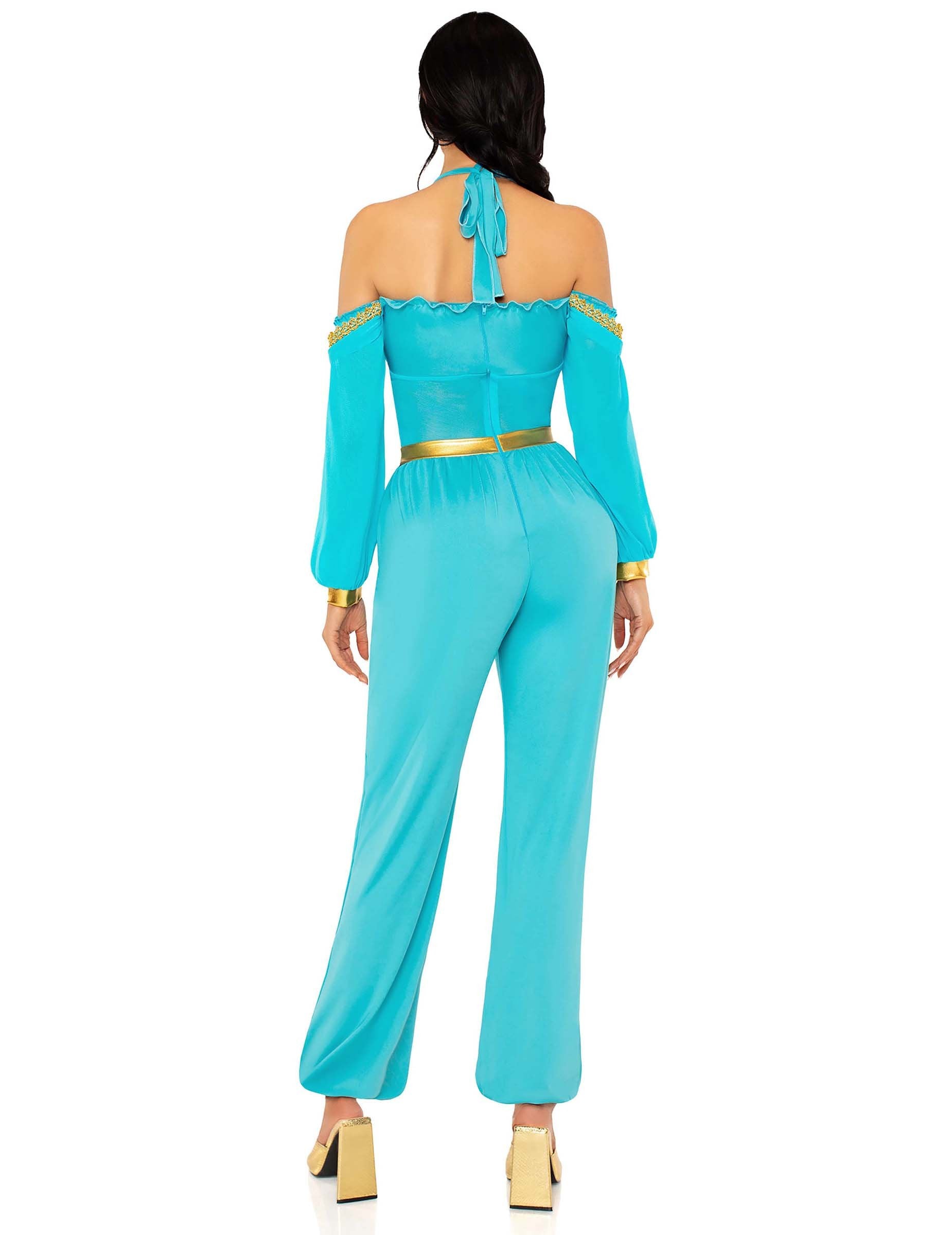 Ovaj kostim orijentalne princeze u plavoj i zlatnoj boji za žene sastoji se od lepršavog tirkizno plavog kombinezona, ukrašenog blistavim zlatnim završecima. Prsni dio, oblikovan zlatnim kosim detaljima i ljubičastim kamenom u sredini, elegantno ističe siluetu. Dugi puf rukavi s otkrivenim ramenima dodaju gracioznu notu kompletu.