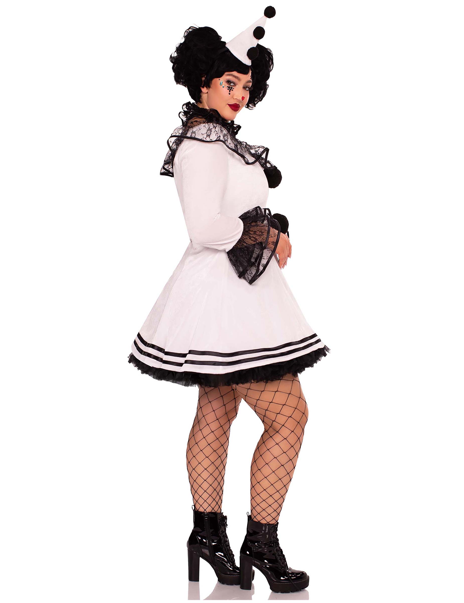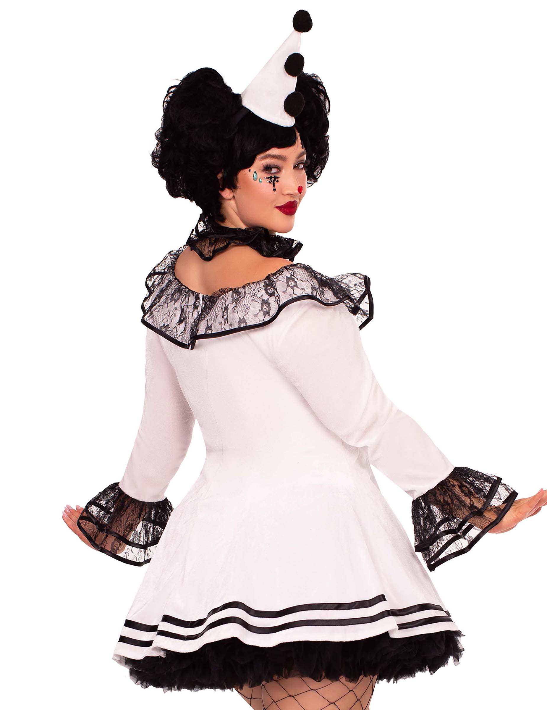 Ovaj bijeli kostim Pierrot za žene plus veličine sastoji se od kratke haljine ukrašene crnim pompomima, o ovratnikom Petera Pan -a i usklađenom šeširom. Svojom izrezanom izrezanom i opuštenom bazom, haljina evocira svijet drevnog cirkusa dok elegantno ističe siluetu. Kontrastne pom-poms na prednjoj strani dodaju klasičan dodir, dok crne detalje o čipkama na rukavima i dekolteu dodaju tajanstveni šarm. Opetani ovratnik i mini šiljasti šešir dovršavaju ovaj jedinstveni izgled, savršen za utjelovljenje lika koji je i uznemirujući i fascinantan, između snova i uzbuđenja. Idealna odjeća za kostim ili za vaš sljedeći Noć vještica!
