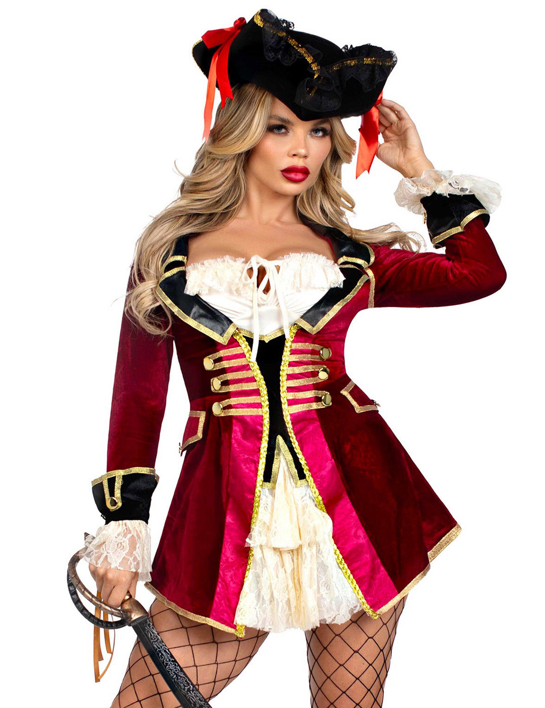 Ovaj kostim gusarice za žene sastoji se od kratke baršunaste haljine u bordo boji, ukrašene bijelom čipkom i sofisticiranim zlatnim detaljima.