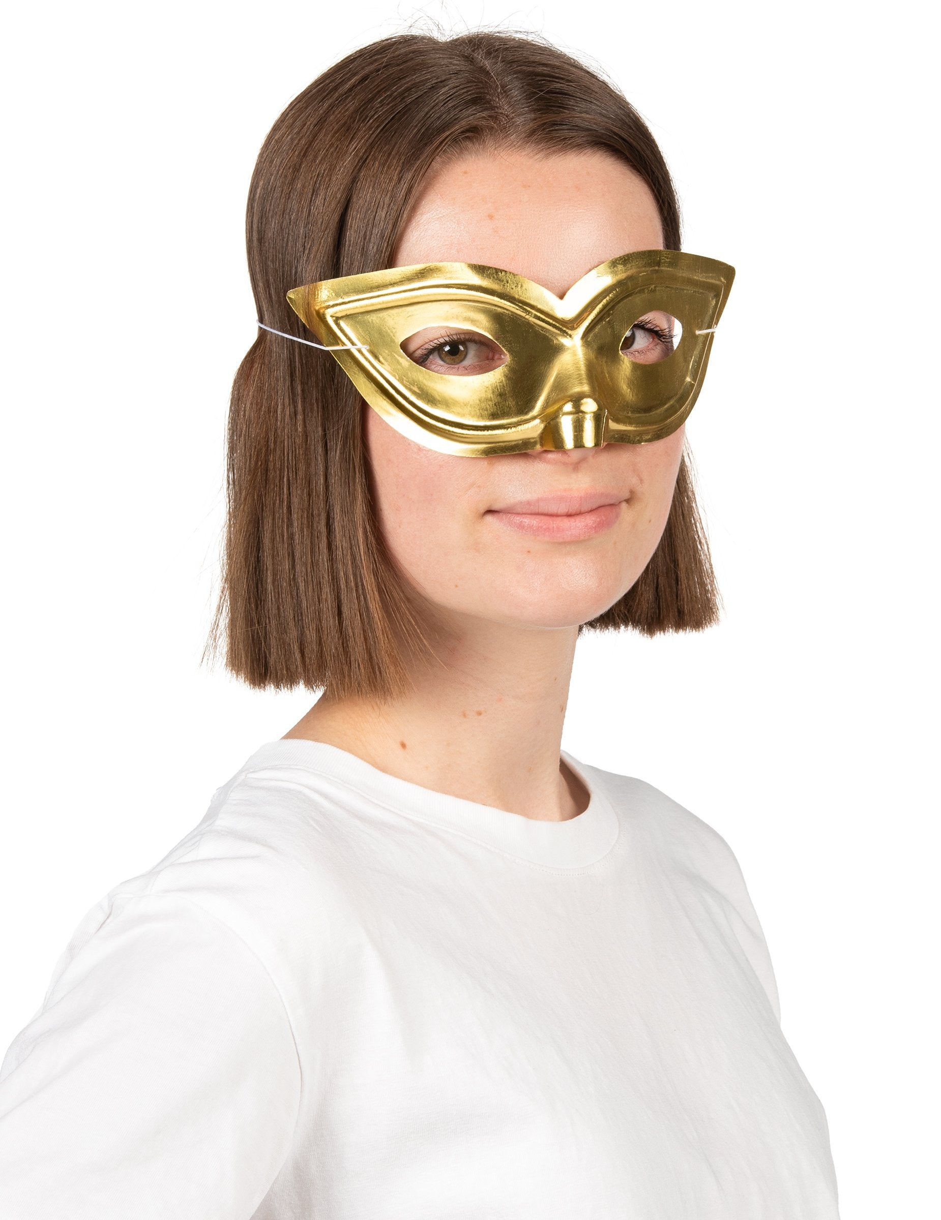 Ova svjetlucava zlatna maska za odrasle izrađena je od tanke plastike s metalnim završetkom za blistav i elegantan efekt. Njezin elegantni oblik prati konture lica i lako se pričvršćuje diskretnom elastičnom trakom, osiguravajući udobno pristajanje tijekom cijele večeri. Savršen dodatak za upotpunjavanje odjevne kombinacije za maskenbal, karneval ili kostimiranu zabavu, a istovremeno će vašem izgledu dodati blistav dašak zlatne boje.