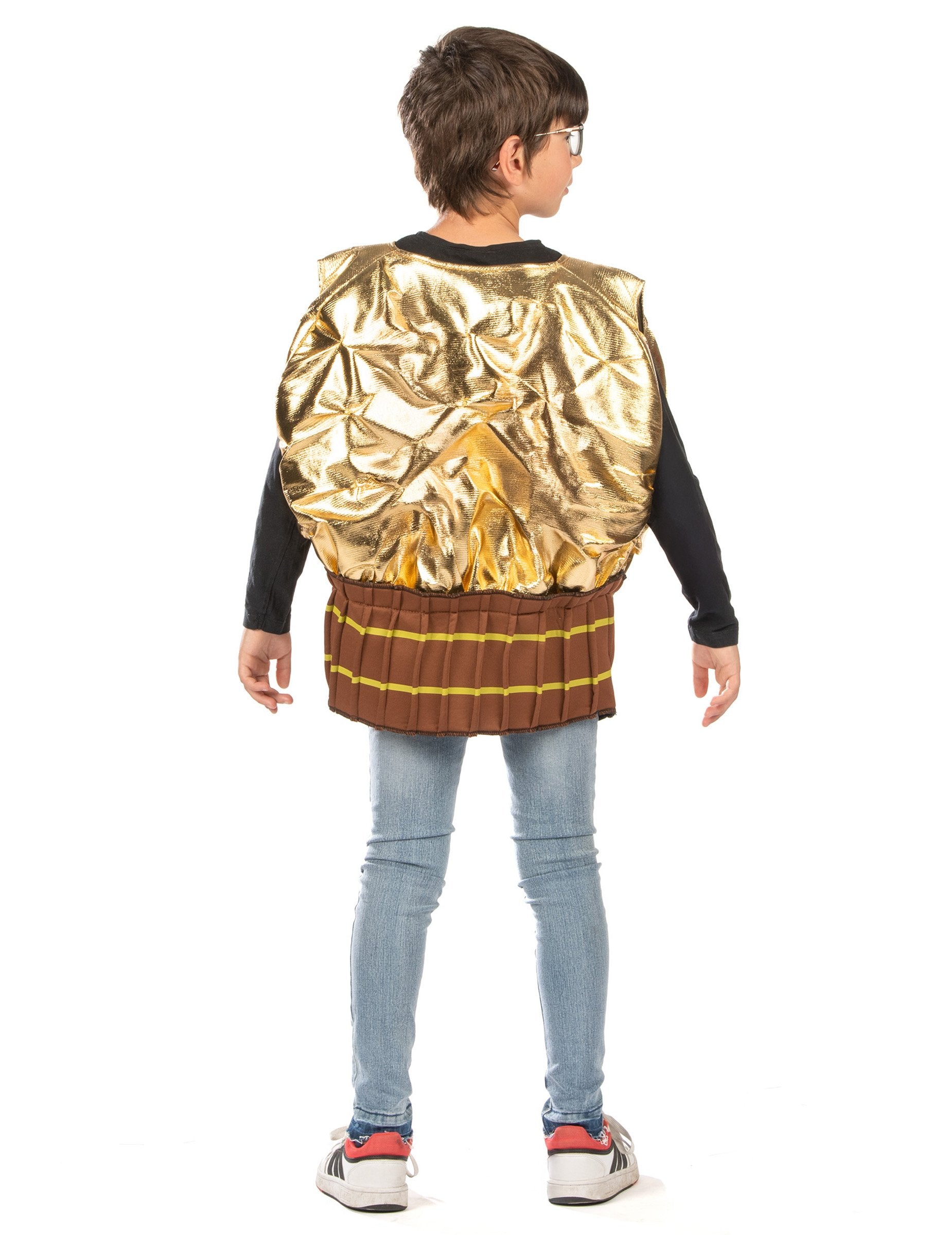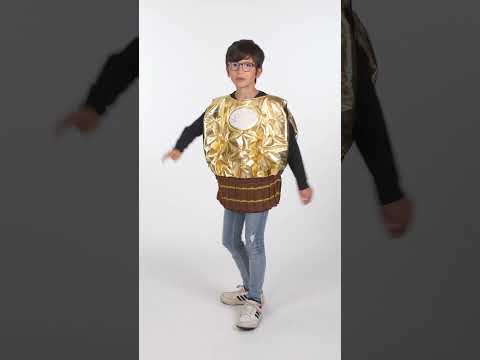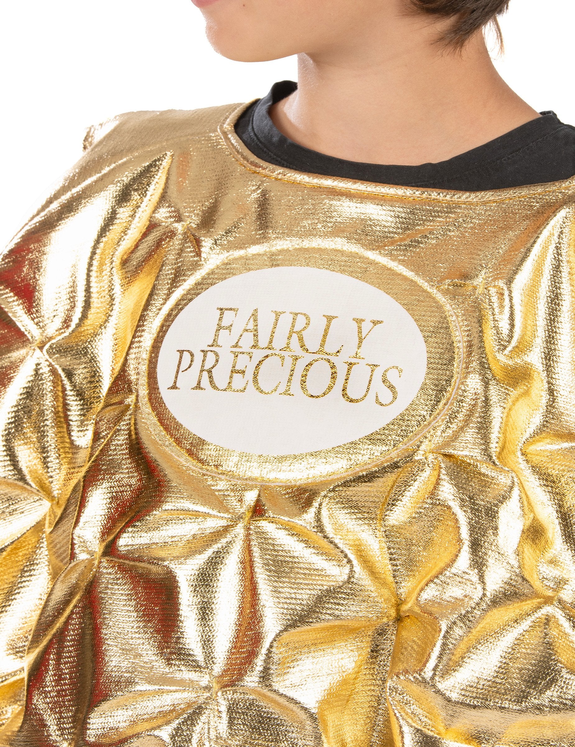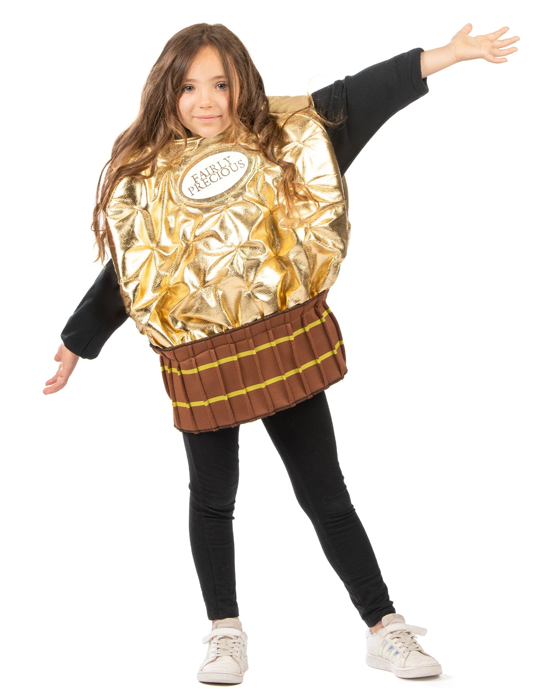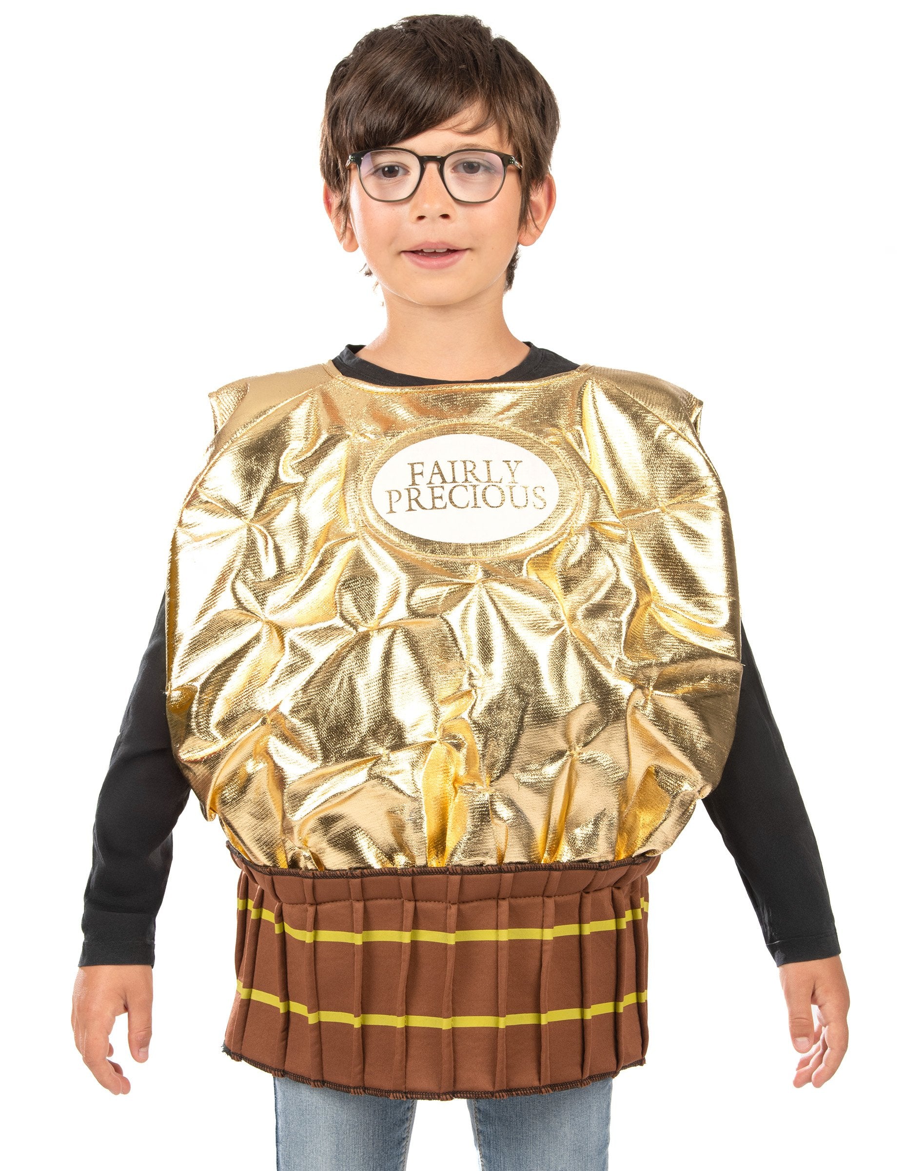 Ovaj zlatni kostim slatkiša za djecu jedinstveni je kombinezon u obliku sjajne čokoladne kutije. Gornji dio kostima je metalik zlatne boje za blistav i svečan efekt. Središnji krug s natpisom "Fairly Precious" ukrašava prednju stranu. Donji dio je smeđe boje, s dvije zlatne pruge koje upotpunjuju primamljiv izgled. Zahvaljujući praktičnim otvorima za glavu, ruke i noge, ovaj kostim se lako oblači s vrha. Savršen kostim za neodoljivu čokoladu na rođendanskoj zabavi ili karnevalu!