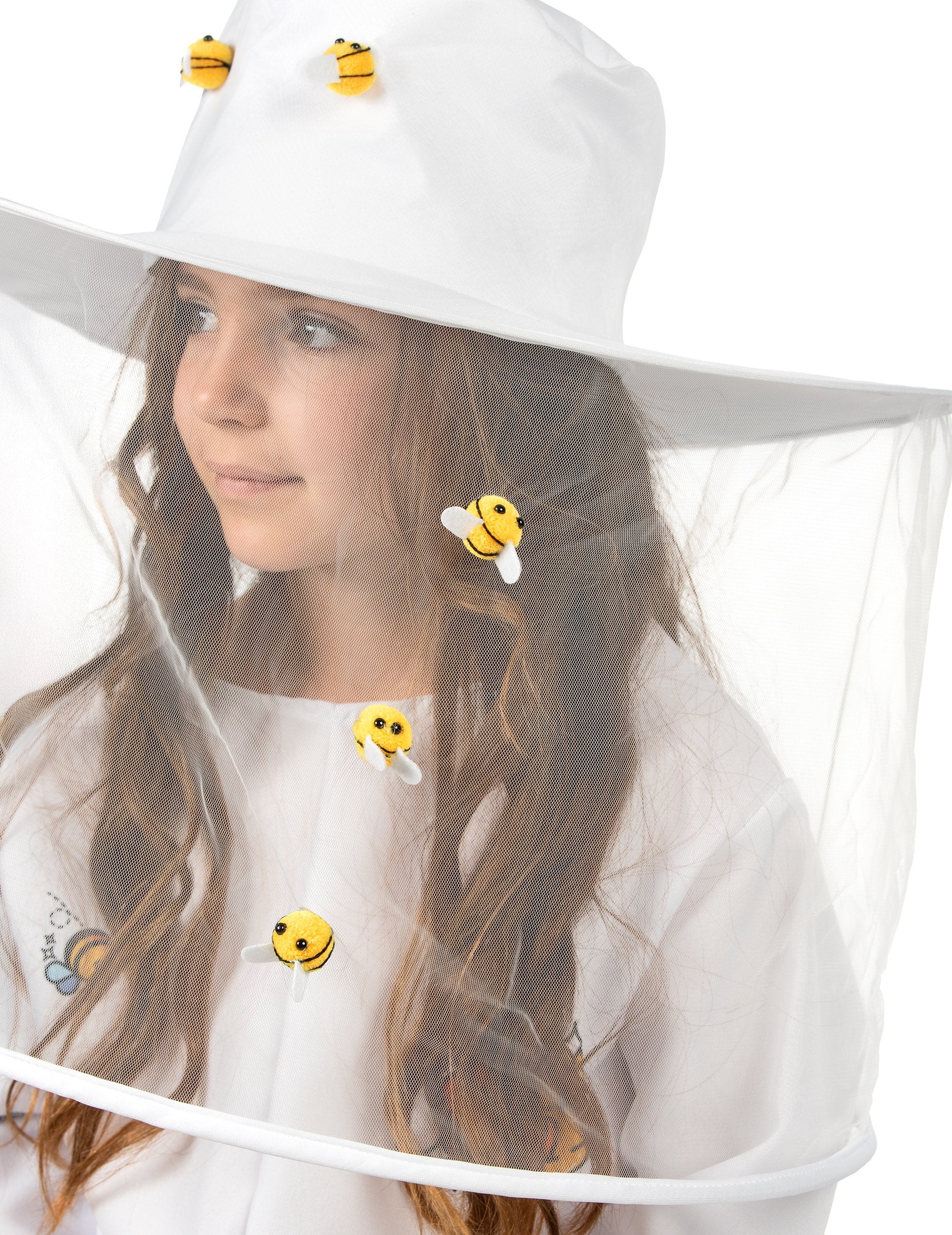 Šešir širokog oboda prekriven je prozirnim til velom, ukrašen malim pčelicama od tkanine za zabavan i realističan dojam.