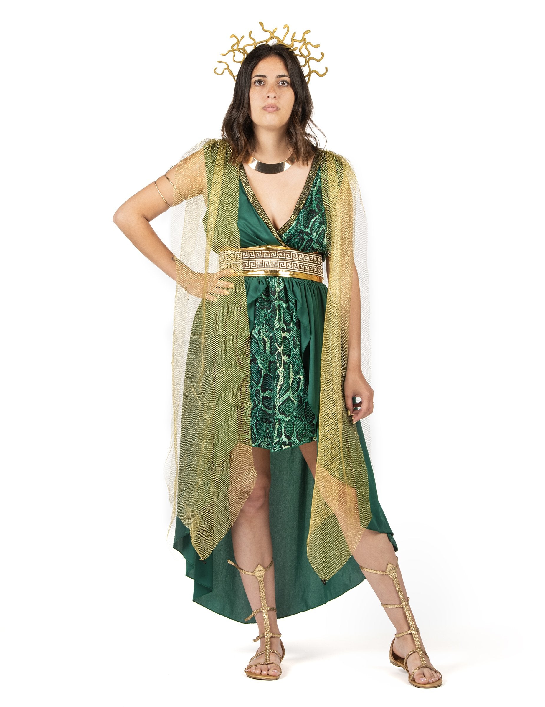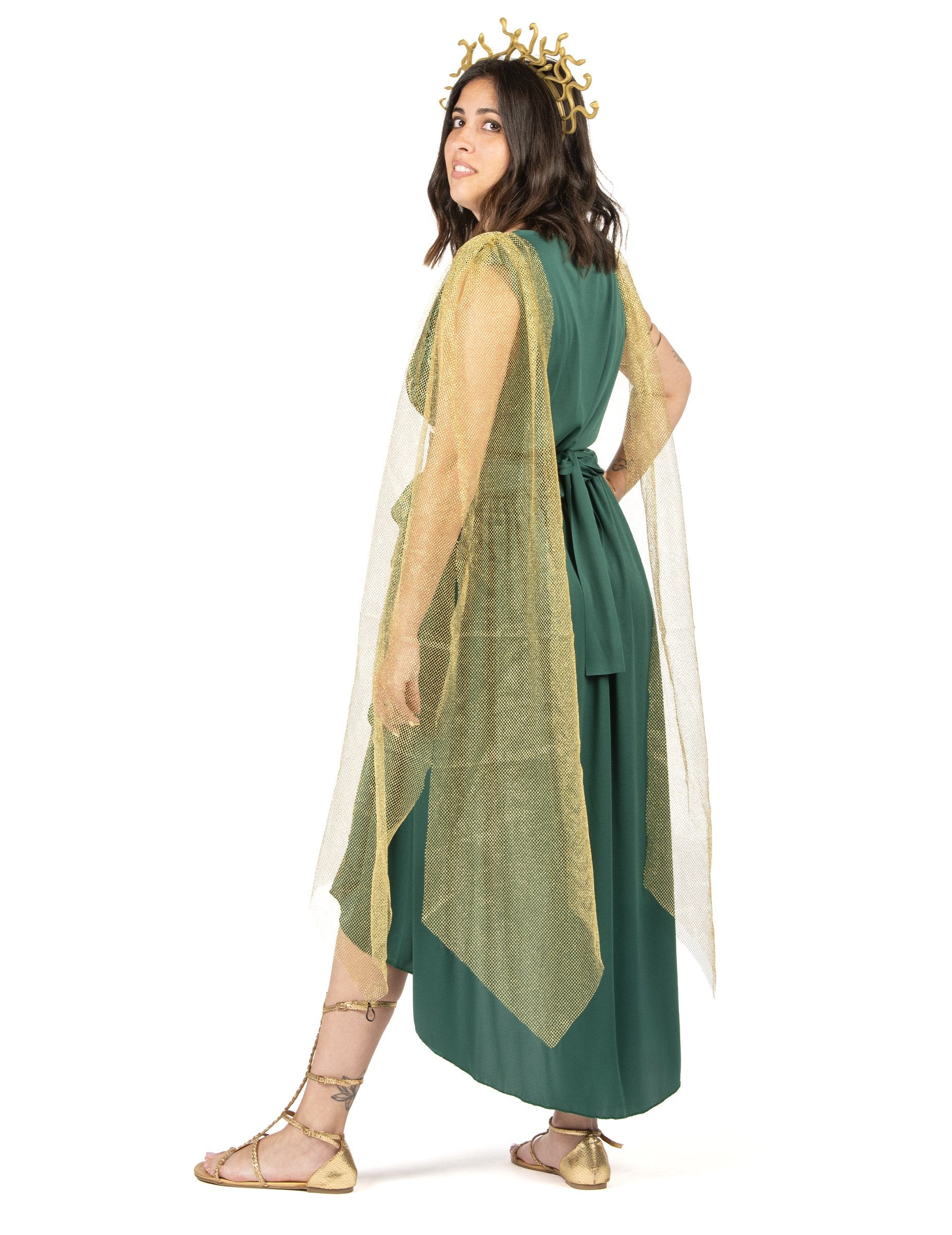 Ce déguisement de déesse Méduse pour femme comprend une robe verte fluide à effet drapé, rehaussée d’un empiècement imprimé serpent sur le devant. Une ceinture dorée à motif grec vient souligner la taille, tandis qu’une cape en tulle doré tombe délicatement sur les épaules. La tenue est complétée par une coiffe dorée en forme de serpents, rappelant la légende de Méduse, créature mythologique au regard redouté. Parfait pour une soirée d’Halloween ou un thème antique, ce costume vous transforme en figure aussi belle que dangereuse.