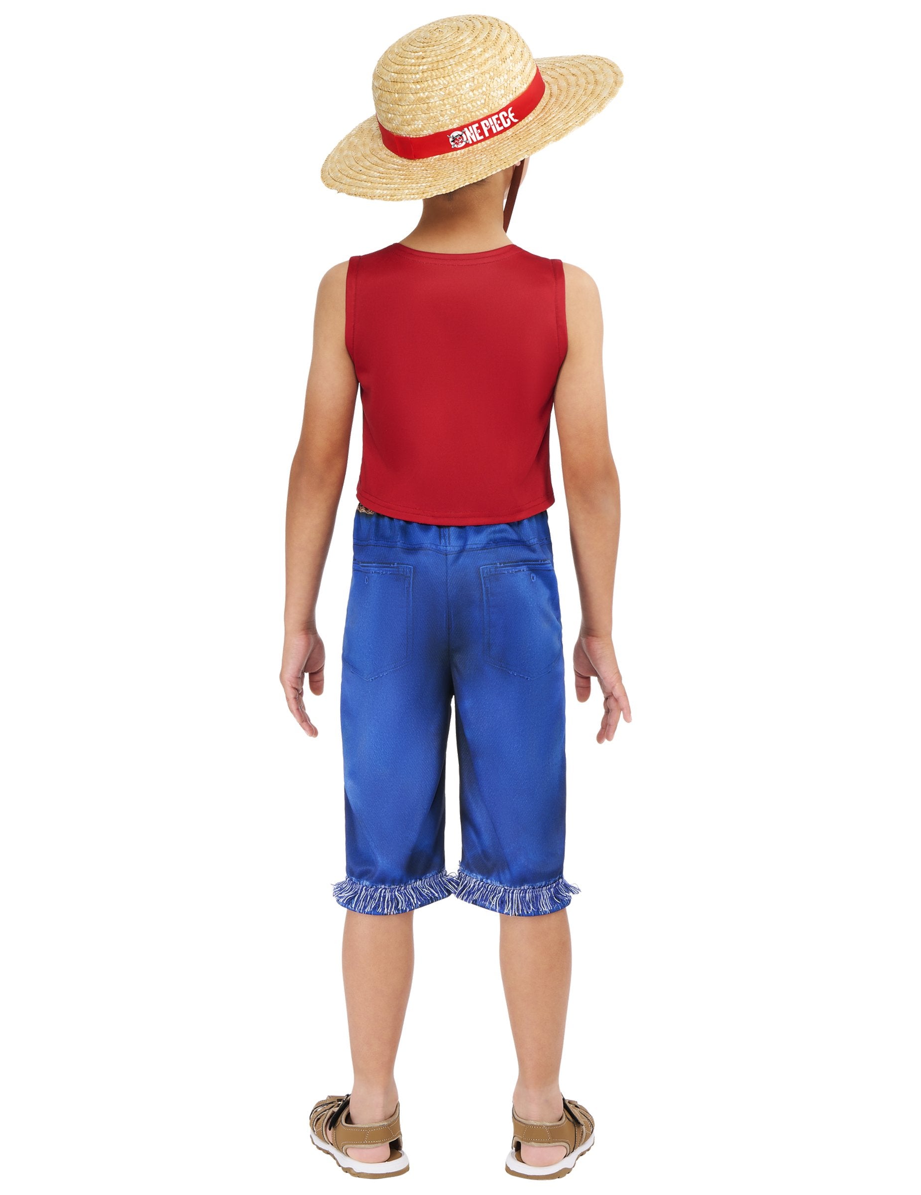 Ovaj klasični Luffy One Piece kostim za djecu sastoji se od crvenog topa bez rukava ukrašenog službenim One Piece logotipom, koji podsjeća na poznatu jaknu junaka. Plave hlače traper izgleda, ukrašene resama na dnu nogavica, savršeno upotpunjuju odjevnu kombinaciju vjernim klimanjem glavom njegovom kultnom izgledu. Neophodni slamnati šešir, također s One Piece logotipom, upotpunjuje ansambl i omogućuje djeci da u potpunosti utjelove budućeg Kralja Gusara. Idealna odjevna kombinacija za pravi spektakl na karnevalu i postati njihov omiljeni lik na jedan dan.