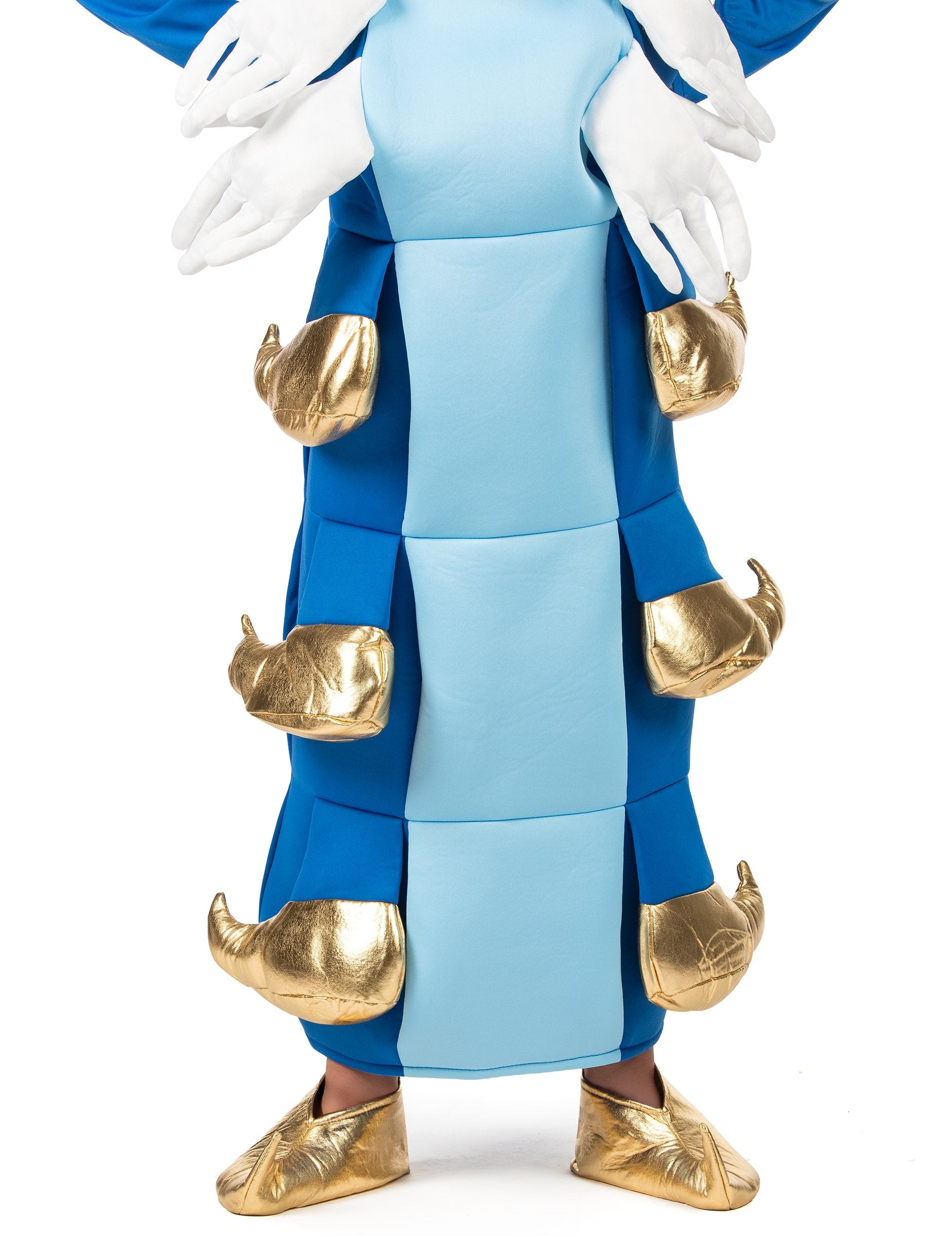 Ce déguisement de chenille bleue pour enfant se compose d’une combinaison matelassée, d’une cagoule, de gants et de surchaussures assorties. La combinaison, aux couleurs contrastées de bleu roi et bleu ciel, évoque l’aspect d’une chenille. Des mains en tissu blanc et des pattes dorées rembourrées sont cousues sur les côtés qui rappelle la célèbre chenille d'un conte merveilleux et loufoque. La cagoule bleue complète la silhouette avec une forme arrondie, rappelant la tête de la chenille, laissant le visage bien dégagé. Les gants blancs et les surchaussures dorées unifient l’ensemble pour une transformation complète. Parfait pour un carnaval, une fête costumée ou pour rejoindre un univers inspiré des contes fantastiques.