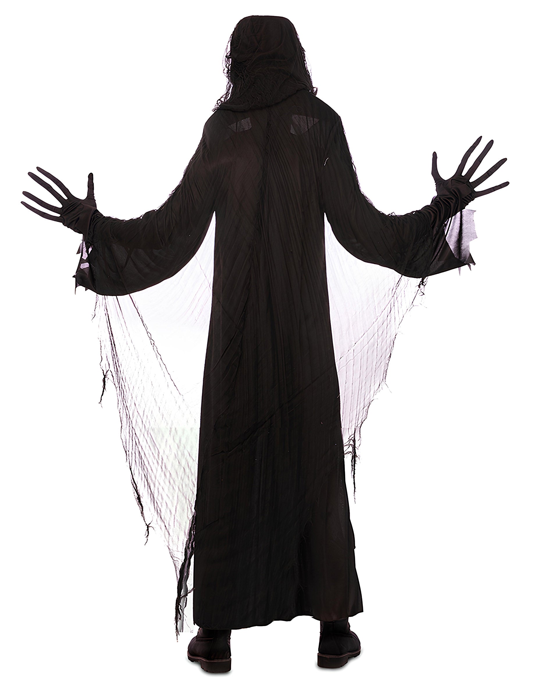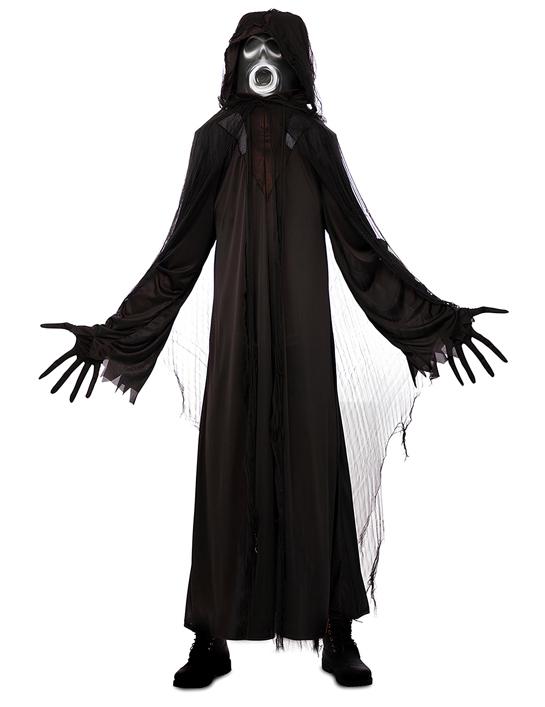 Ovaj kostim za duh odraslih sastoji se od duge crne tunike s raspuštenim rukavima, isparljivim ogrtačem s rastrganim rubovima i integriranom pokrivaču koja predstavlja sablasno lice sa širokim otvorenim ustima. Tekljiva tunika spušta se na noge i daje izduženi i uznemirujući izgled. Konusni velovi pokrivaju ramena i ruke, naglašavajući učinak ukazanja. Nasklopca tvori masku za grimasu sa srebrnom tenom. Savršeno za proganjanje dvorana u Noć vještica, ovaj kostim oživljava biće iz drugog svijeta.